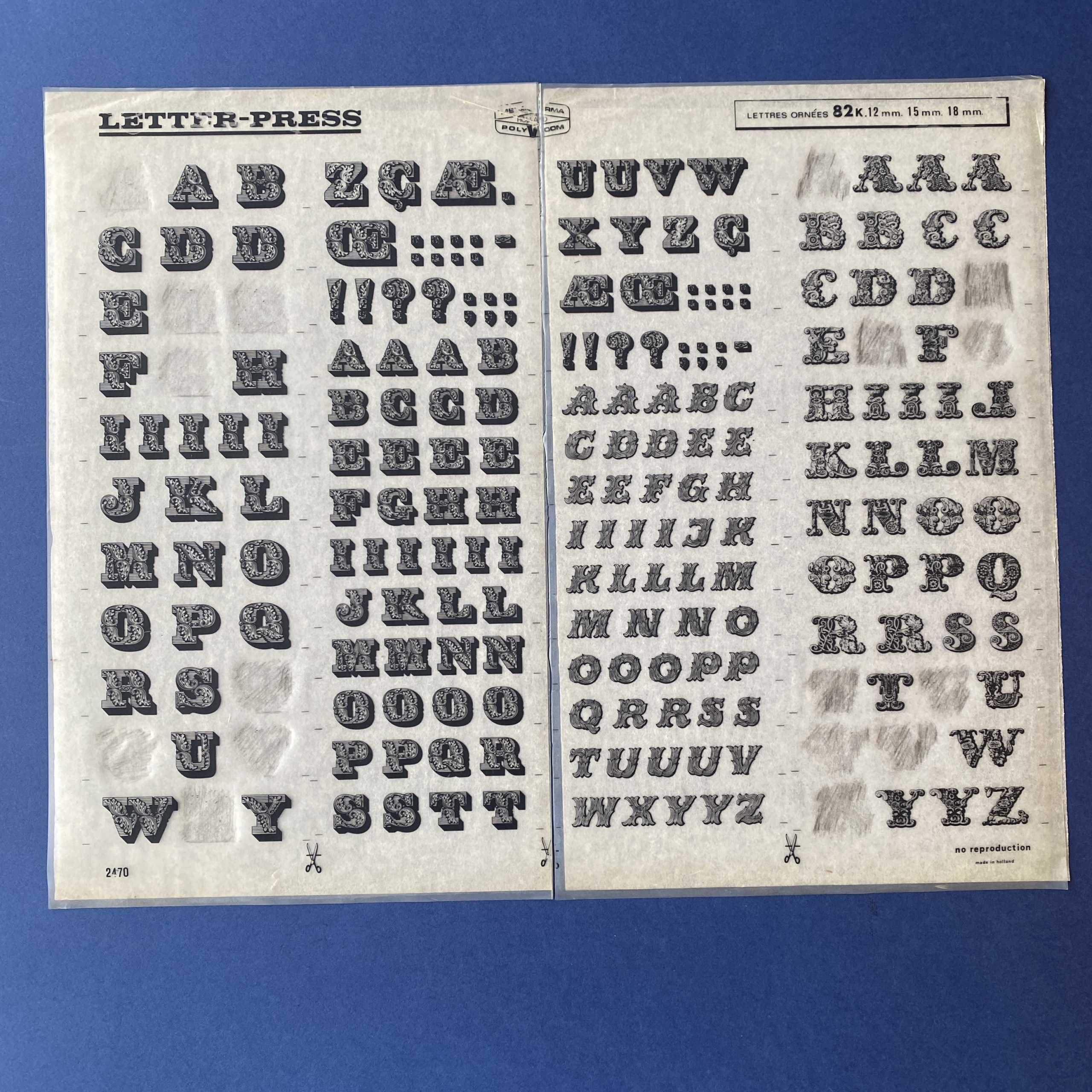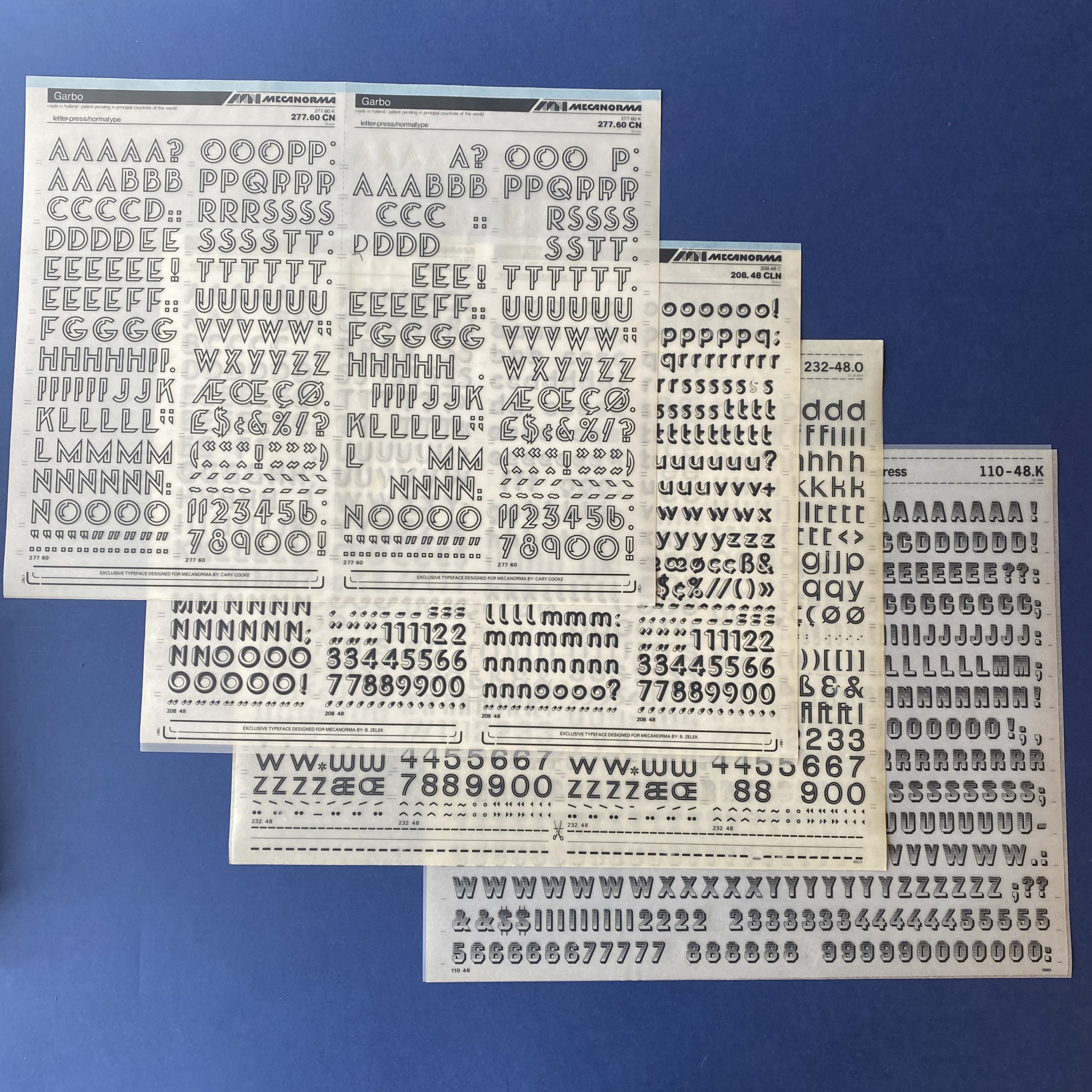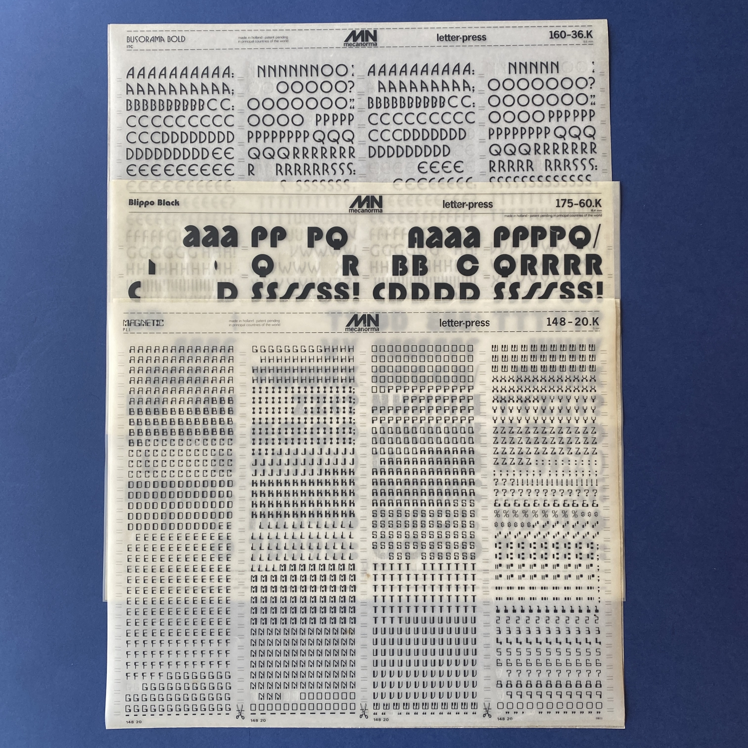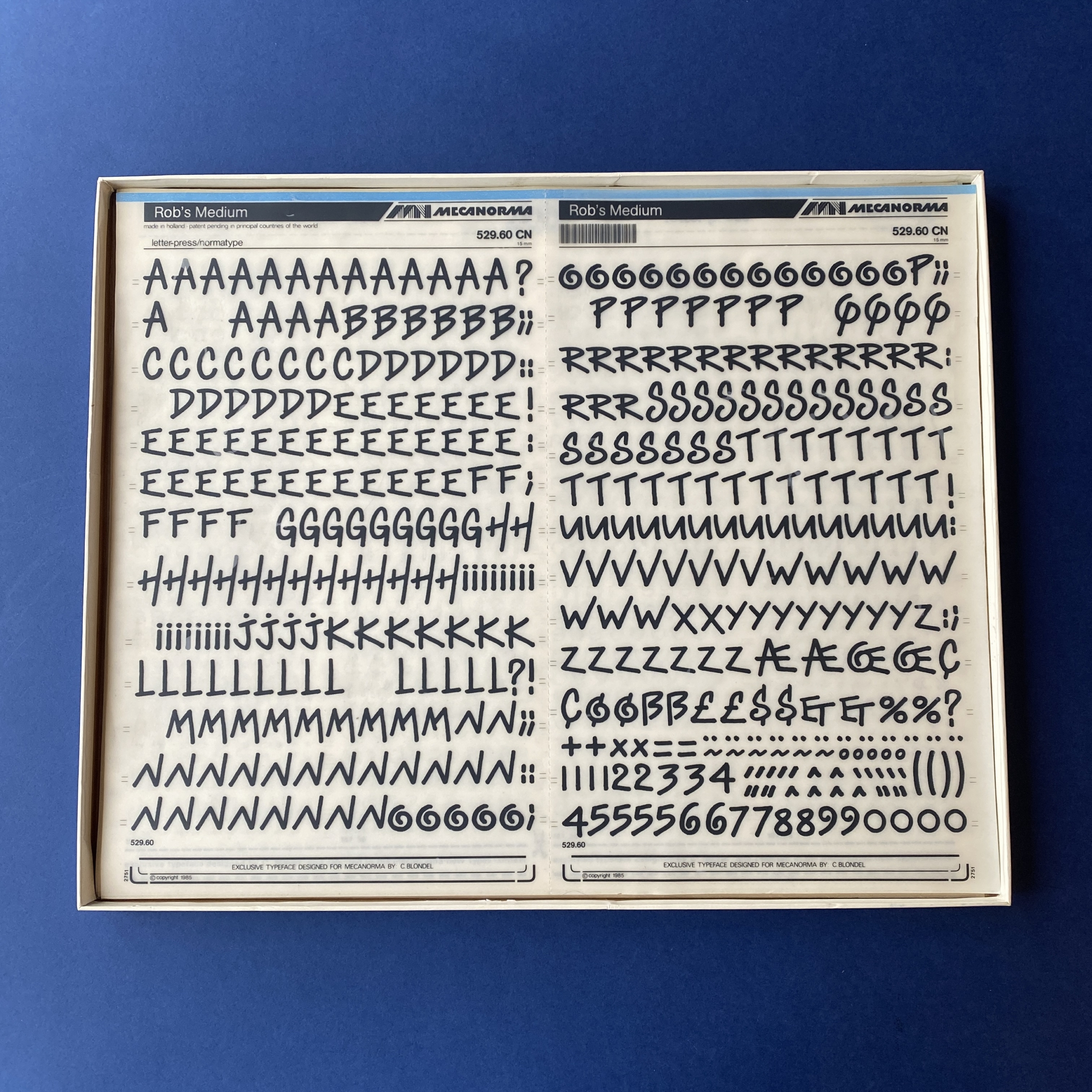 Mecanorma box of 16 sheets: Magnetic, Blippo, Garbo, Zelek Shadline, Fedelio, Art Script, Robb’s, Film, Jim Crow, Wiegand’s Renaissance.