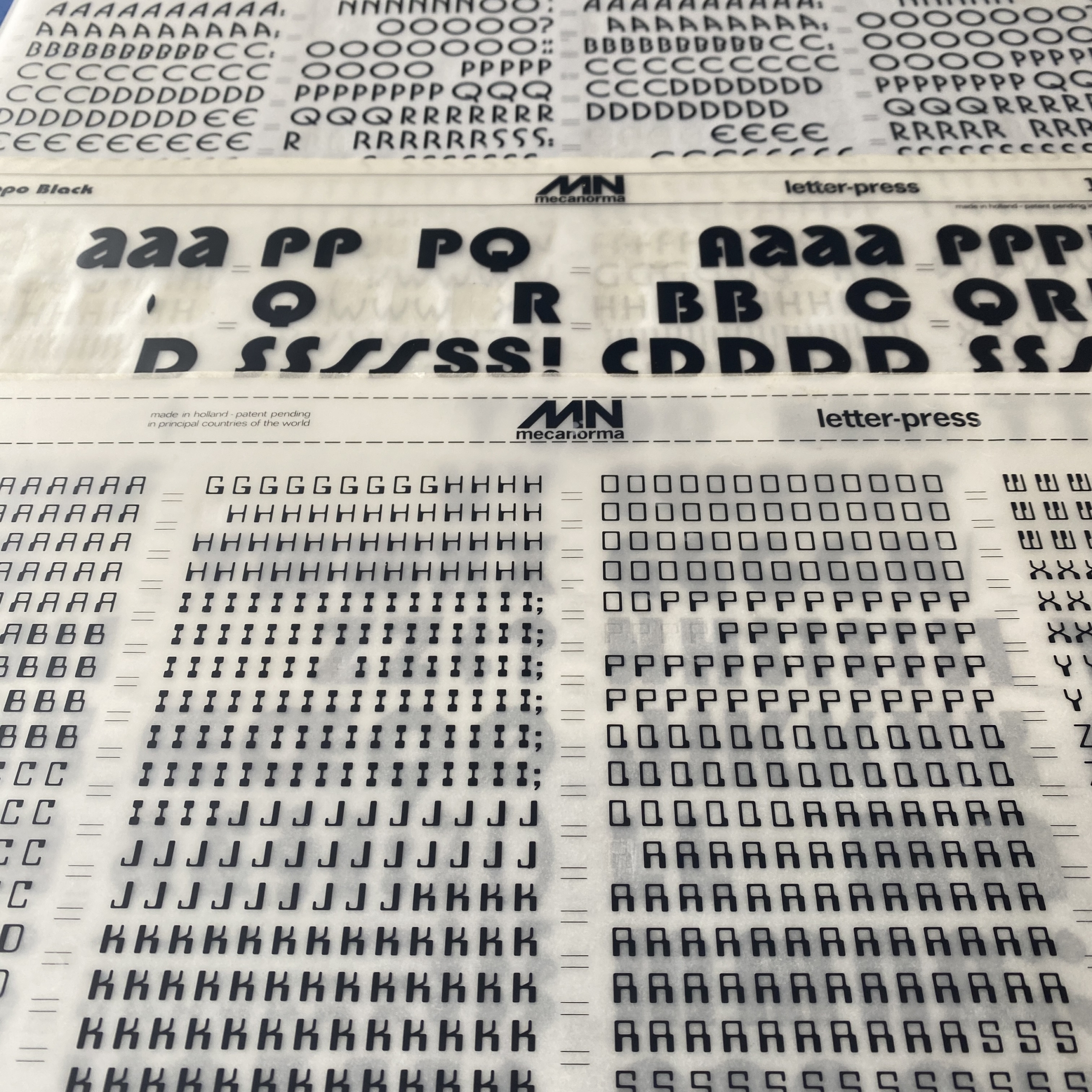 Transfer typeface sheets used by graphic designers for page layout before the advent of computers and PAO software. The Letraset brand is the best-known on the market, but other brands such as Mecanorma or Decadry also exist.