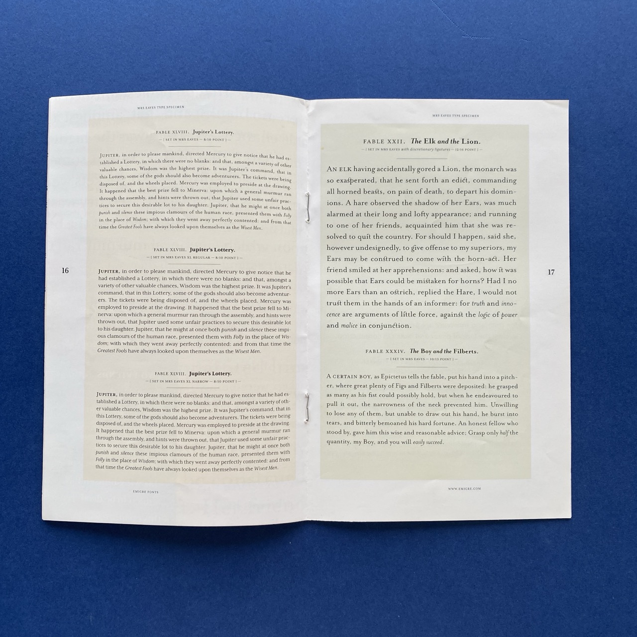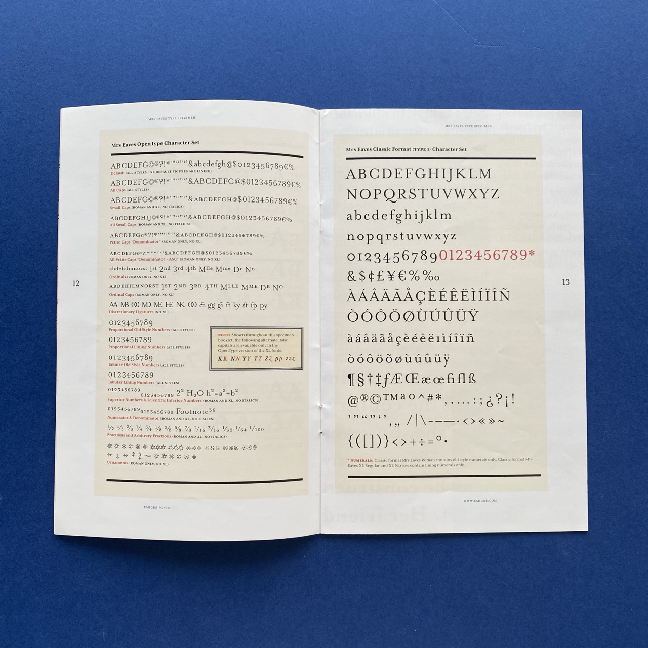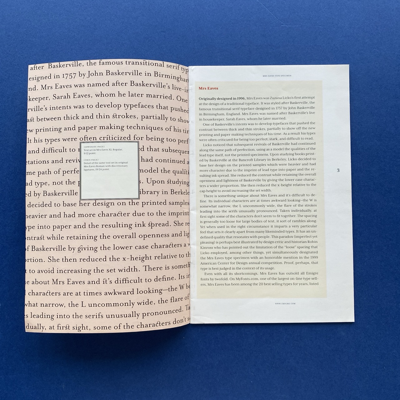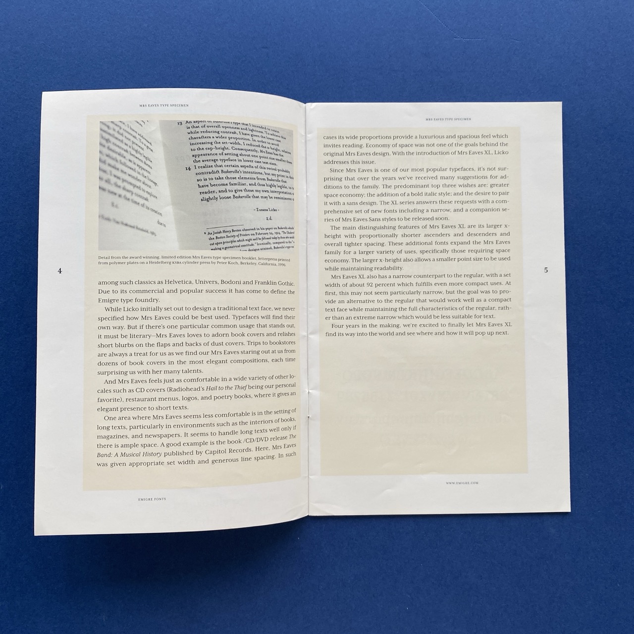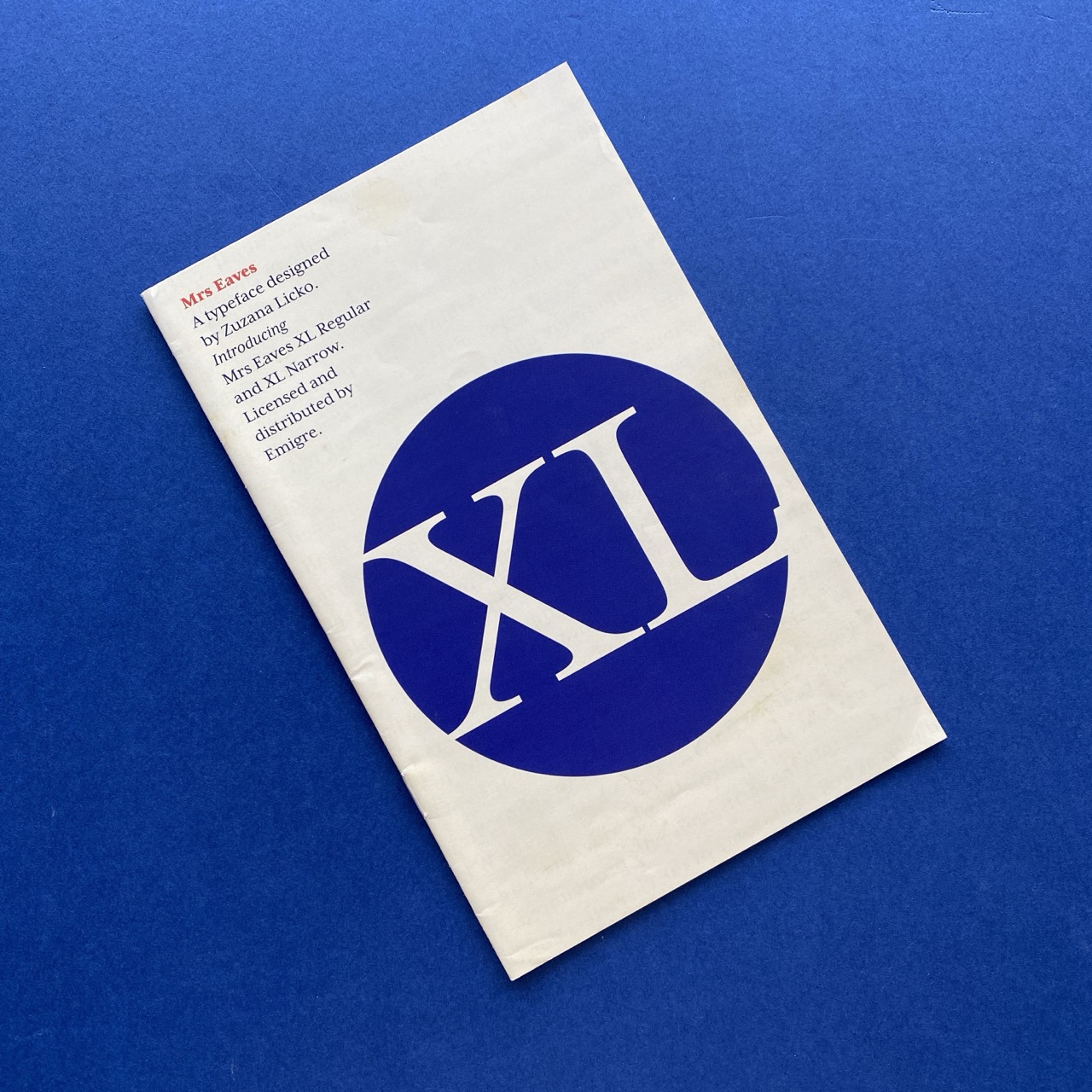 Mrs Eaves XL, A typeface designed by Zuzana Licko introducing Mrs Eaves XL Regular and XL Narrow. Berkeley, Emigre, 2009, 13,4 x 21 cm, 1996, 24 pp.