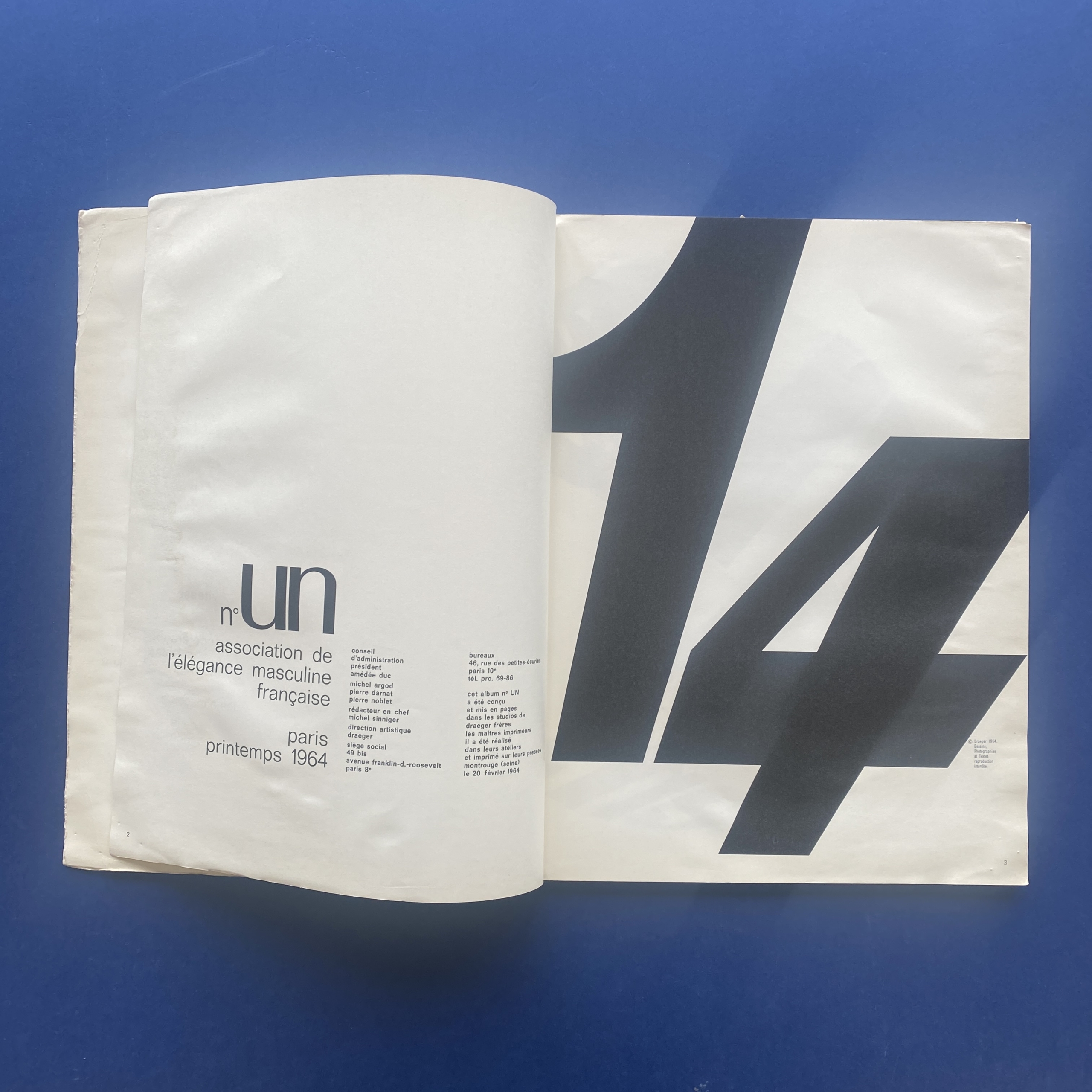 N° Un, spring 1964, Paris,Association de l’élégance masculine française, Montrouge, Draeger Frères, 1957-1967, 26 x 35 cm.