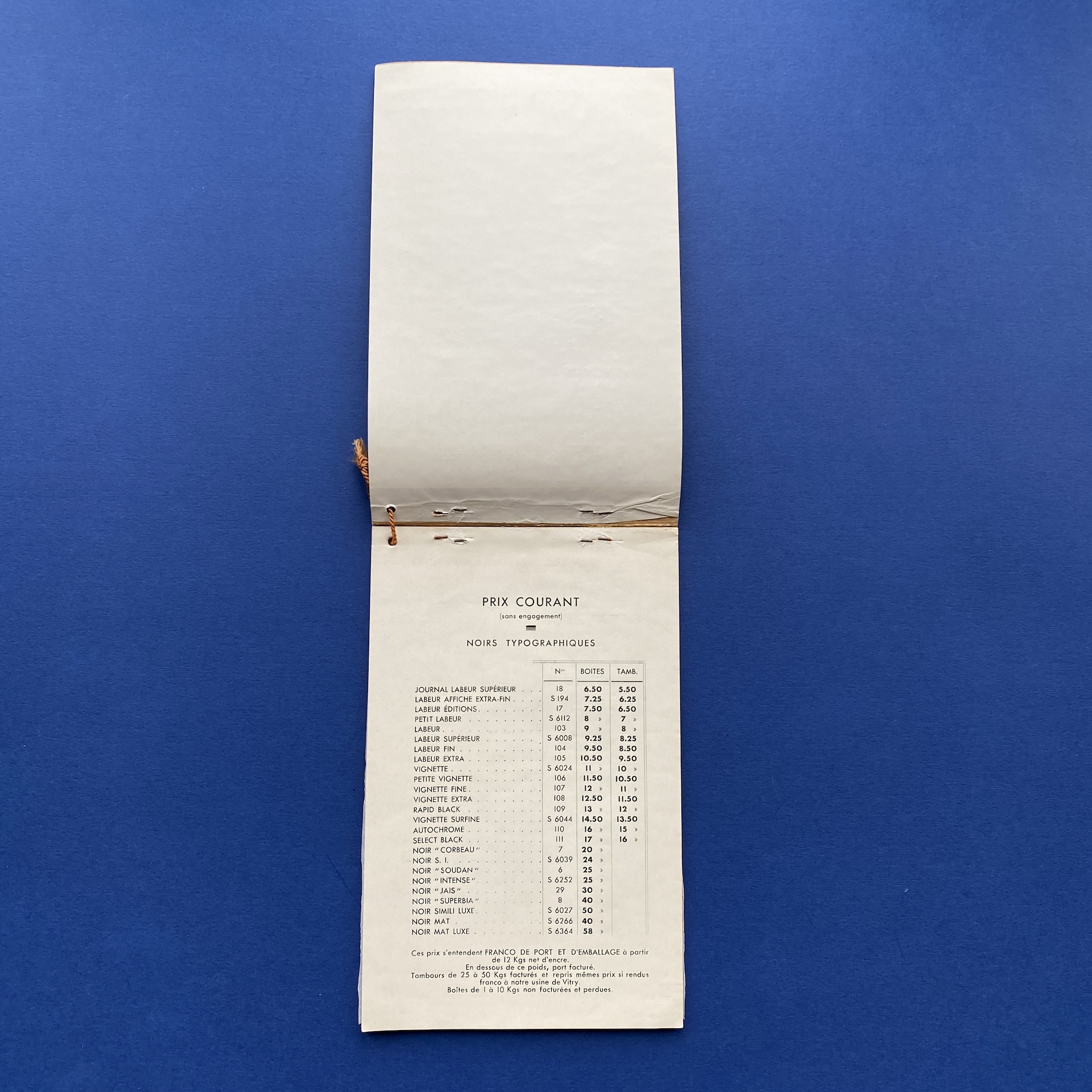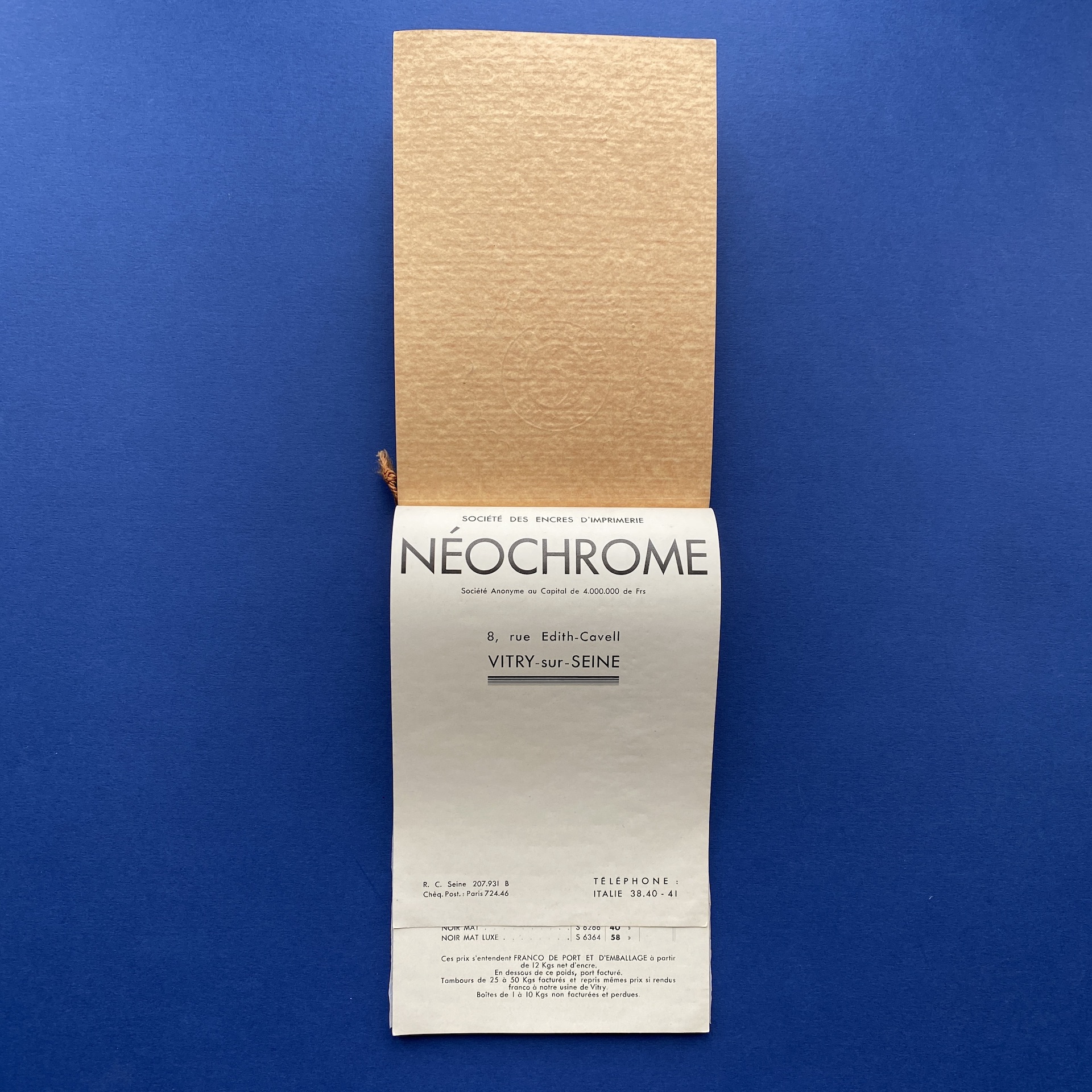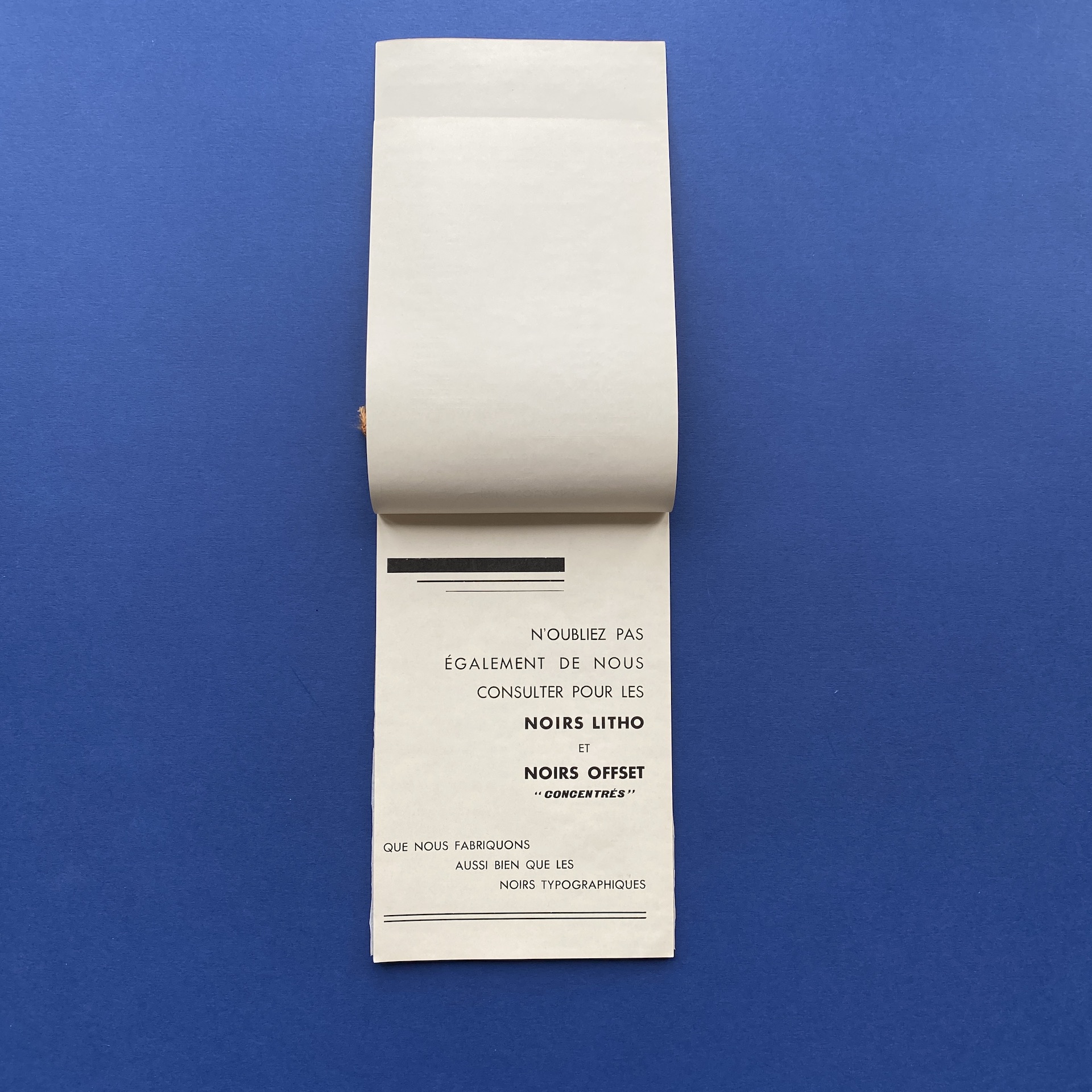 Noirs typographiques, Neochrome inks, Tours, Arrault, Louis Muller et Fils, n.d., 13,5 x 20,5 cm, not paginated. Ink catalogue in very gorgeous condition.