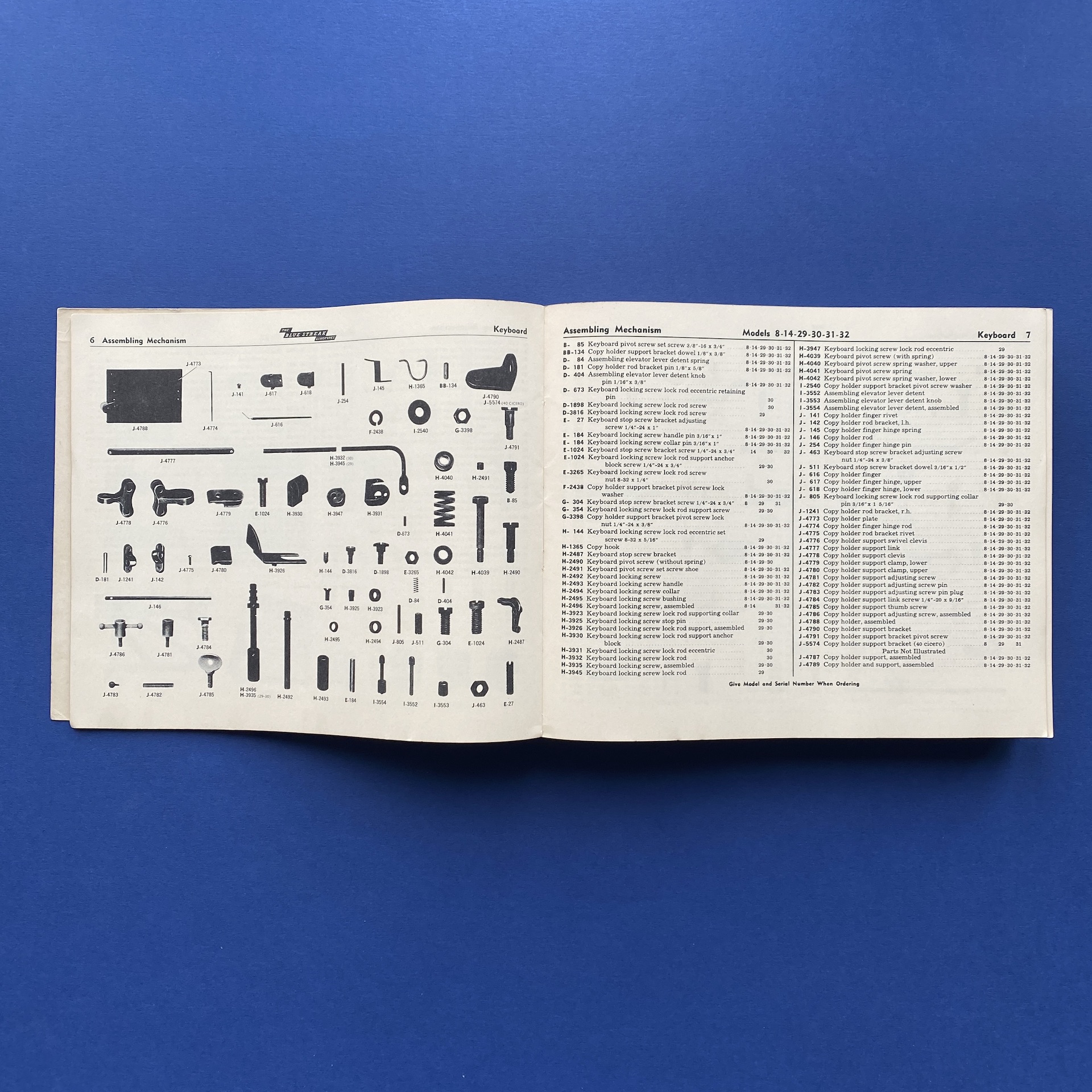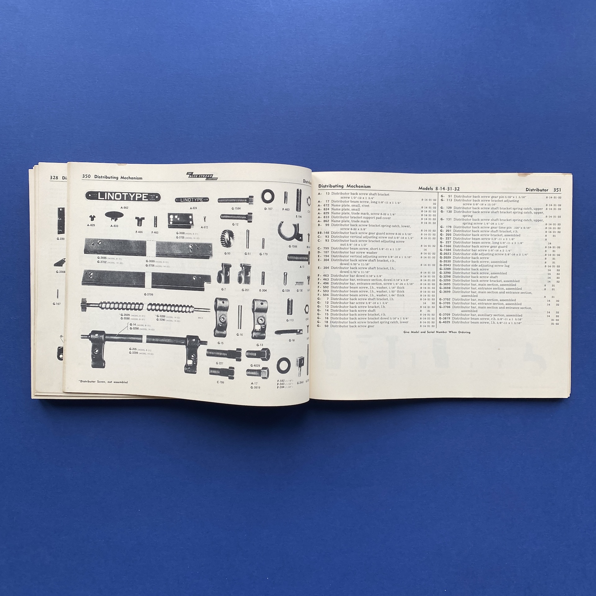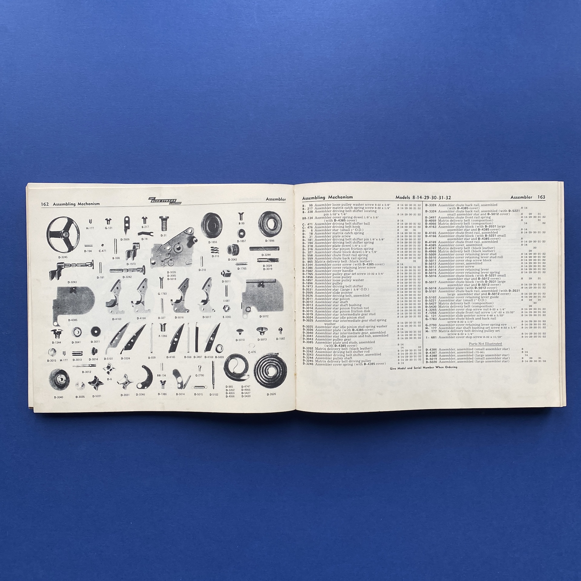 Parts Catalog for blue streak Linotypes, New York, 1940, Mergenthaler Linotype Company, 25 x 21 cm, 459 pp. Some signs of wear on the front cover. Copy in good general condition
