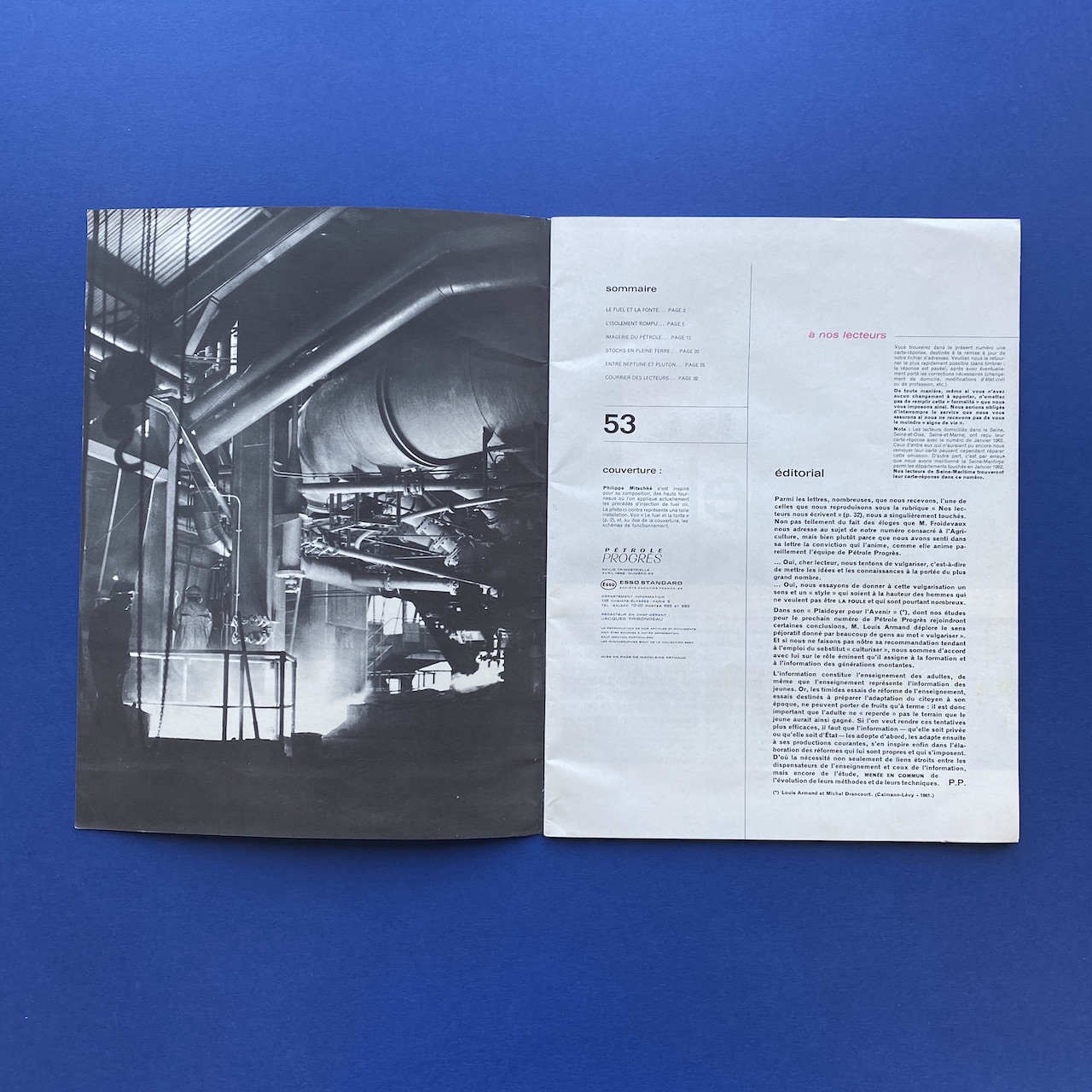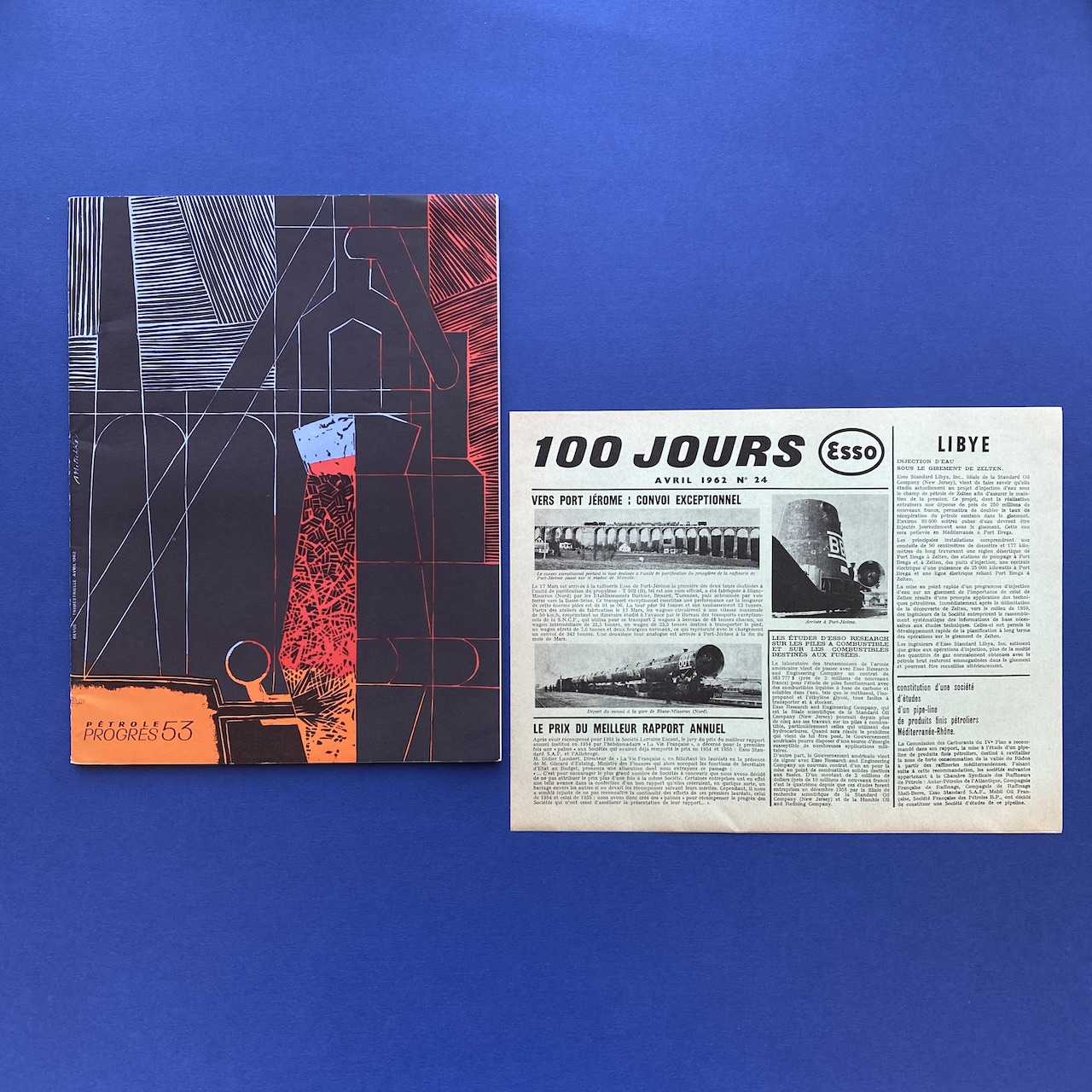 Pétrole Progrès #53, April 1962, Esso Standard, 23,5 x 31 cm, 32 pp. Front cover by P. Mtschké. Magazine in very condition. Insert: ‘100 jours Avril 1962 n°24’.
