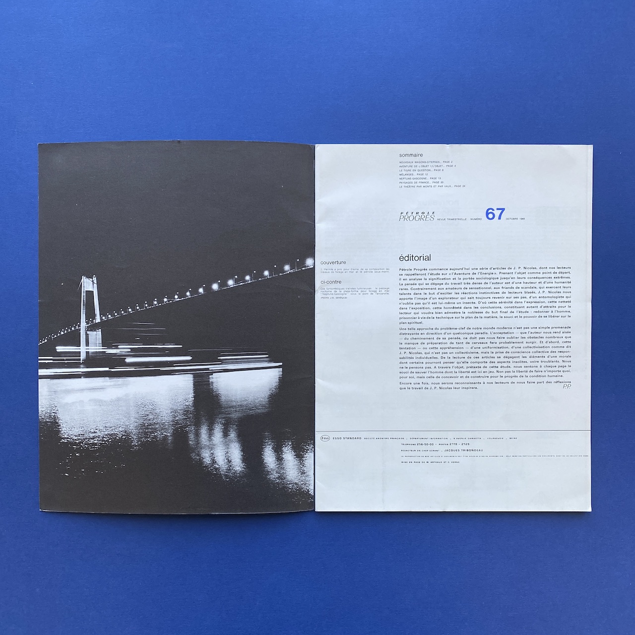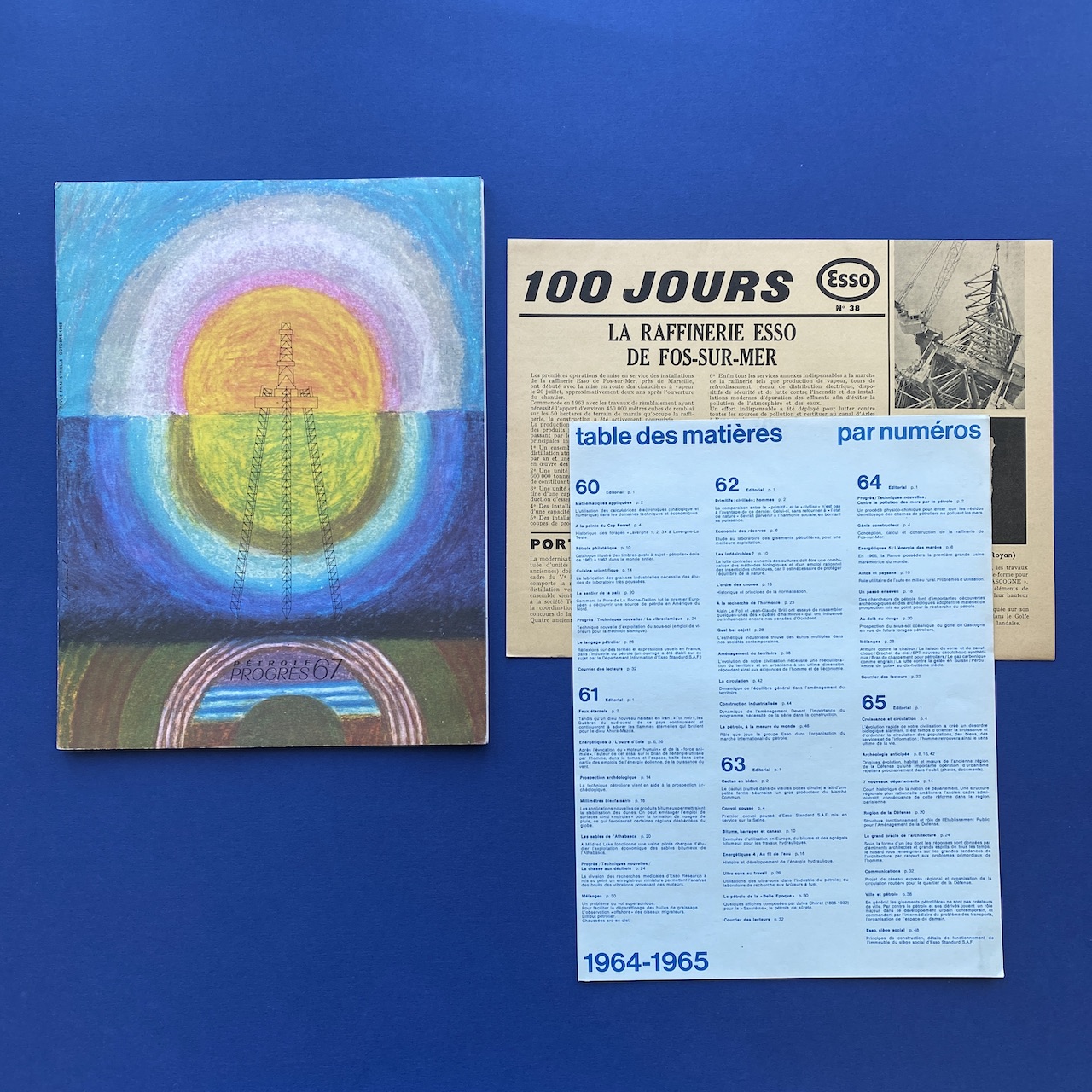 Pétrole Progrès #67, October 1965, Esso Standard, 23,5 x 31 cm, 32 pp. Front cover by J. Hermle. Magazine in very good condition. Two inserts: ‘100 jours la raffinerie Esso de Fos-sur-mer’ and ‘Table des matière par numéros’.