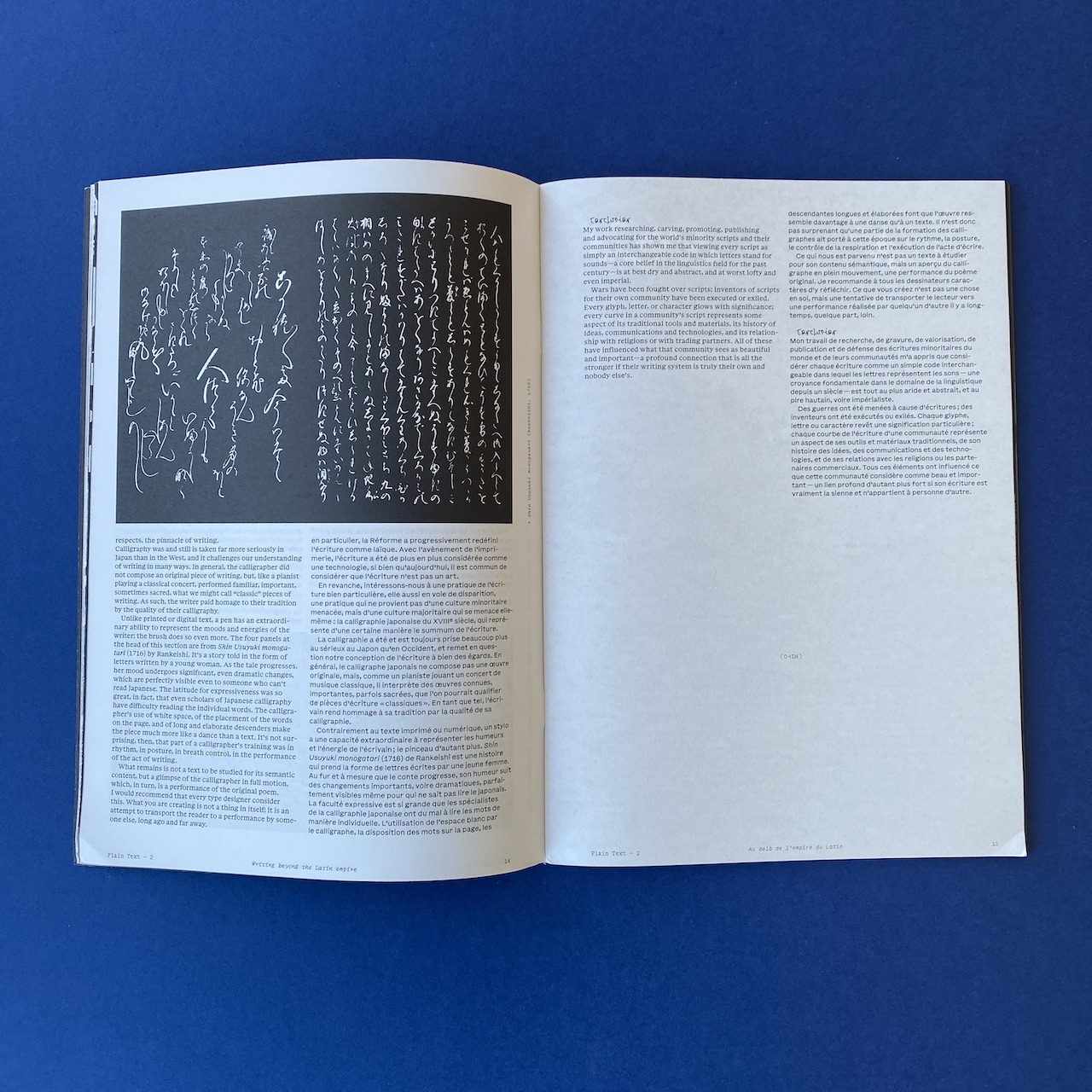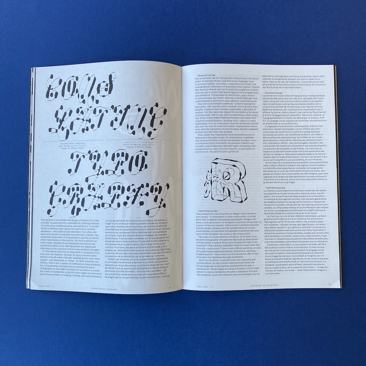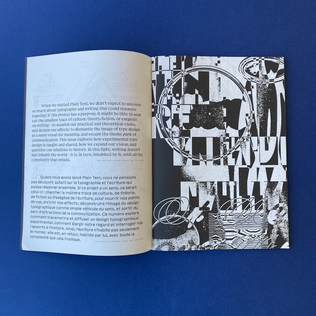 “De la fiction à la théorie, d’analyses mystiques à des propositions purement visuelles, Plain Text se propose d’explorer les imaginaires typographiques en dépassant un cadre strictement historique et technique, avec un attrait pour le potentiel dormant de l’écriture. Ce second numéro de Plain Text contient des publications de :