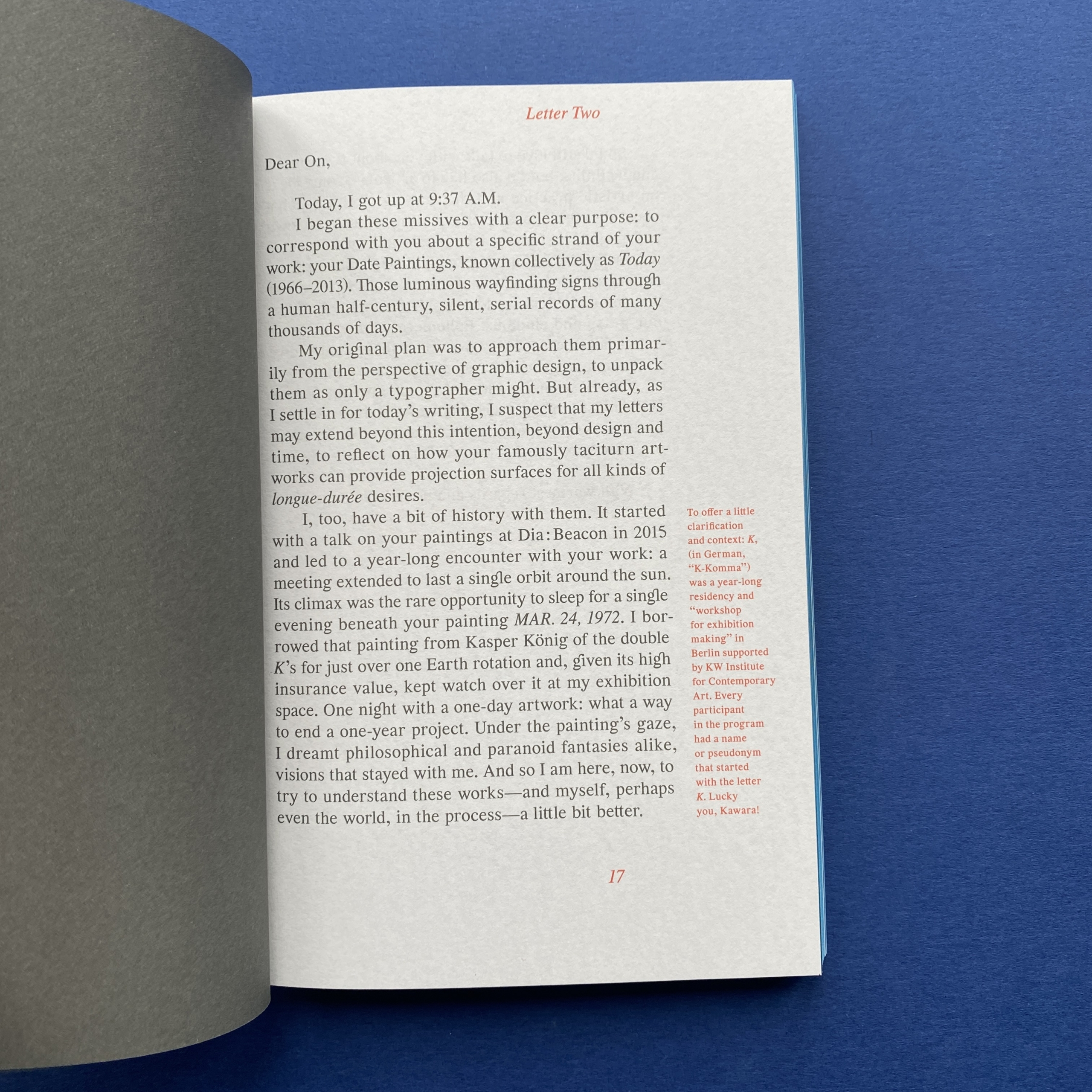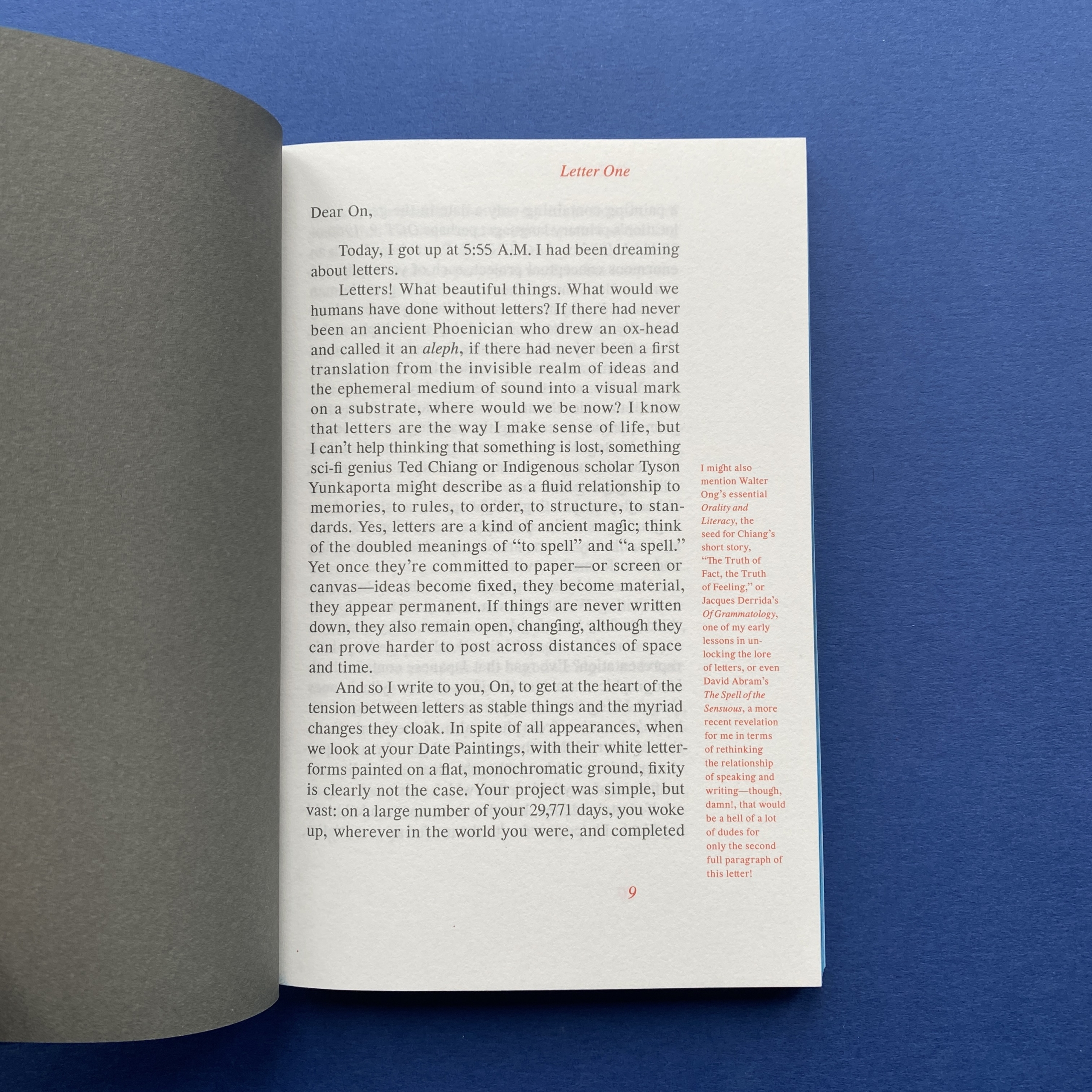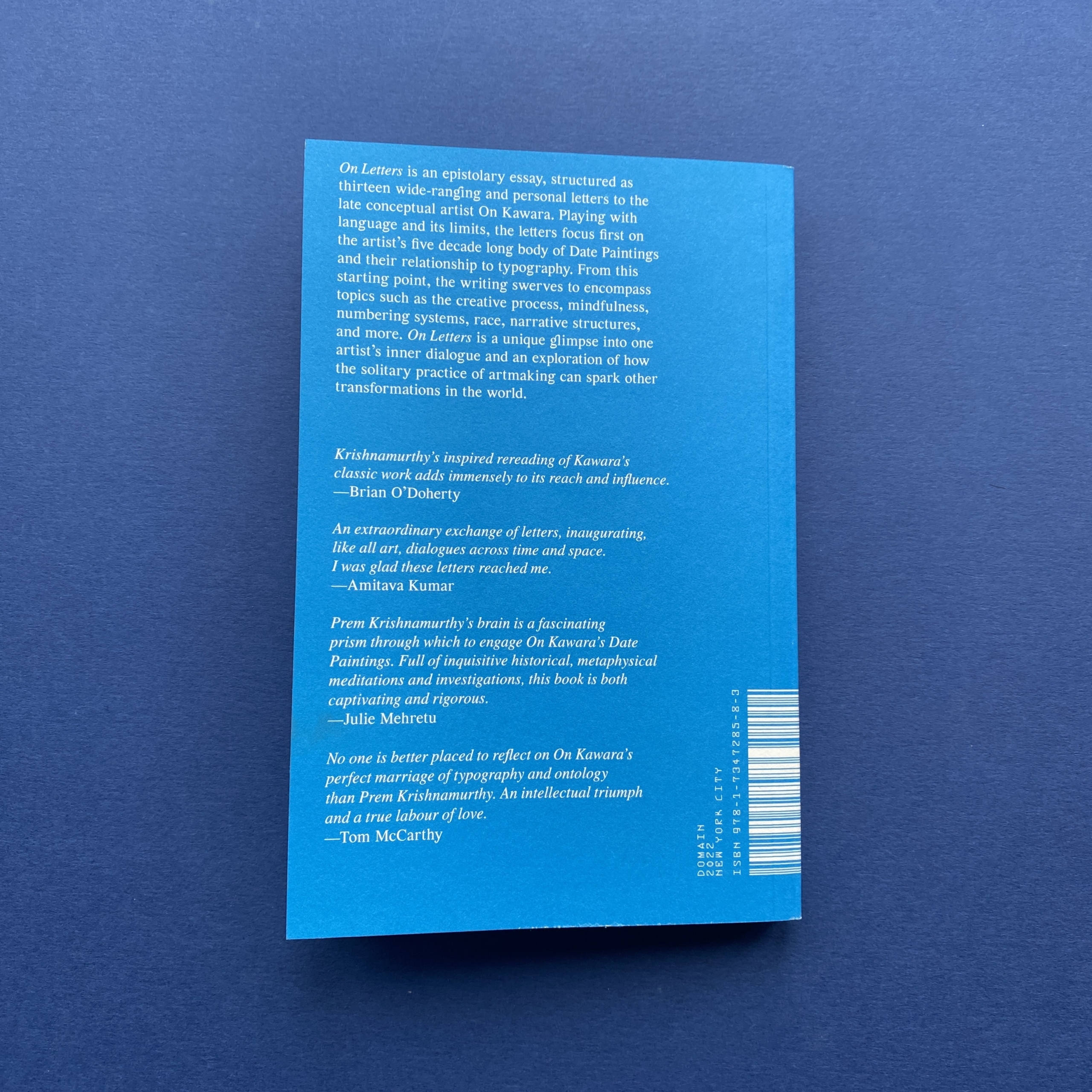On Letters is an epistolary essay, in thirteen letters to the late conceptual artist On Kawara, Krishnamurthy analyses the “Date Paintings” series and their relationship to typography.