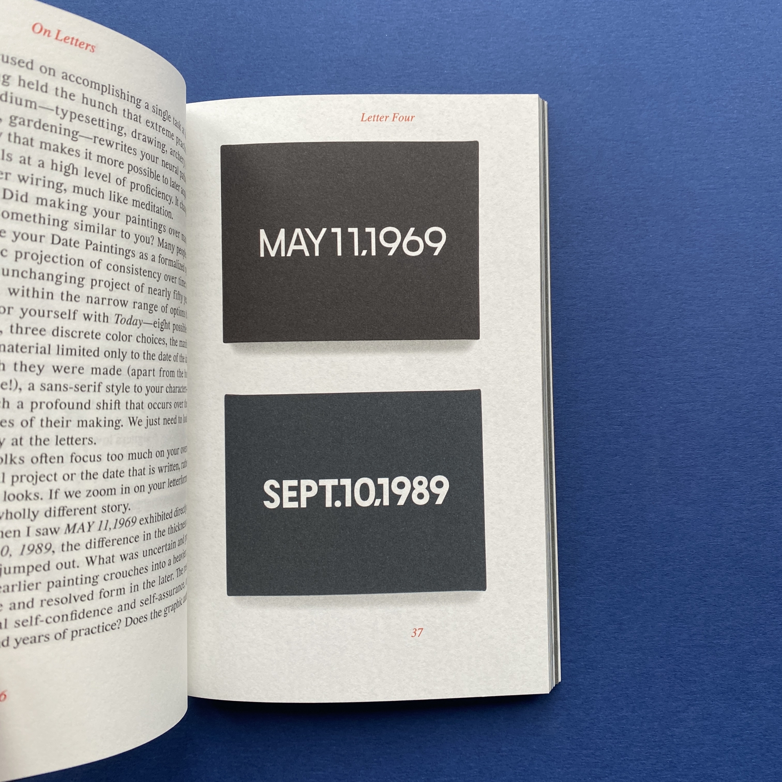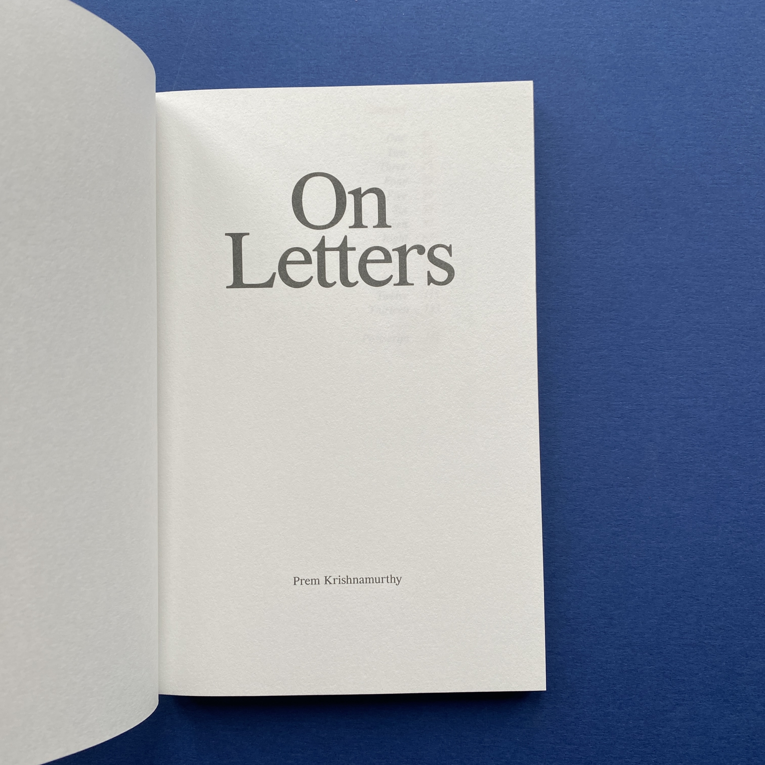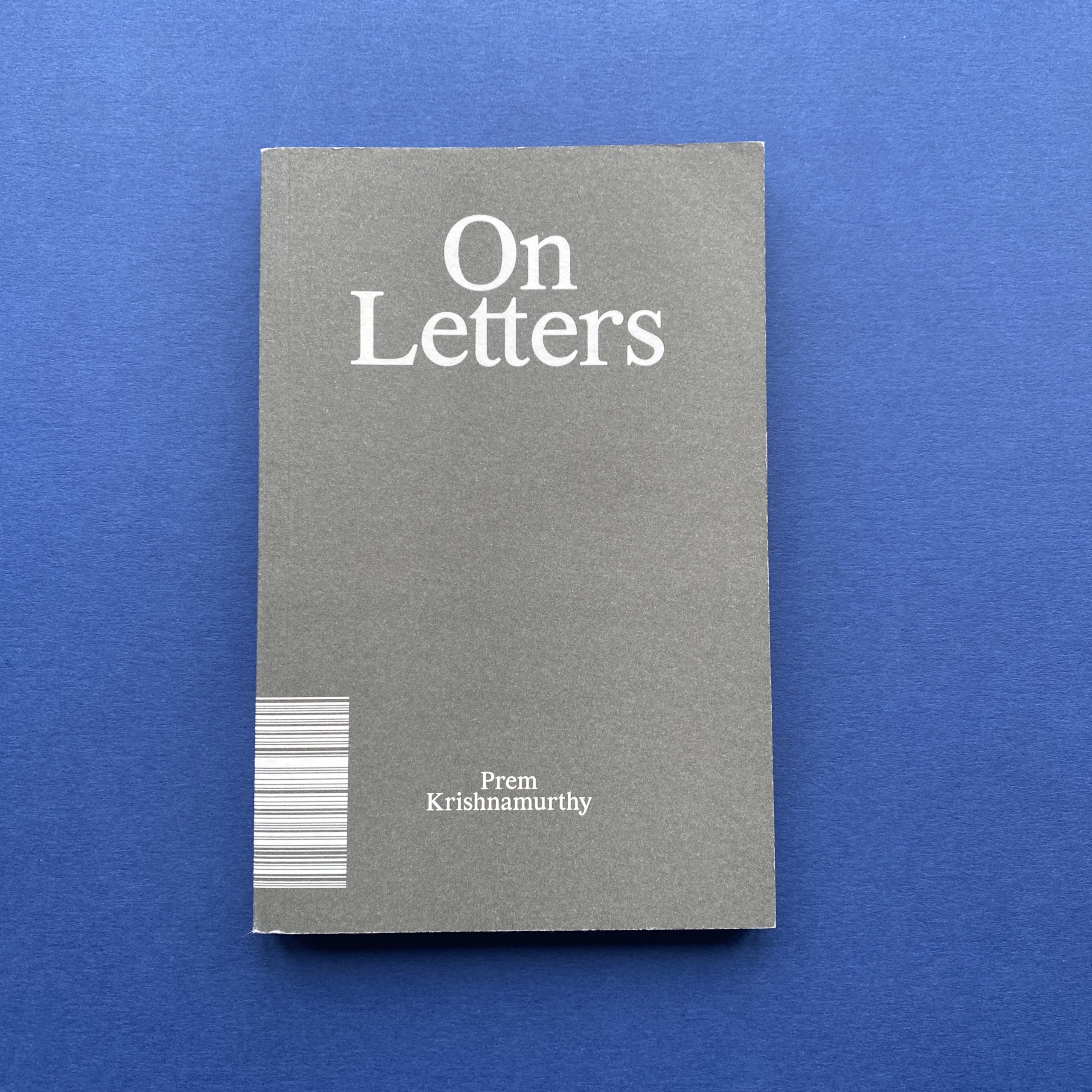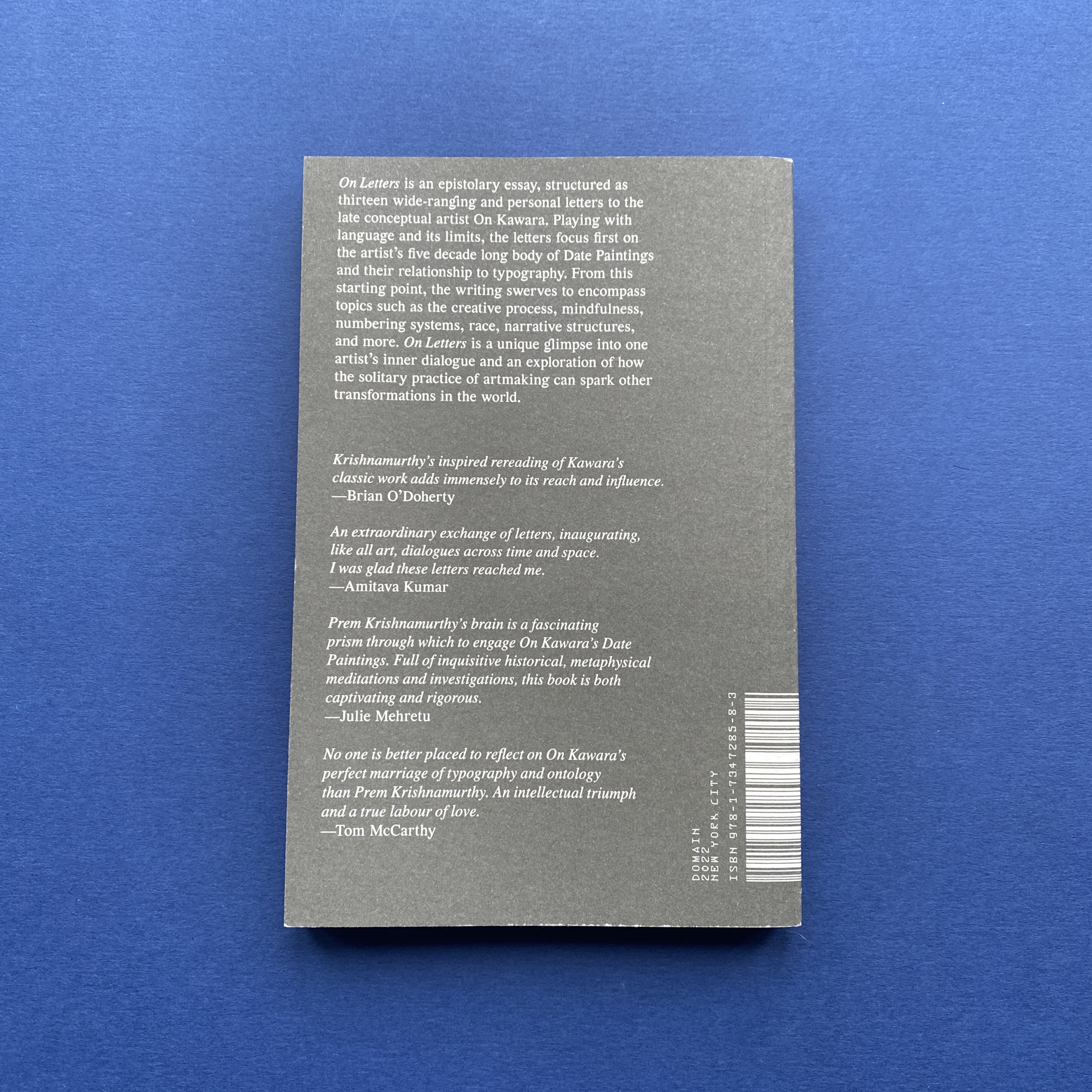 On Letters is an epistolary essay, in thirteen letters to the late conceptual artist On Kawara, Krishnamurthy analyses the “Date Paintings” series and their relationship to typography.