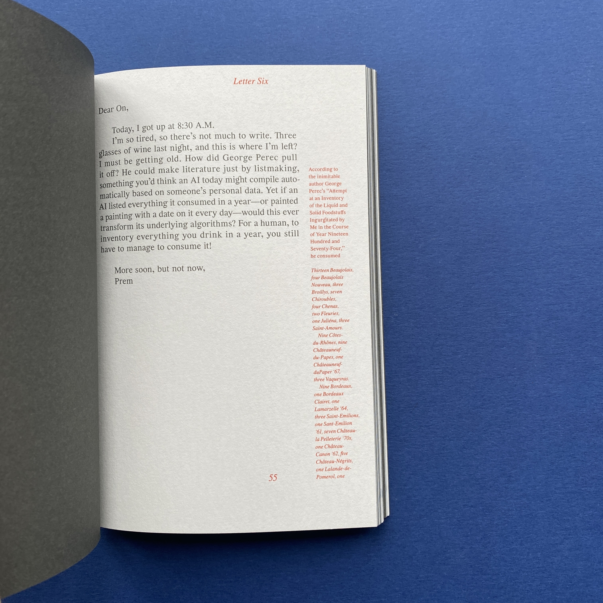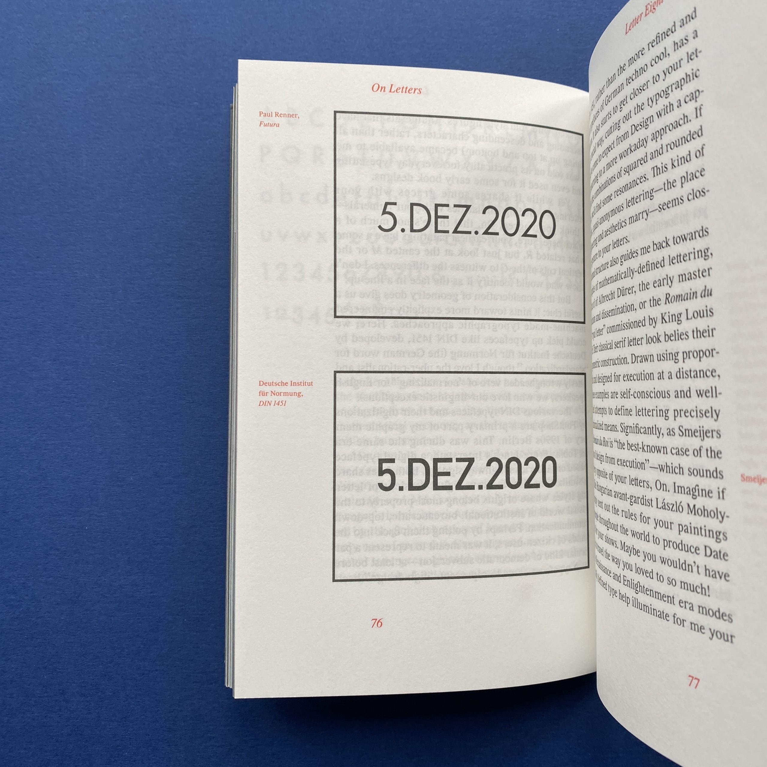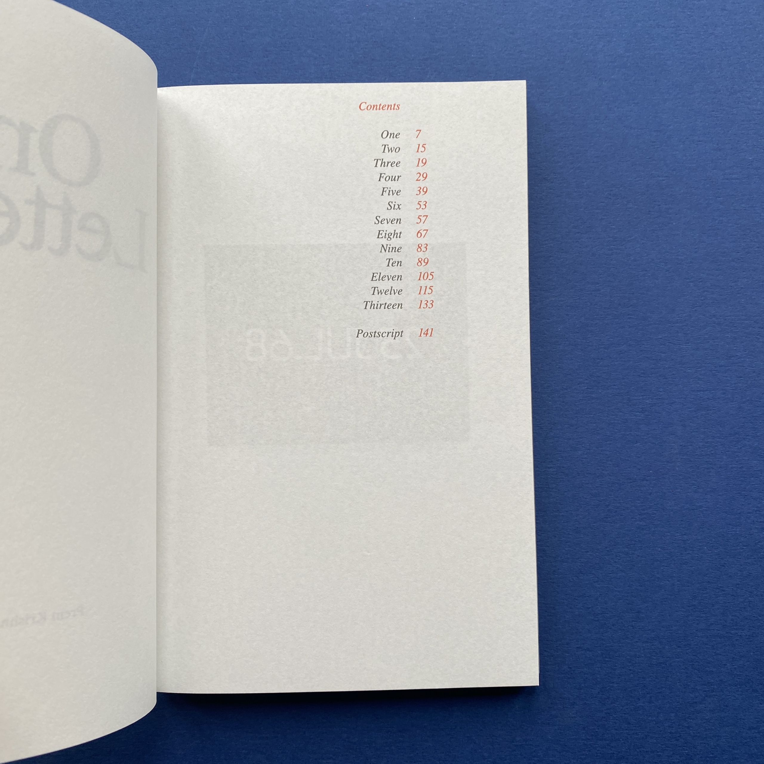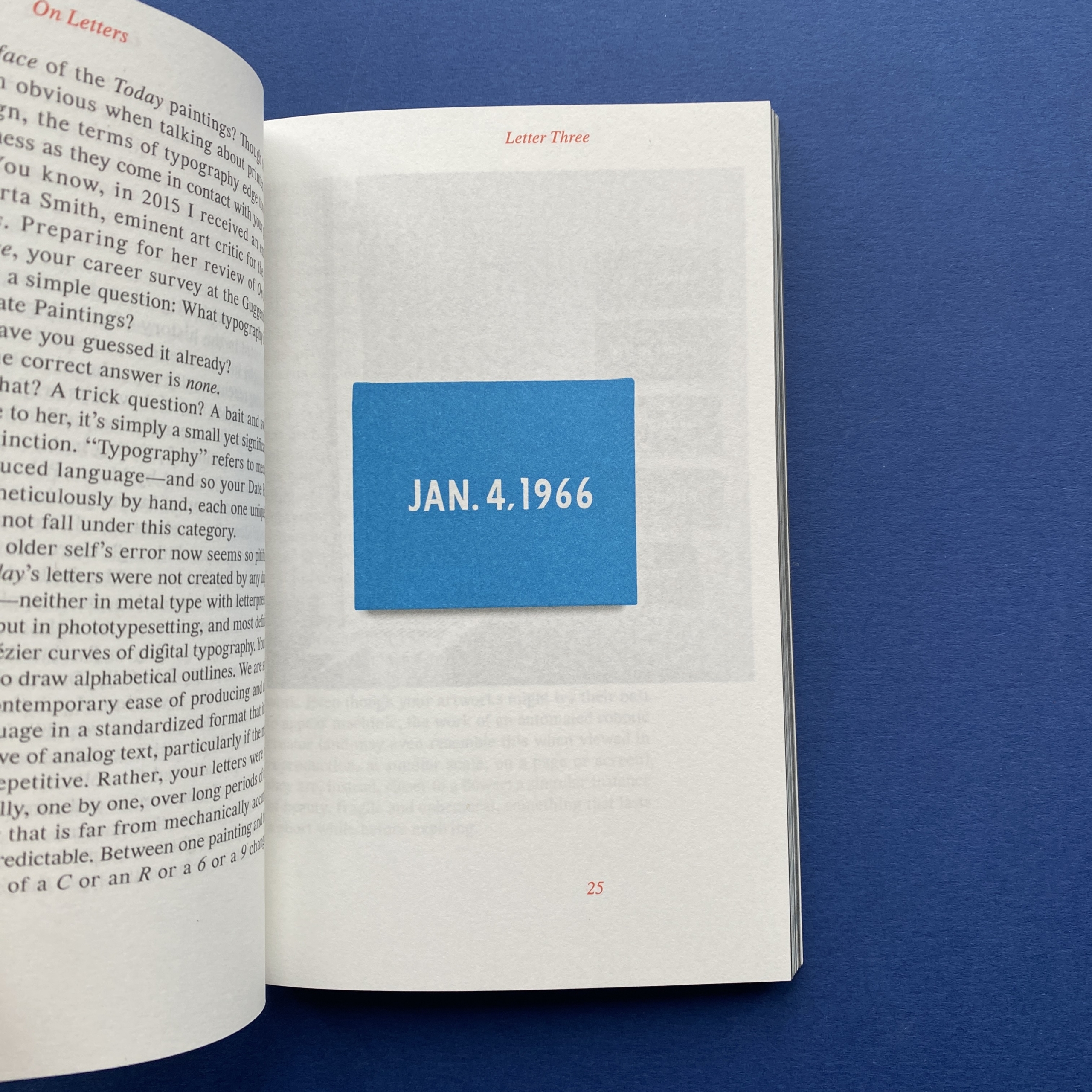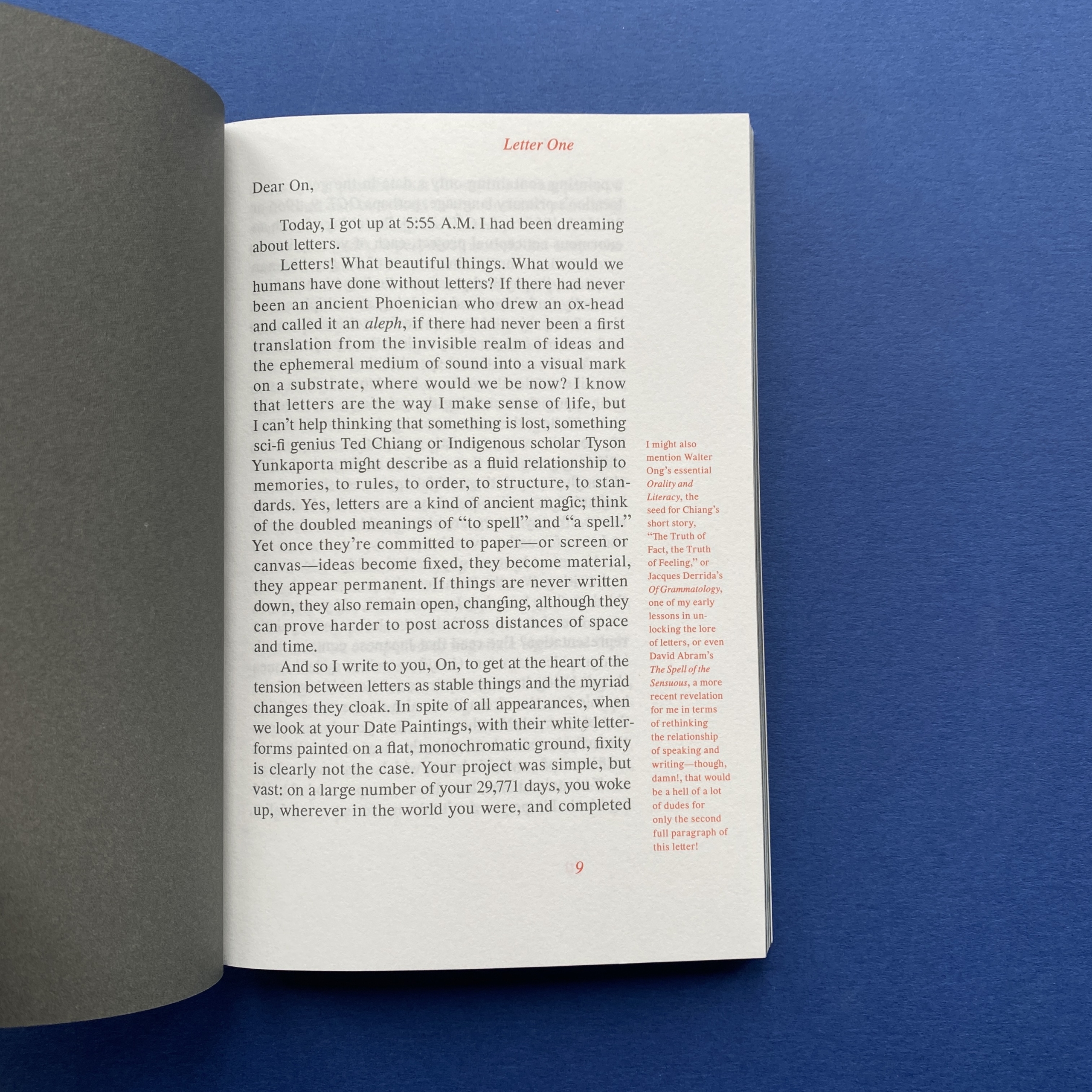 On Letters is an epistolary essay, in thirteen letters to the late conceptual artist On Kawara, Krishnamurthy analyses the “Date Paintings” series and their relationship to typography.