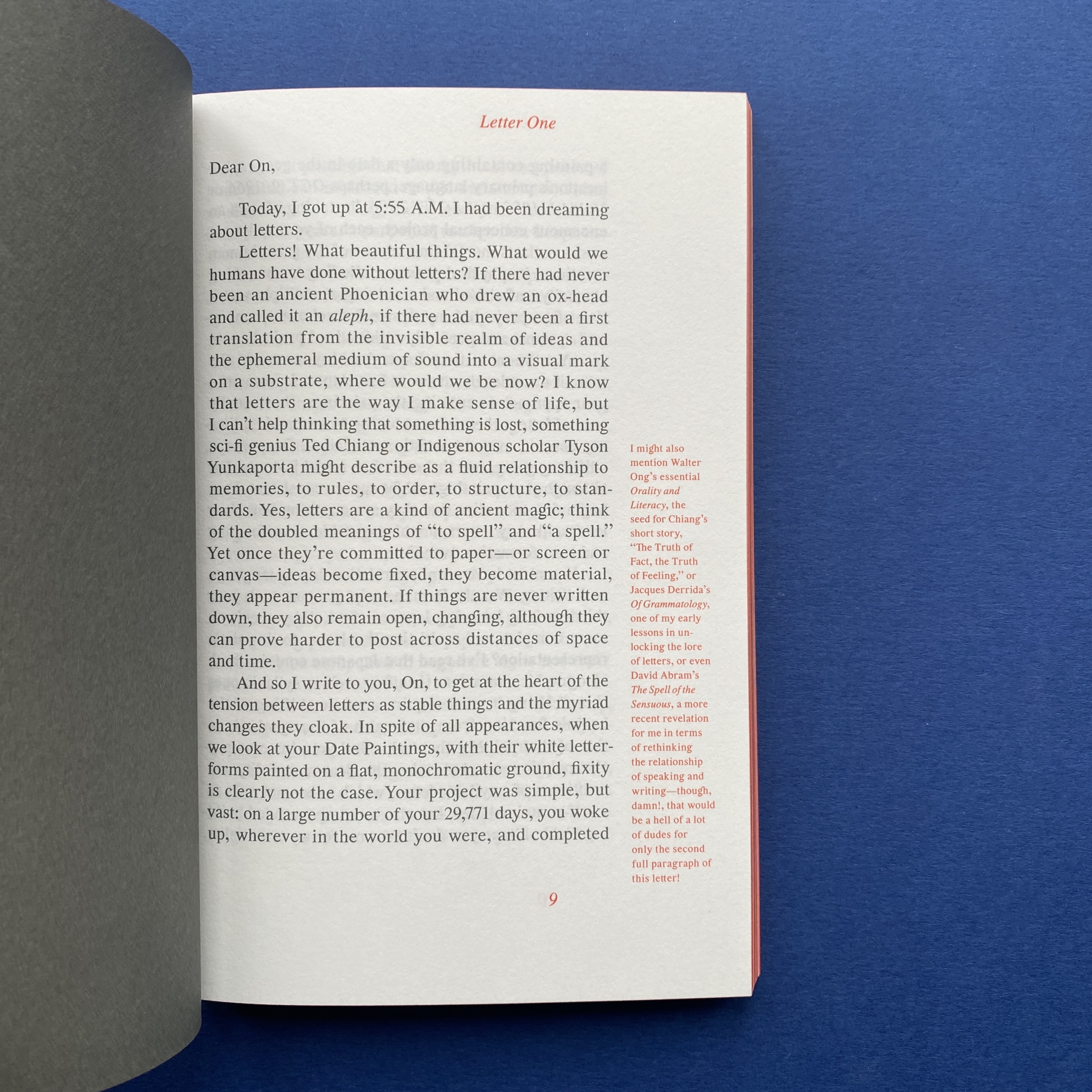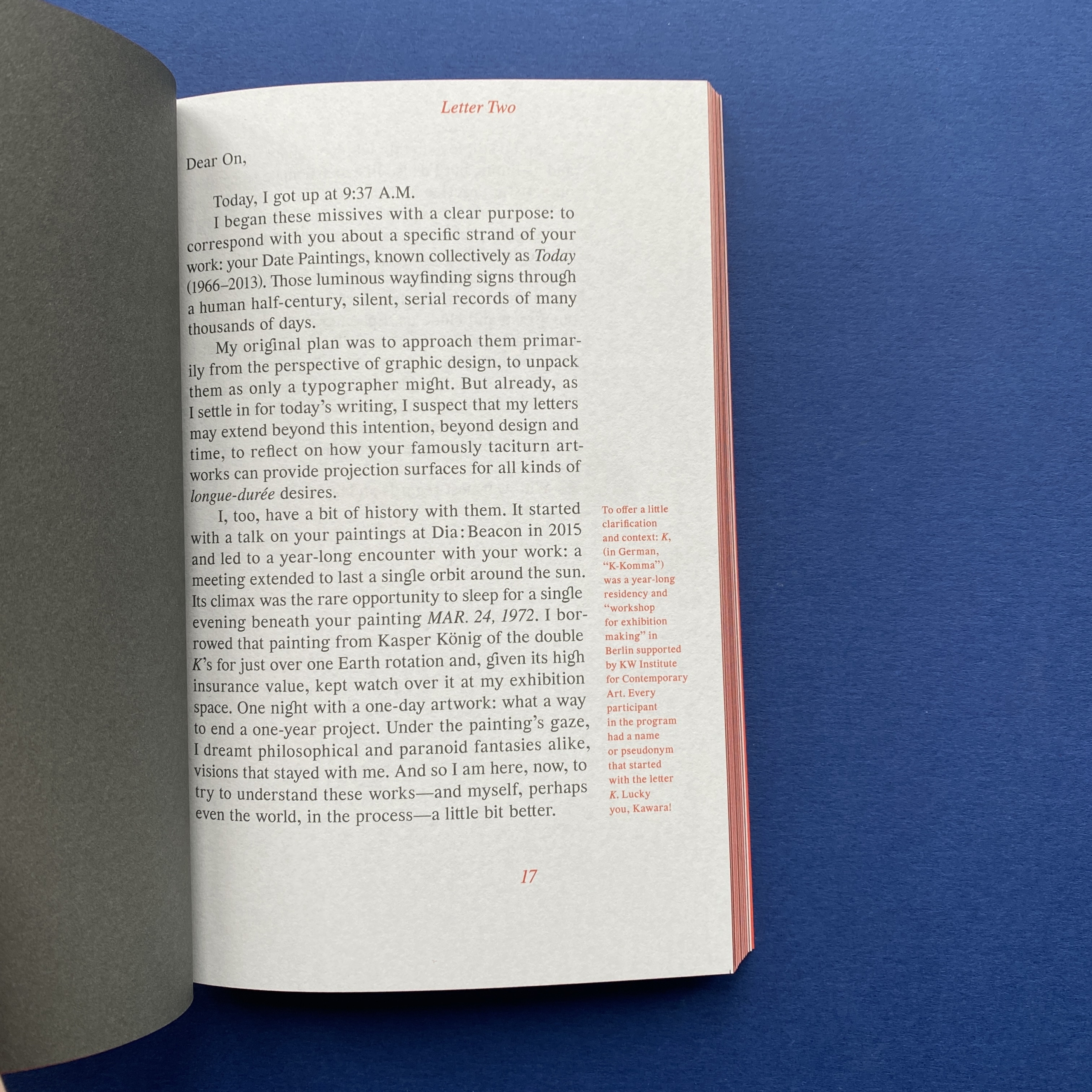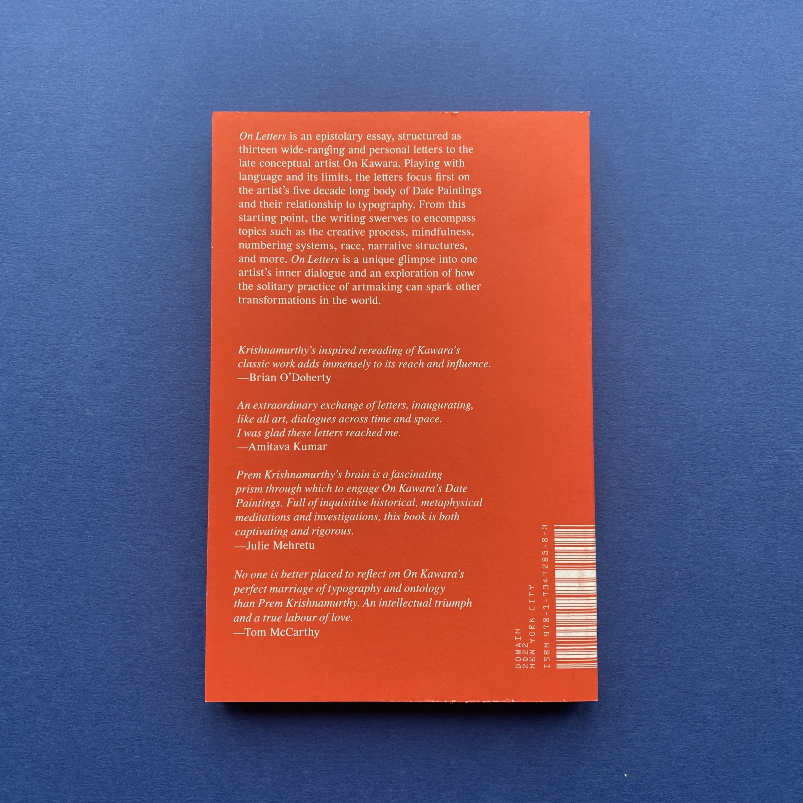 On Letters is an epistolary essay, in thirteen letters to the late conceptual artist On Kawara, Krishnamurthy analyses the “Date Paintings” series and their relationship to typography.