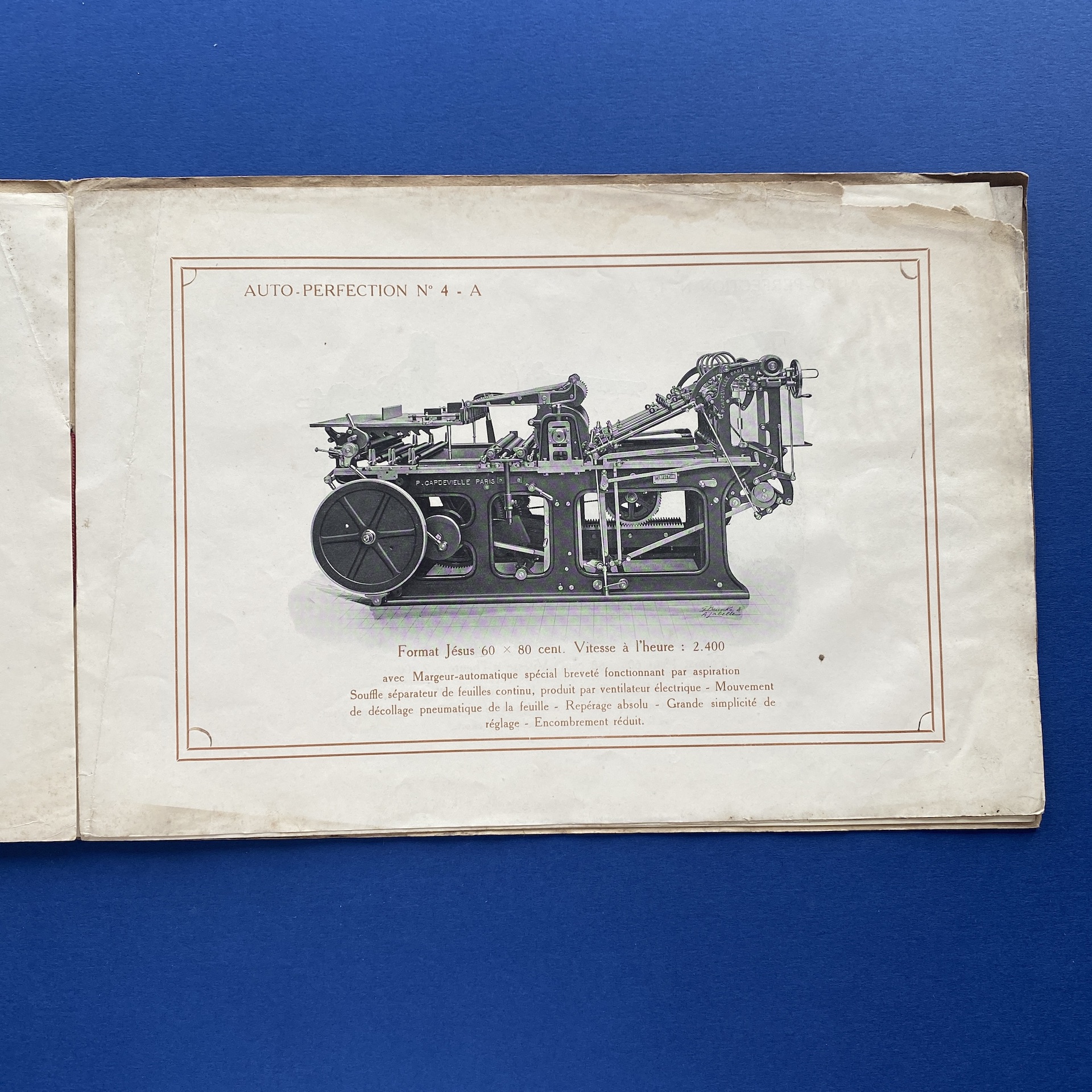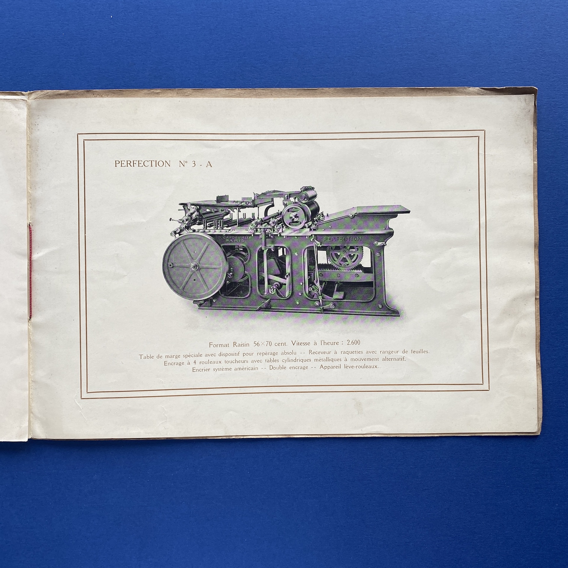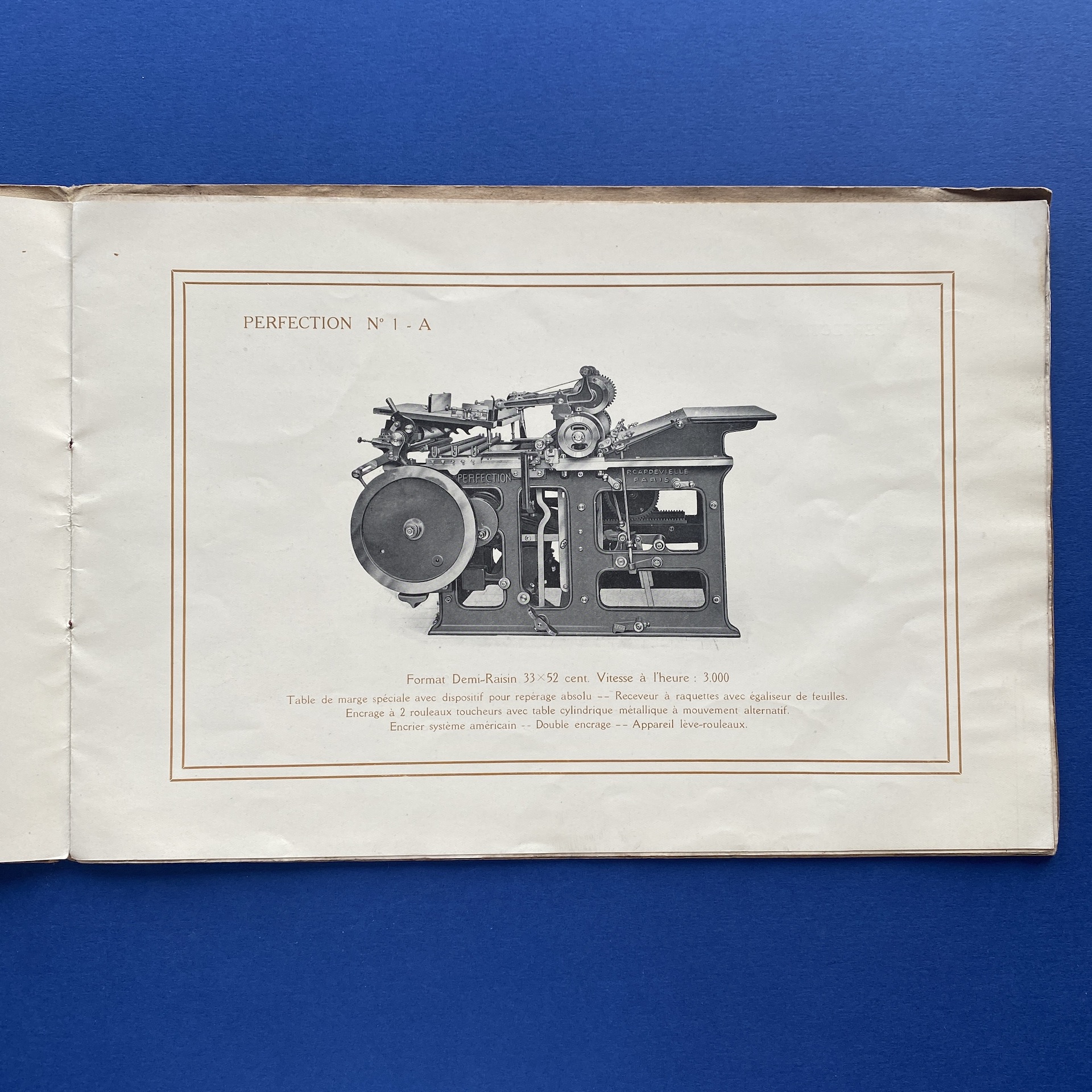 Presses rapides perfection, Paris, RC Seine, no date, 32 x 22 cm. Oblong booklet presentating two printing presses. Two inserts. Copy in correct condition: the front and back cover, show some signs of wear.