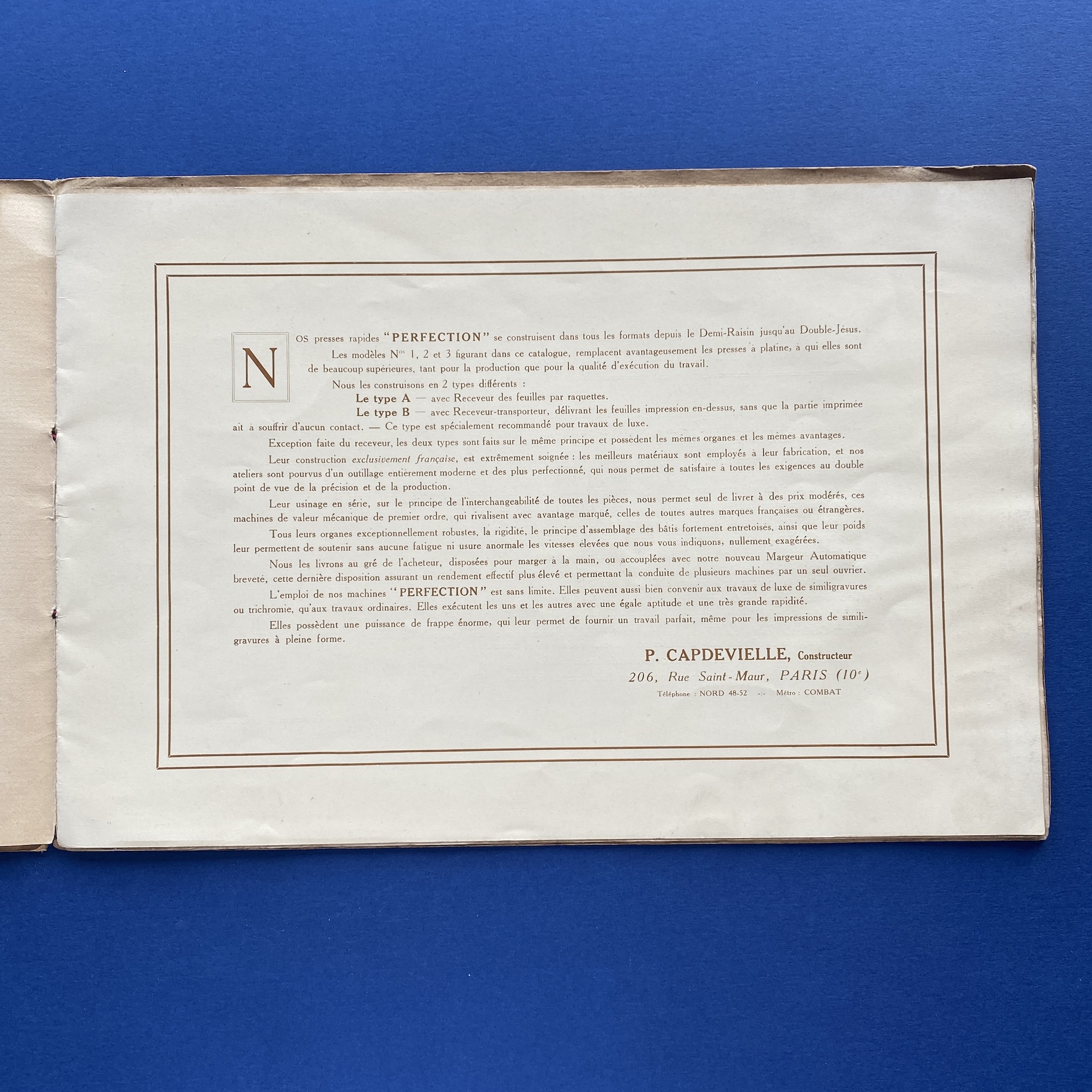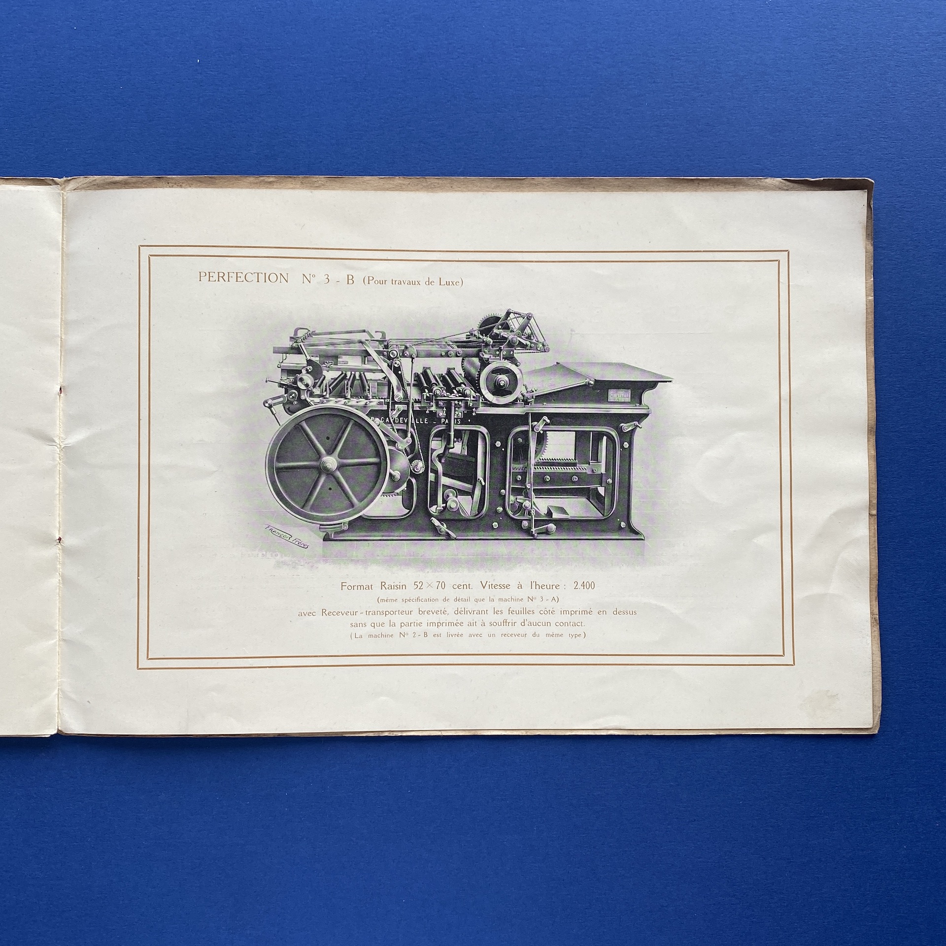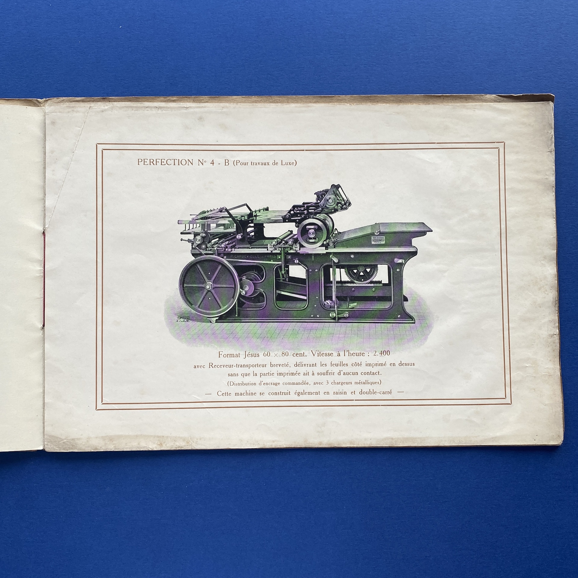 Presses rapides perfection, Paris, RC Seine, no date, 32 x 22 cm. Oblong booklet presentating two printing presses. Two inserts. Copy in correct condition: the front and back cover, show some signs of wear.