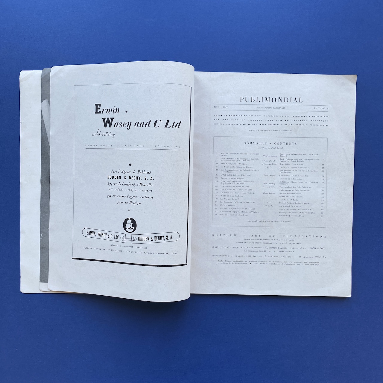 Publimondial #9, Revue internationale des arts graphiques et des techniques publicitaires, 1947, Art et Publications, Paris, 24,5 x 31,5 cm, 71 pp. Cover by Ternat. Good condition: only the front and the back cover shows some traces of use.