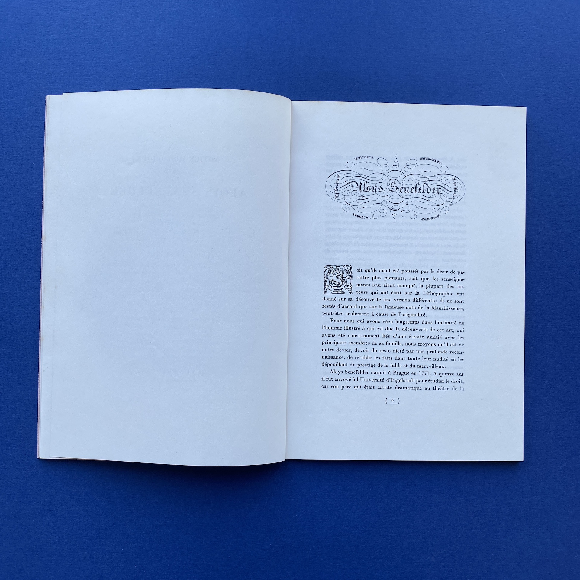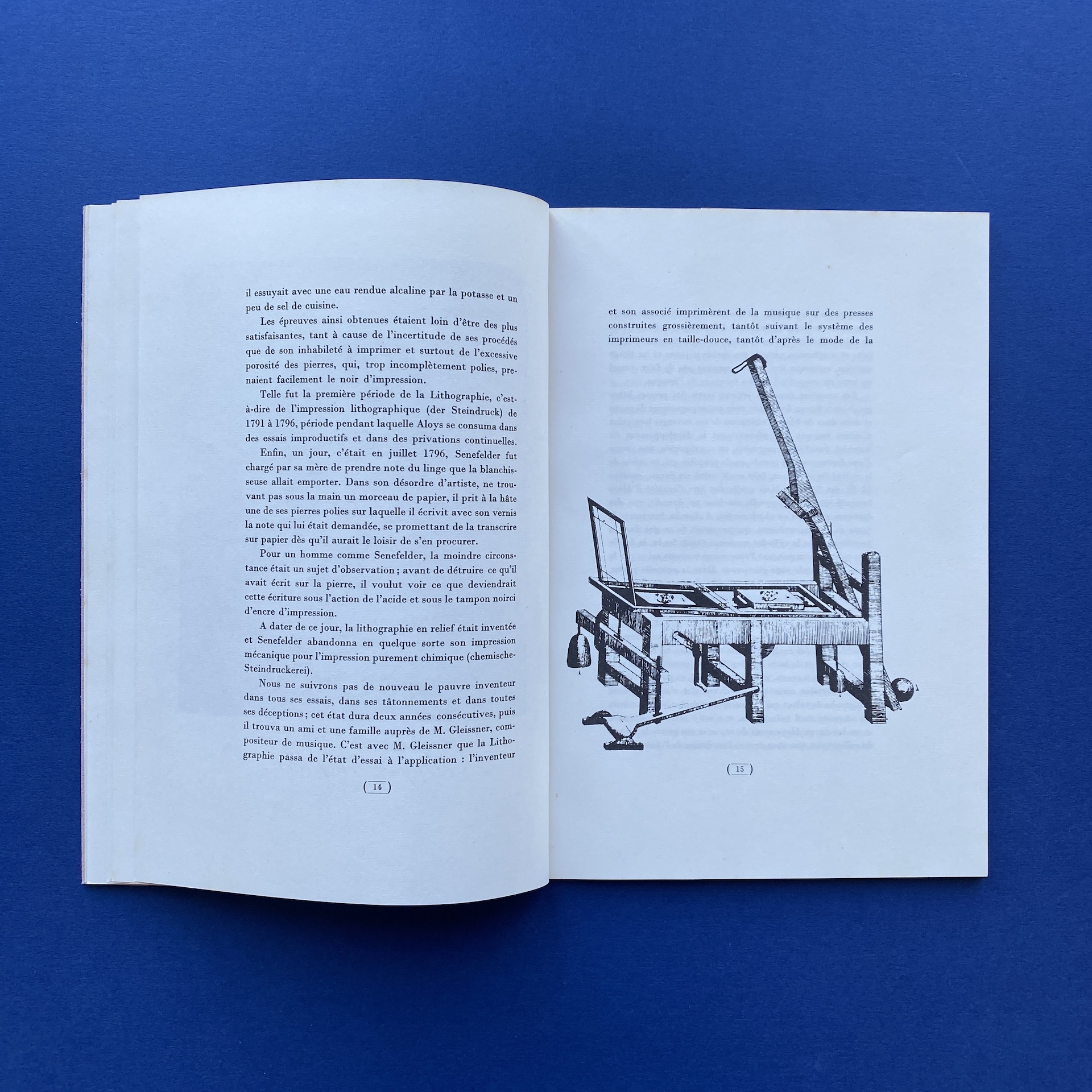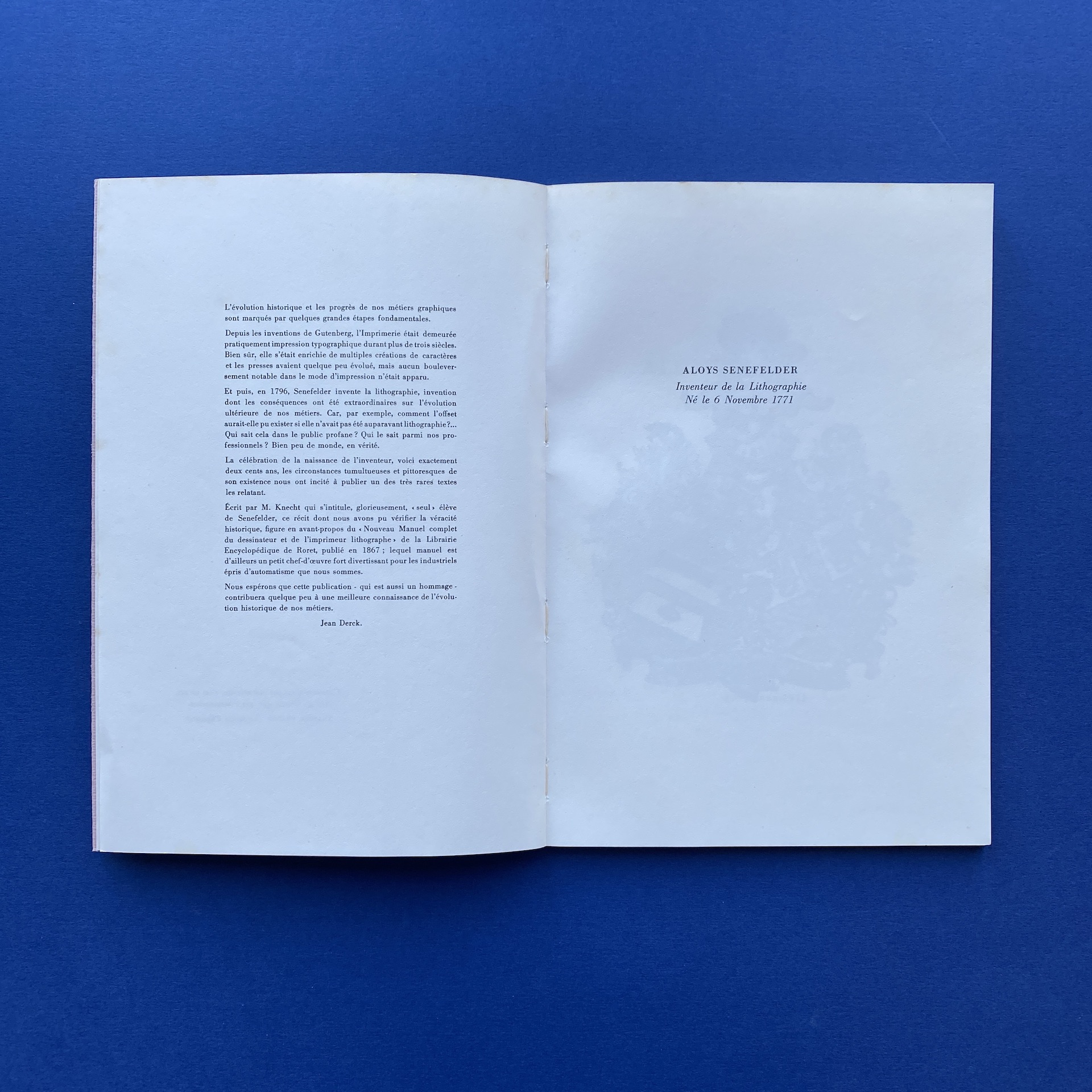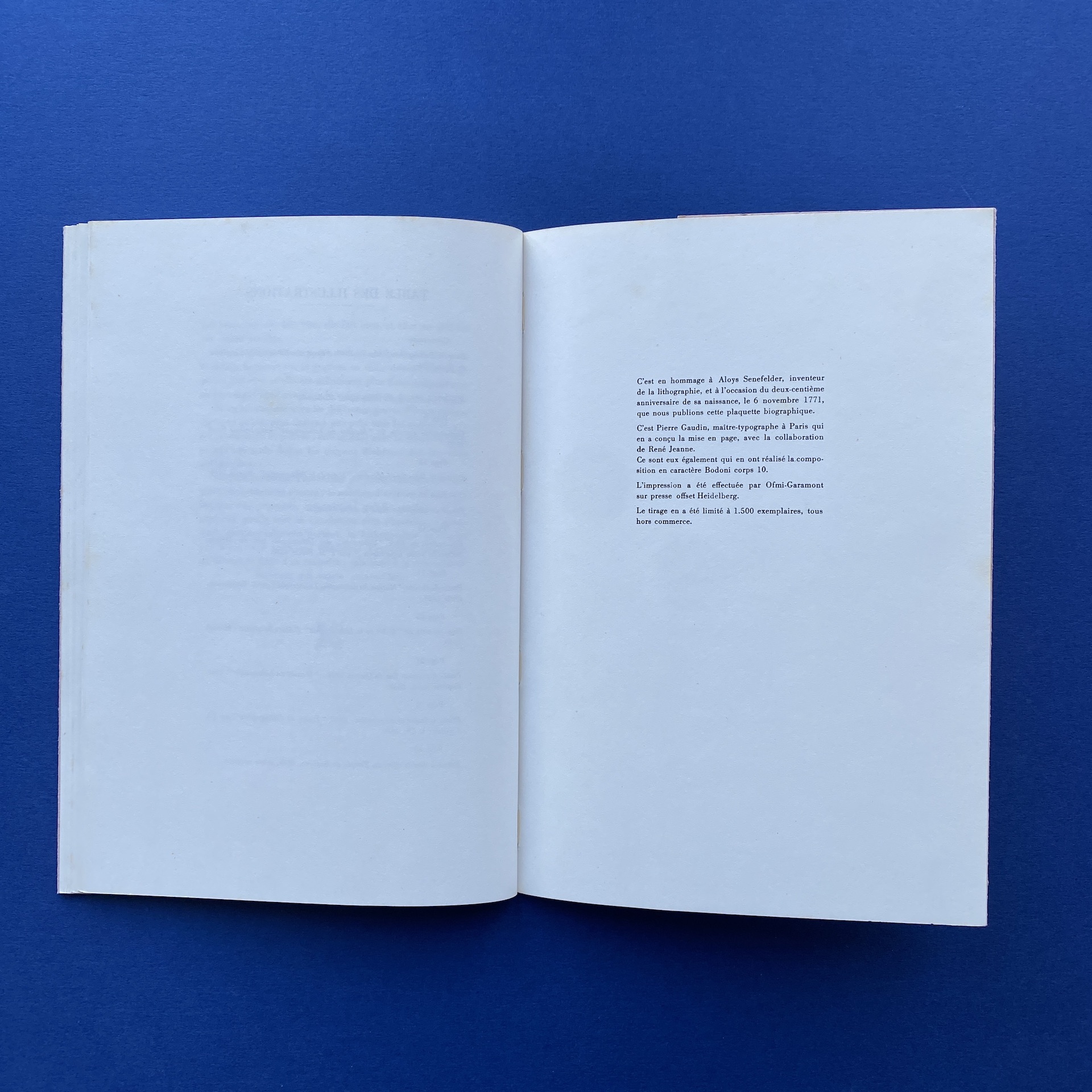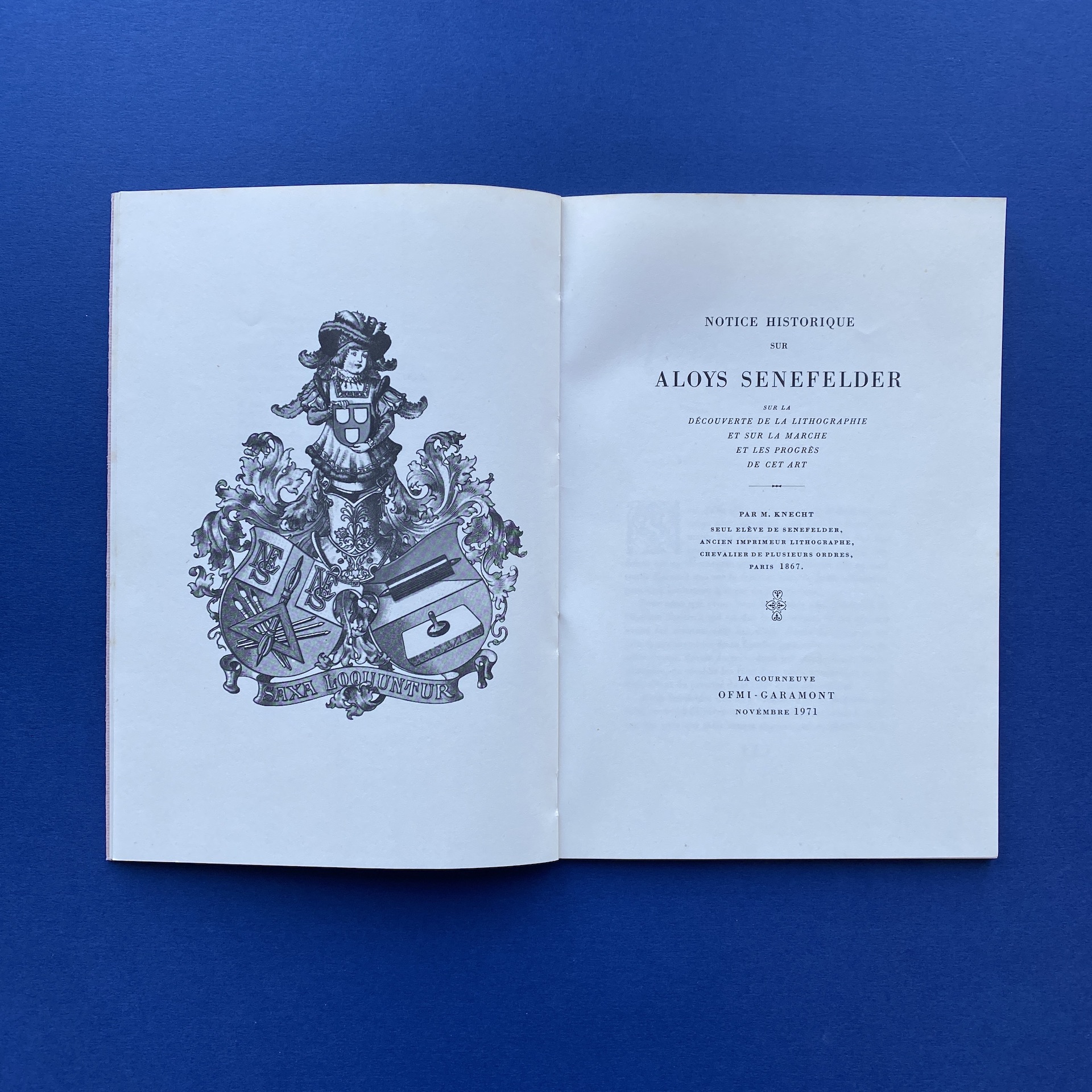 KNECHT M., Qui étiez-vous Monsieur Senefelder ?, La Courneuve, OFMI Garamont, Novembre 1971, 16 x 24 cm, 33 pp. Limited edition 1500 copies. Copy in excellent condition.