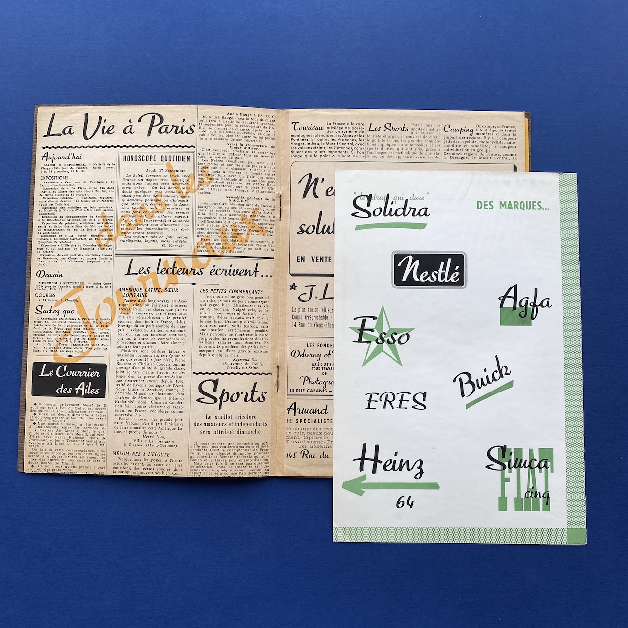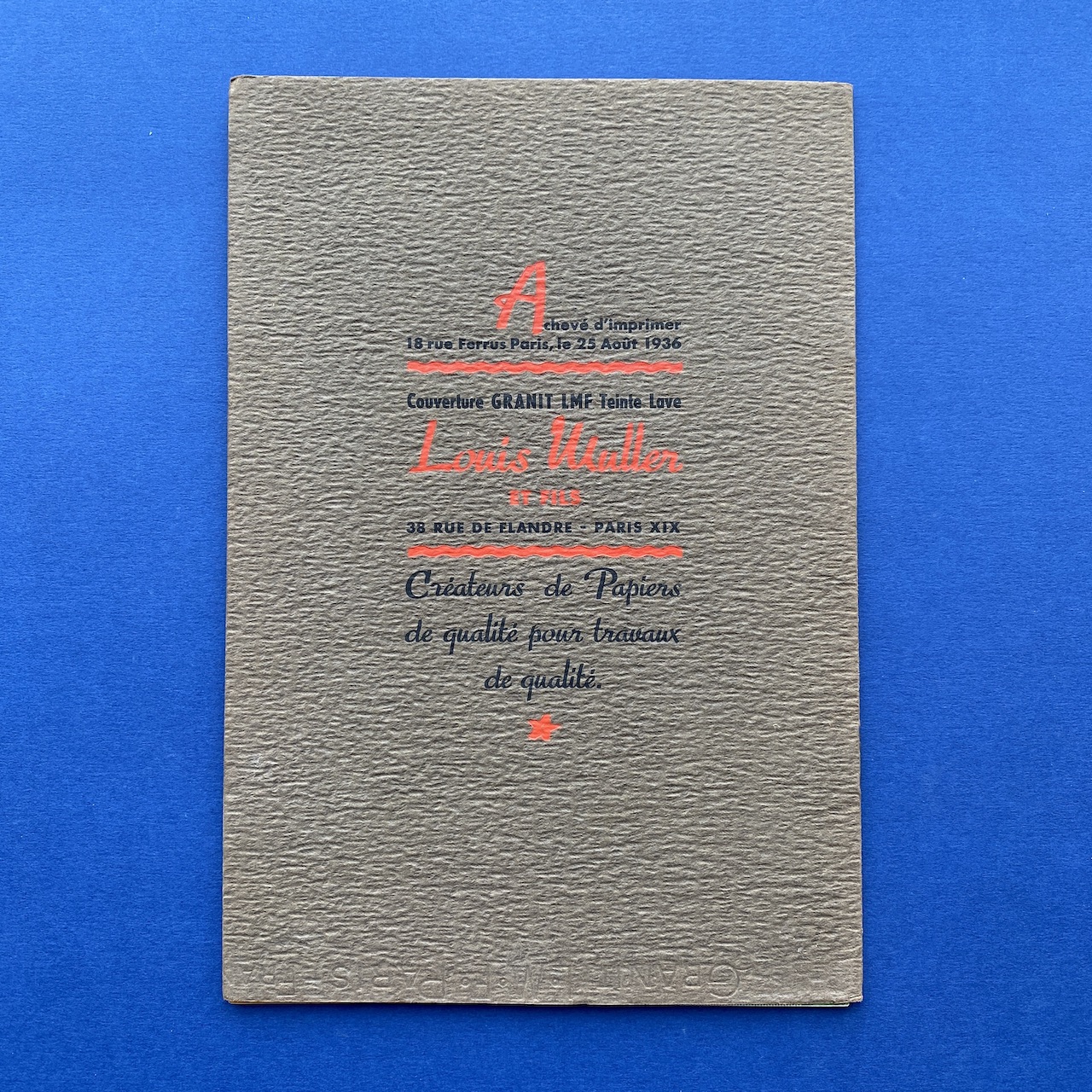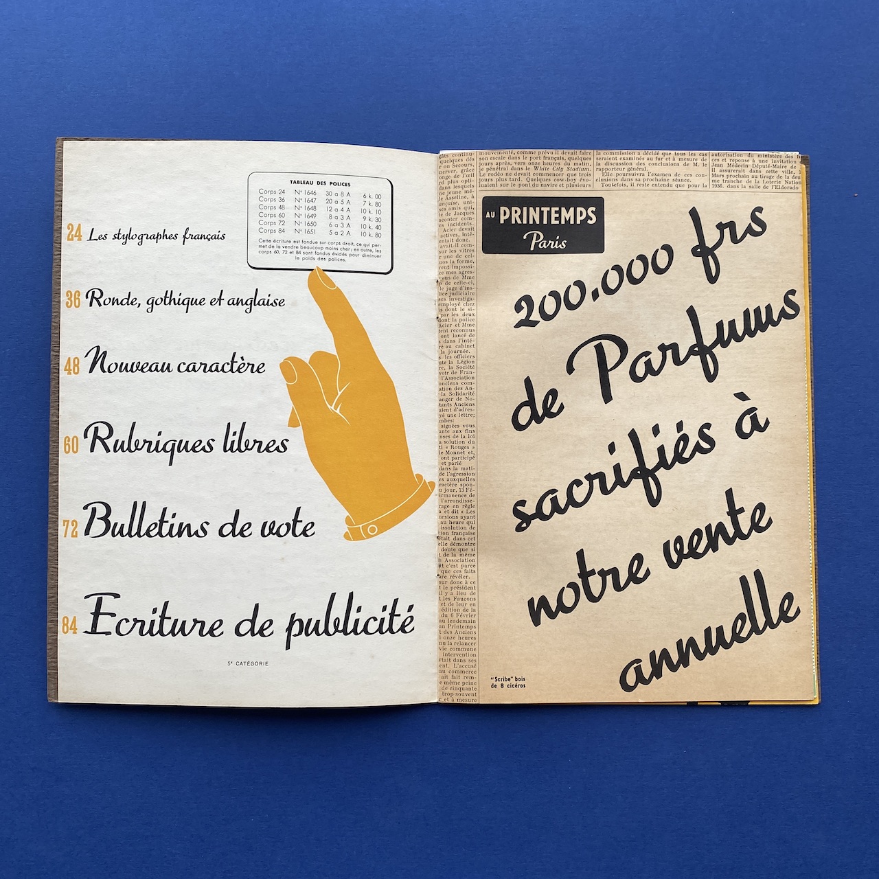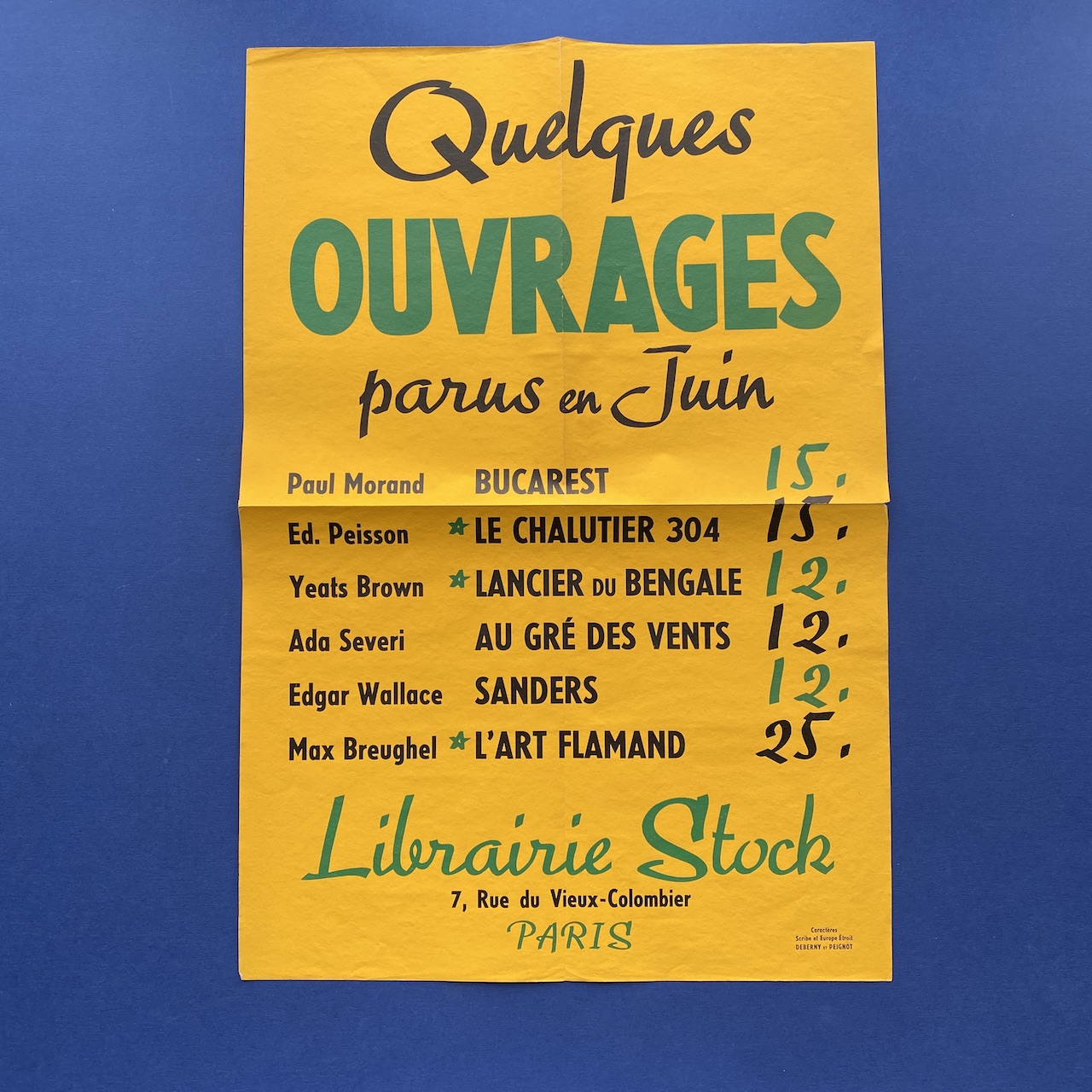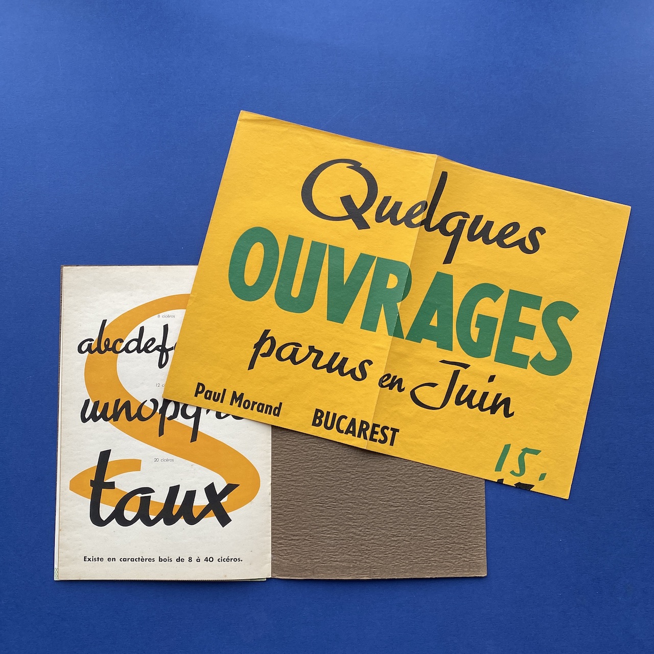 Scribe, 1936, Deberny et Peignot, 18,5 x 27 cm, 14 pp (one missing page). Typeface by Marcel Jacno. Insert: Stock library folded poster set in Scribe and Europe étroit (35,5 x 53 cm). Booklet and poster in good condition.