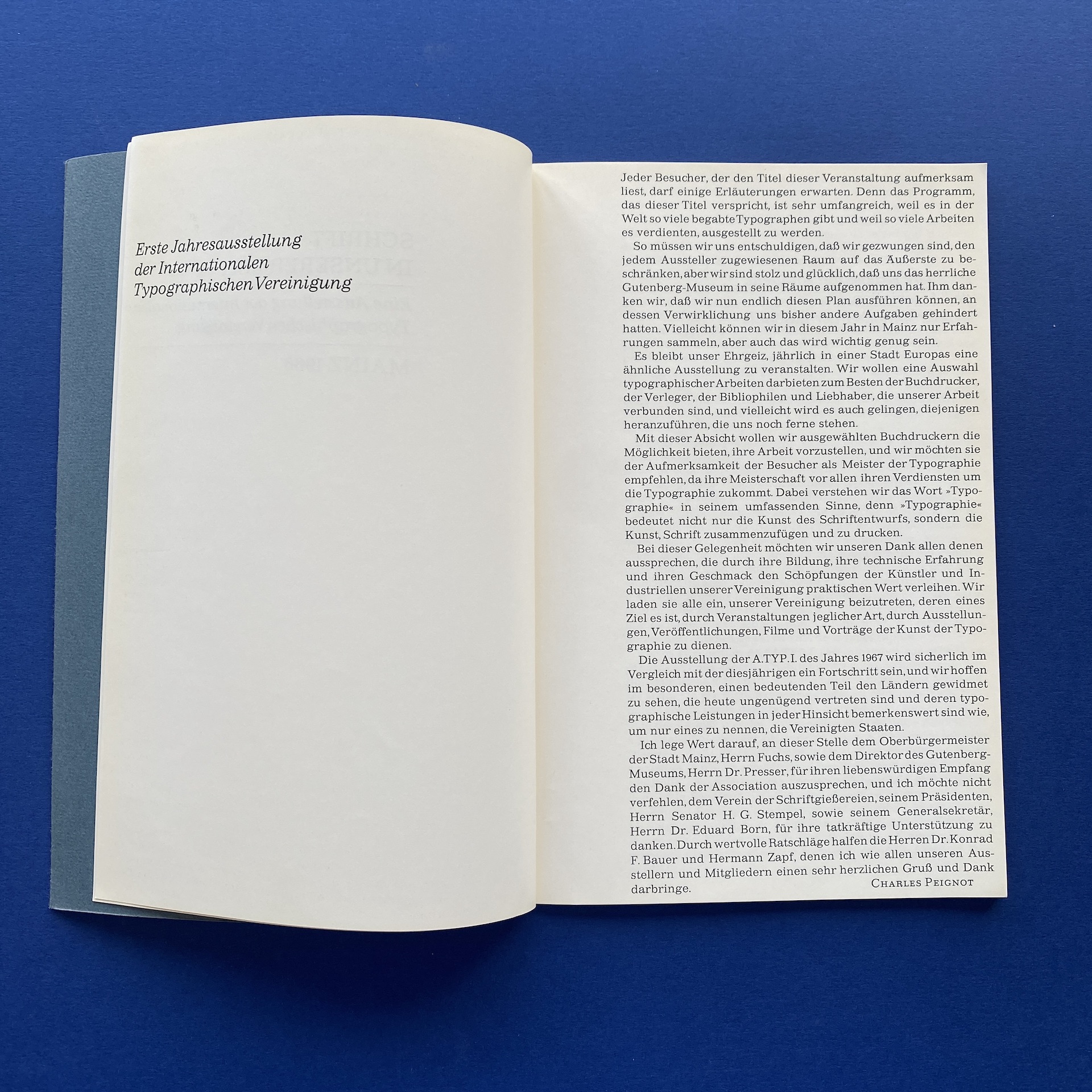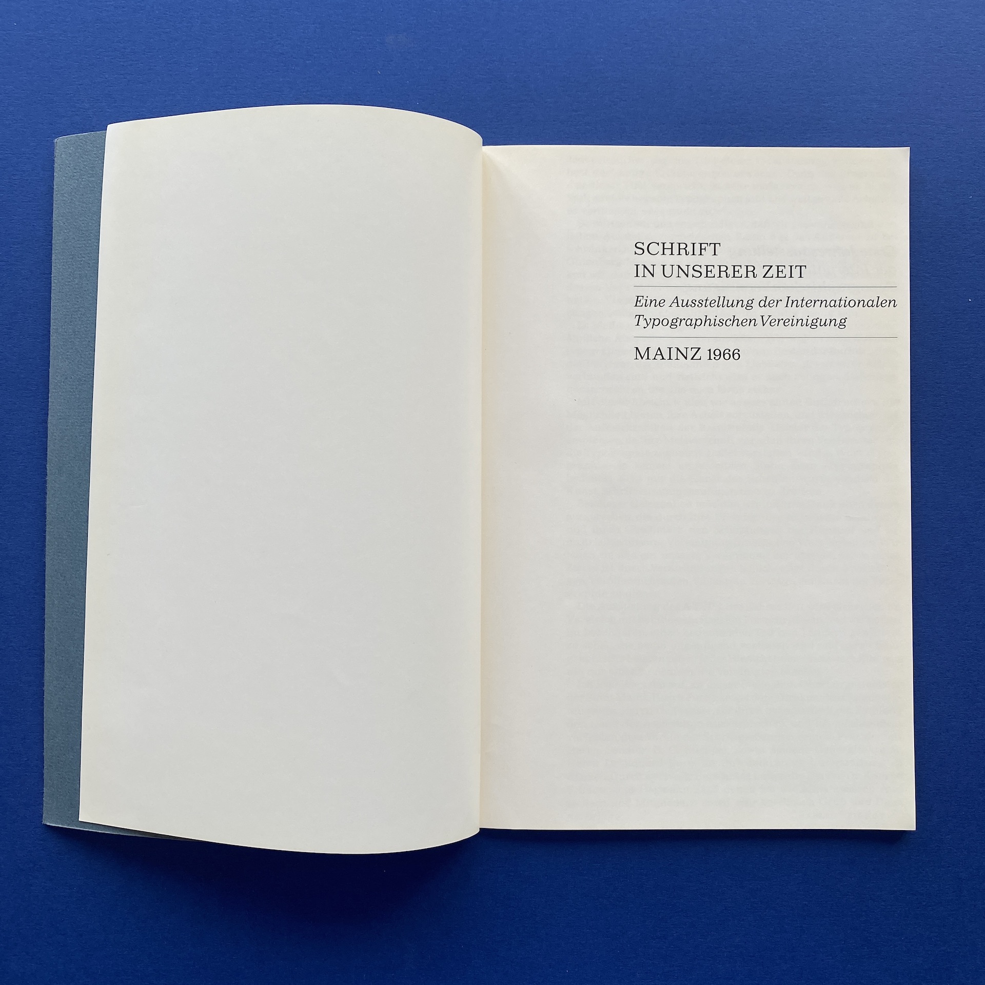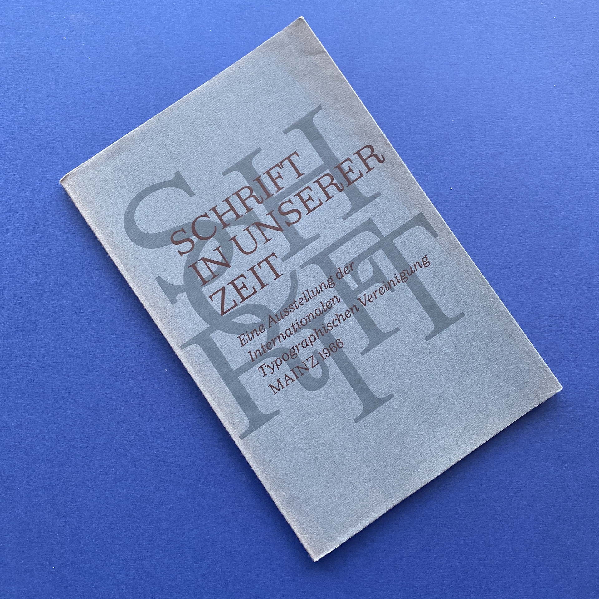 Shrift in unserer zeit, eine ausstellung der internationalen Typographishen Vereinigung, Mainz, 1966, 15,4 x 24 cm. Lang: Fre., Eng. & Ger. With Charles Peignot, Marcel Jacno, Valter Falk. Very good condition.