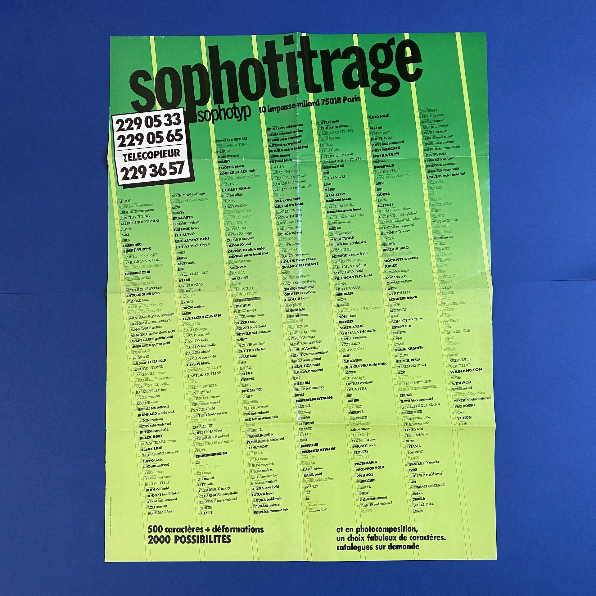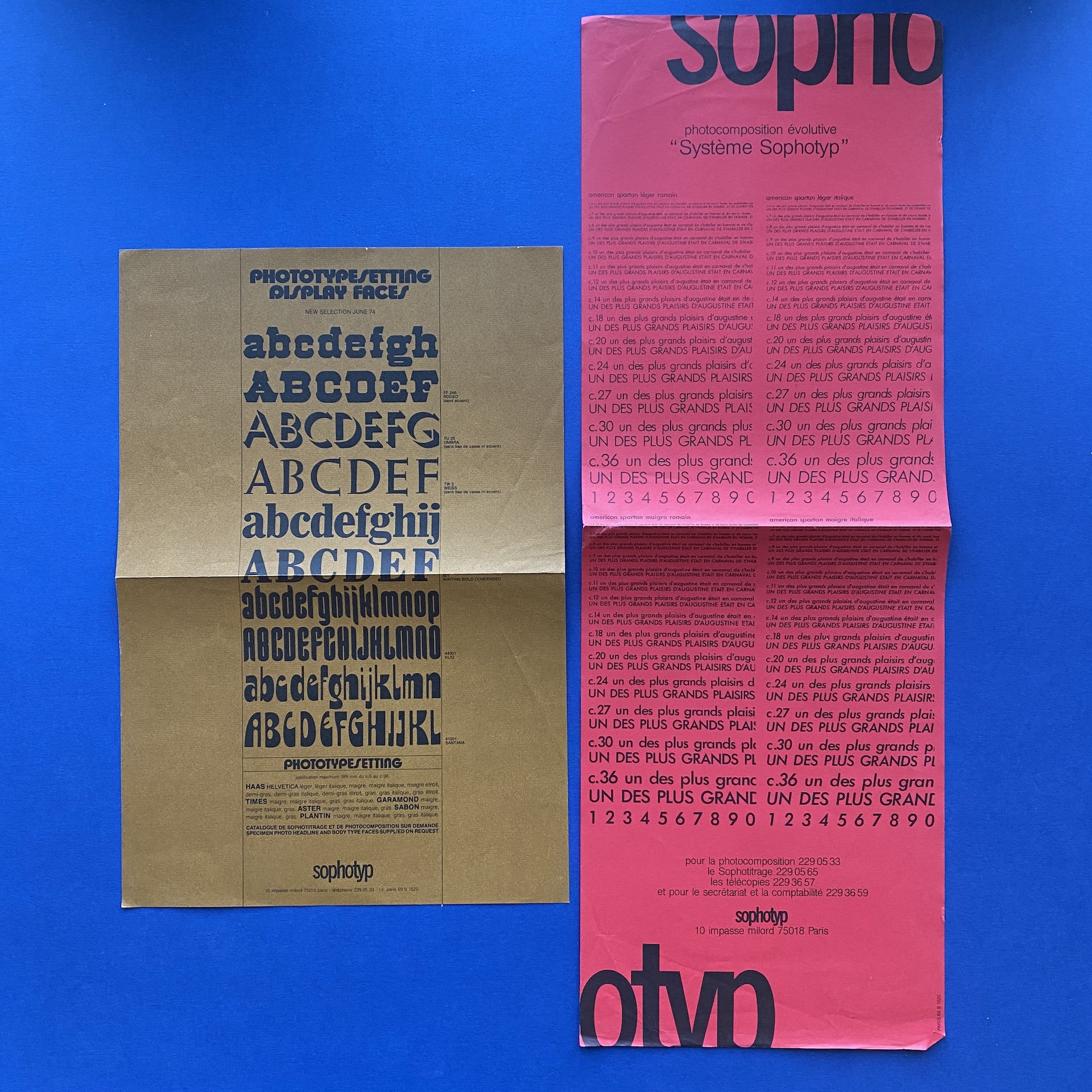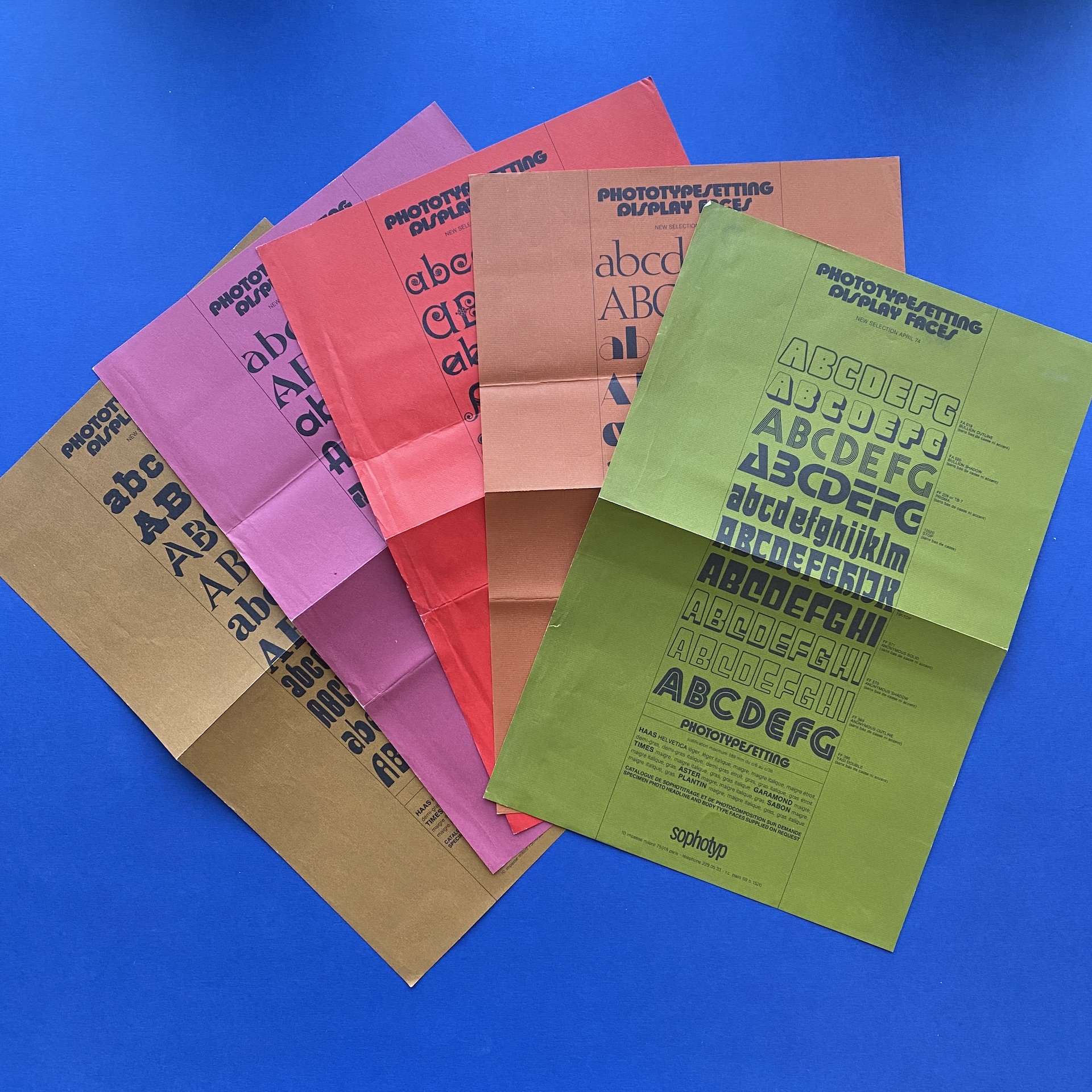 Sophotyp Poster set, including one large poster in poor condition (72 x 109 cm). A Sophotitrage poster in very good condition. (59 x 81). 5 Phototype posters in different colors (27 x 40) and 2 inserts.