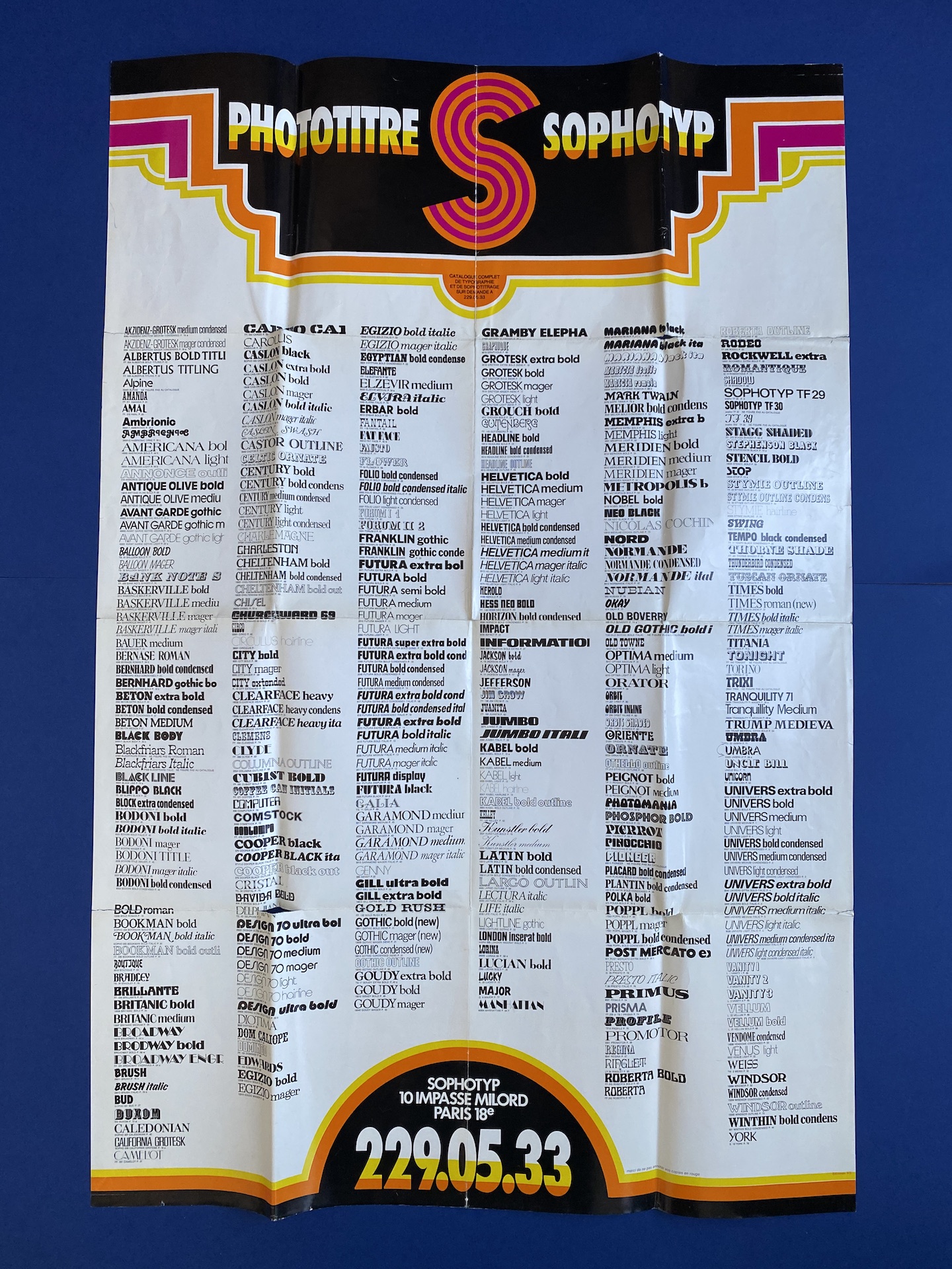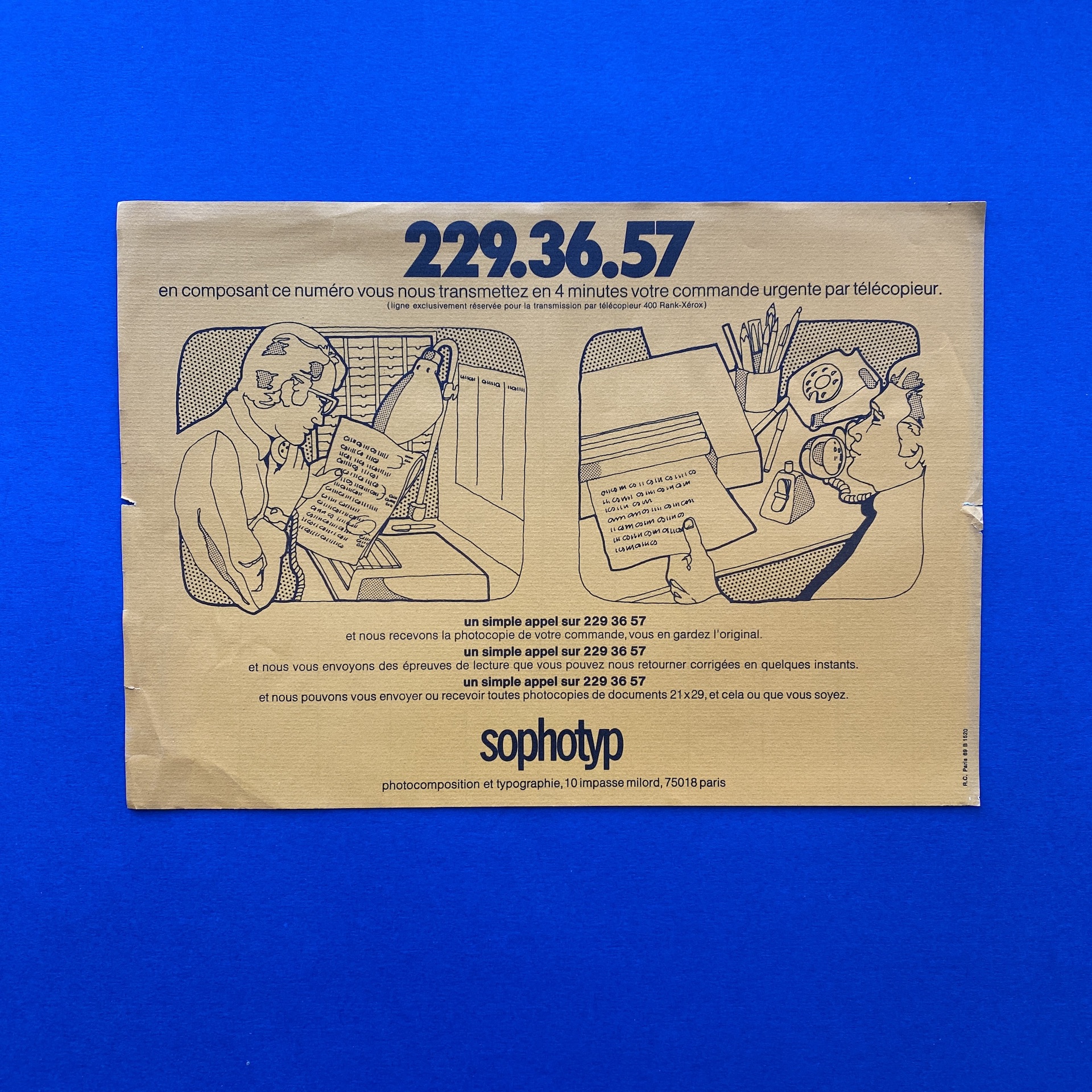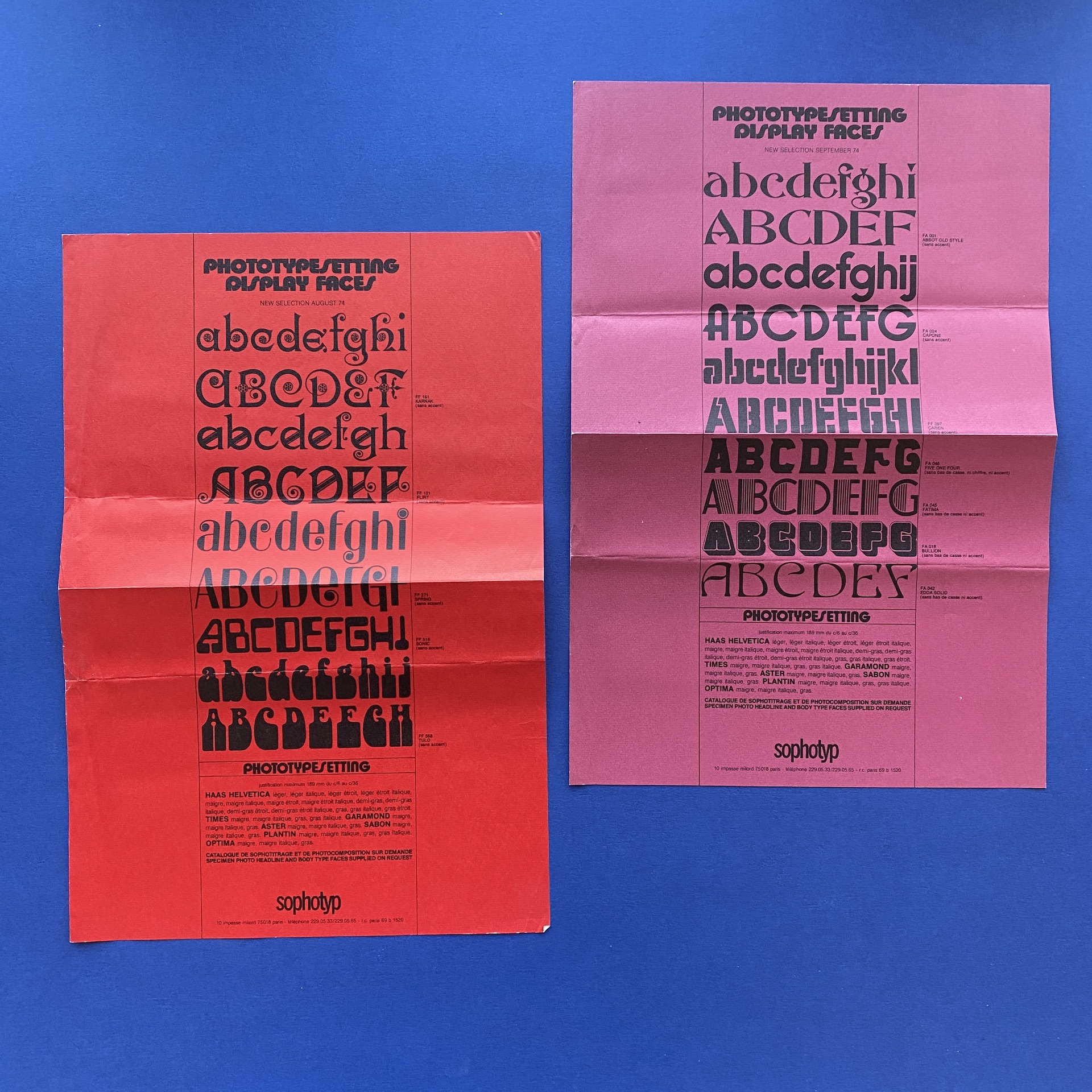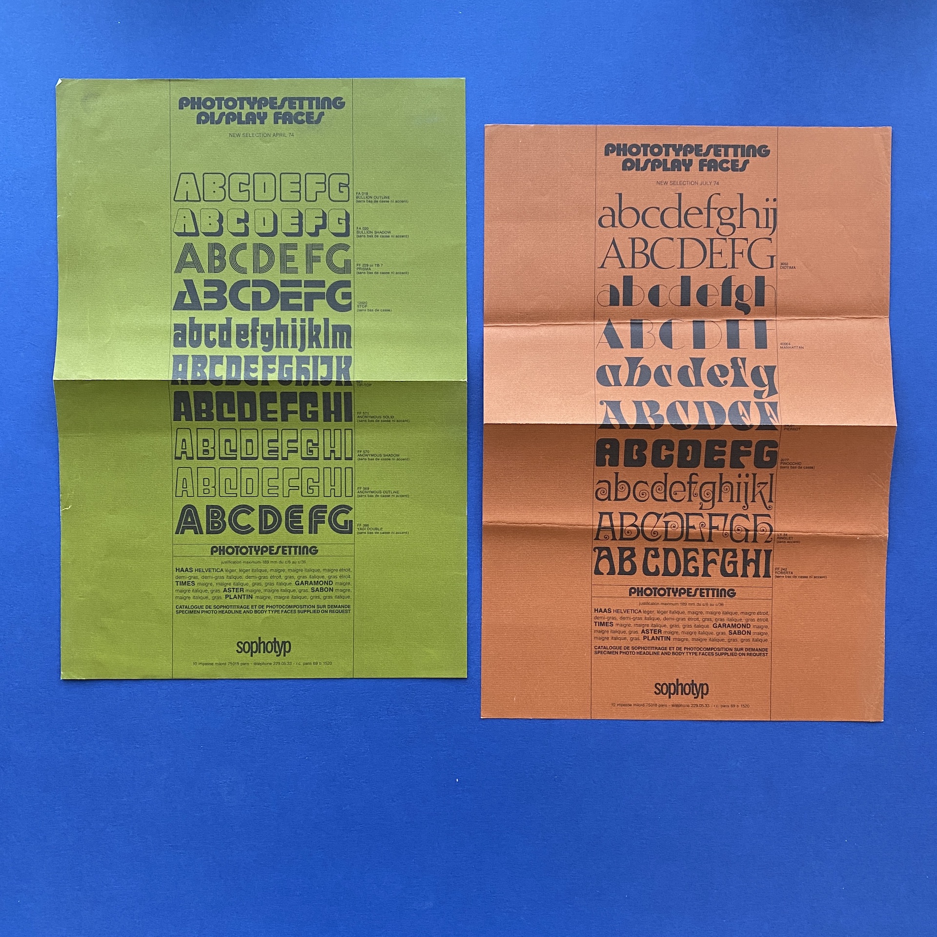 Sophotyp Poster set, including one large poster in poor condition (72 x 109 cm). A Sophotitrage poster in very good condition. (59 x 81). 5 Phototype posters in different colors (27 x 40) and 2 inserts.