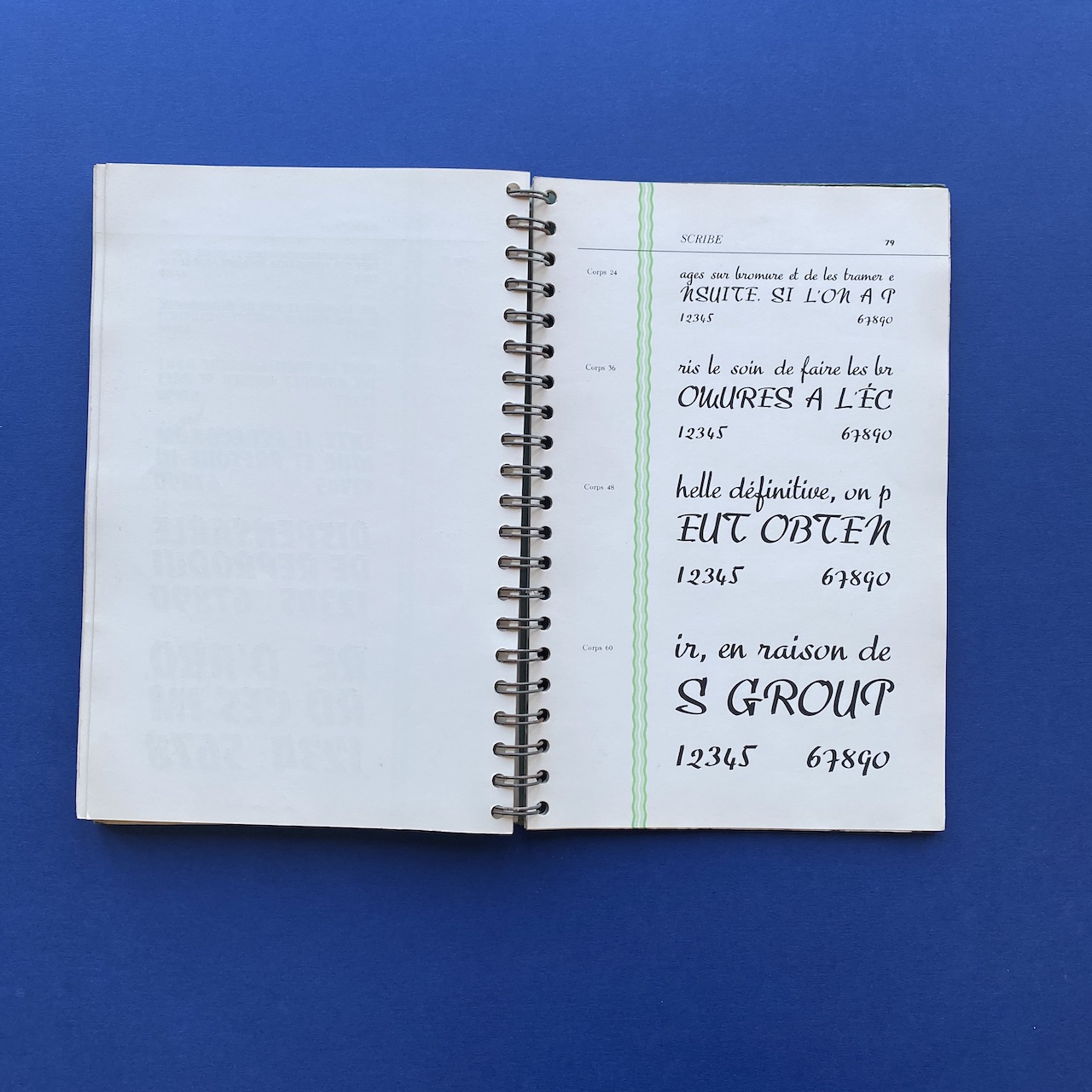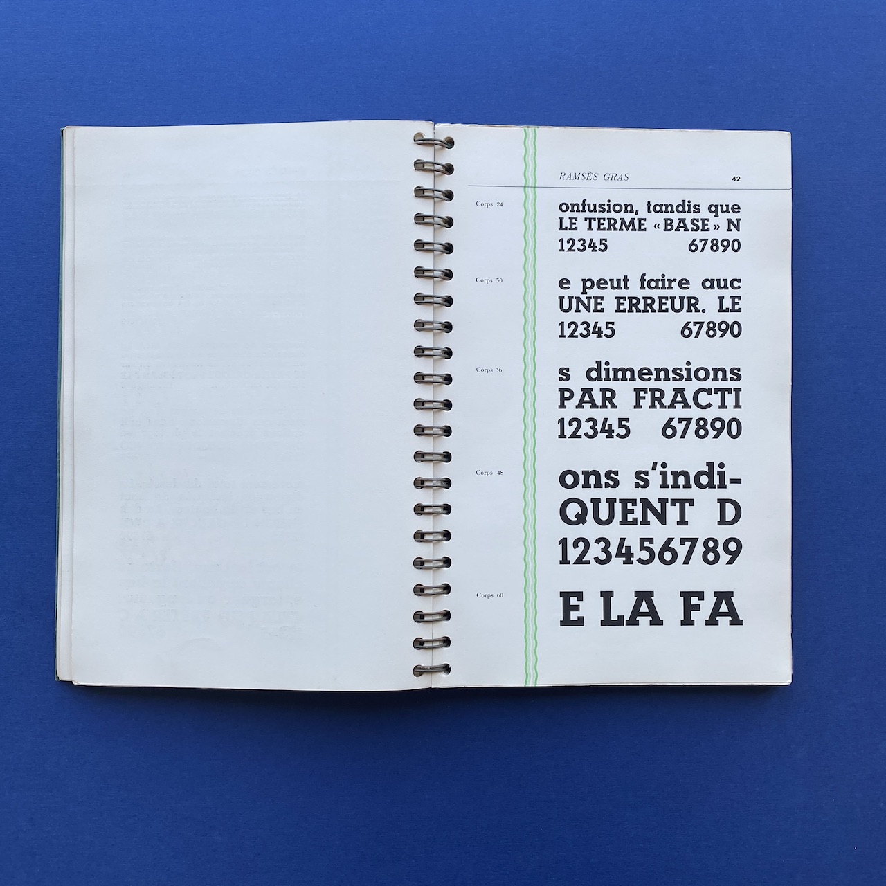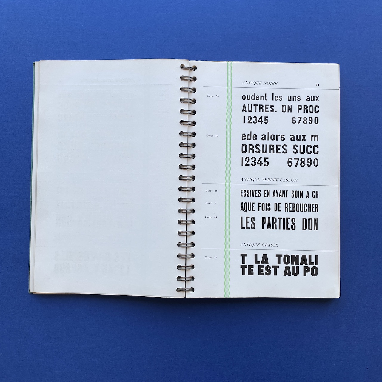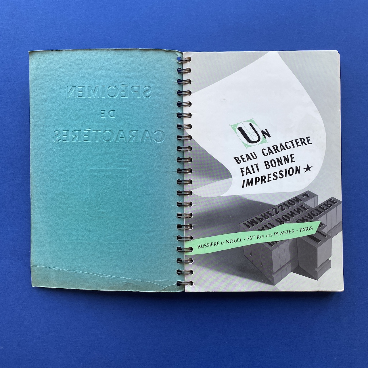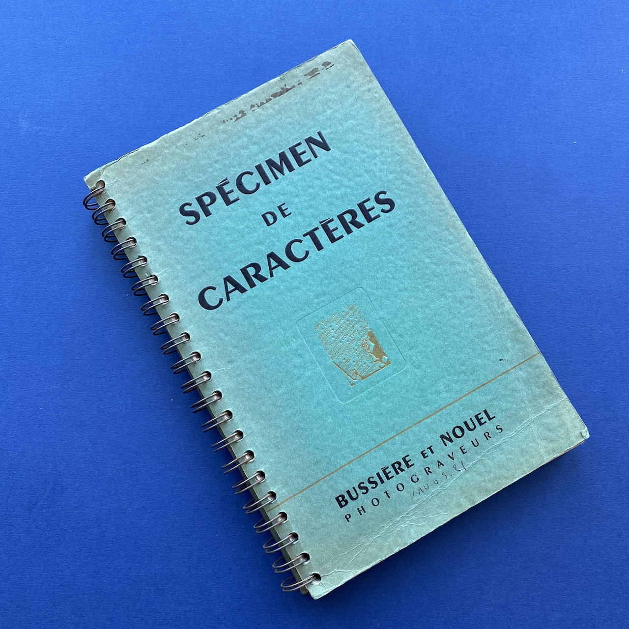 Spécimen de caractères, Bussière et Nouel, 1950s, Paris, 18,9 x 27,4 cm. Beautiful catalogue including: Peignot, Europe, Gill, Noble, Kabel, Banjo, Antique, Ramses… Three letters cut-out. Cover a bit yellowed. Inscription on the cover.