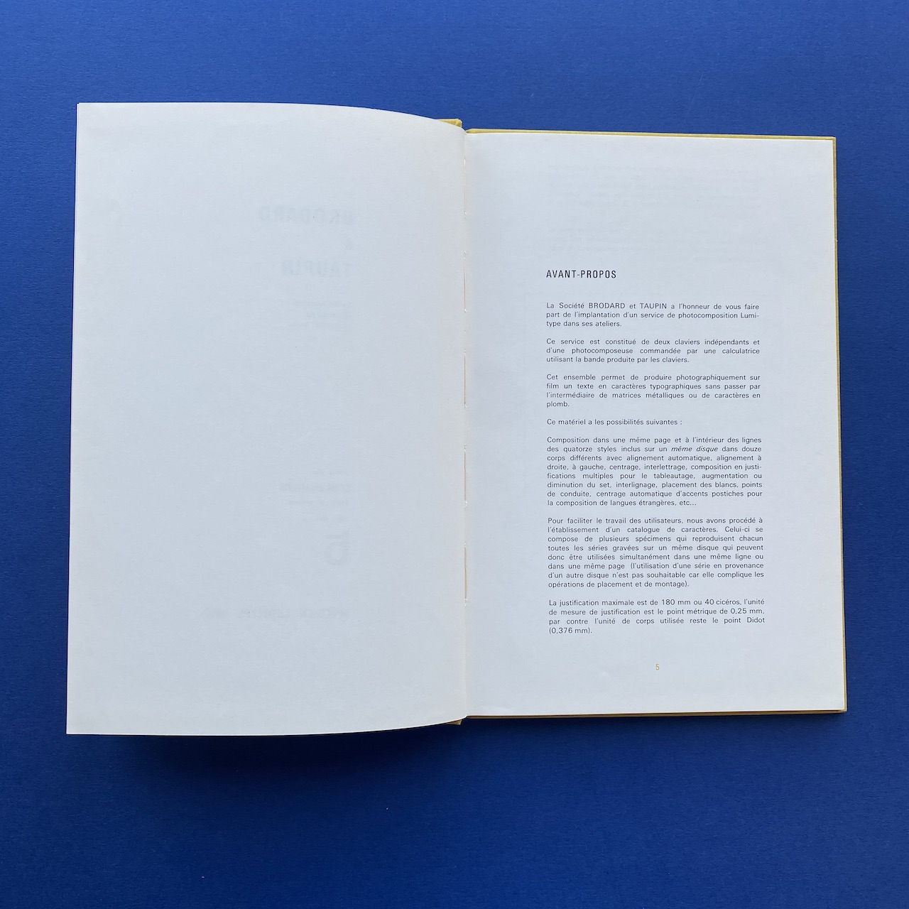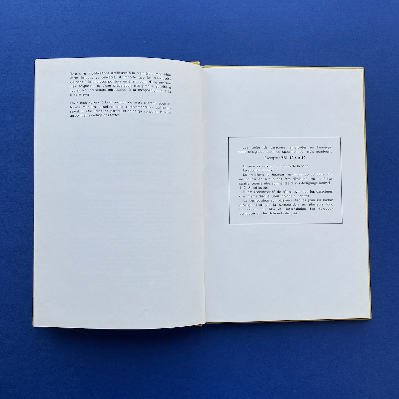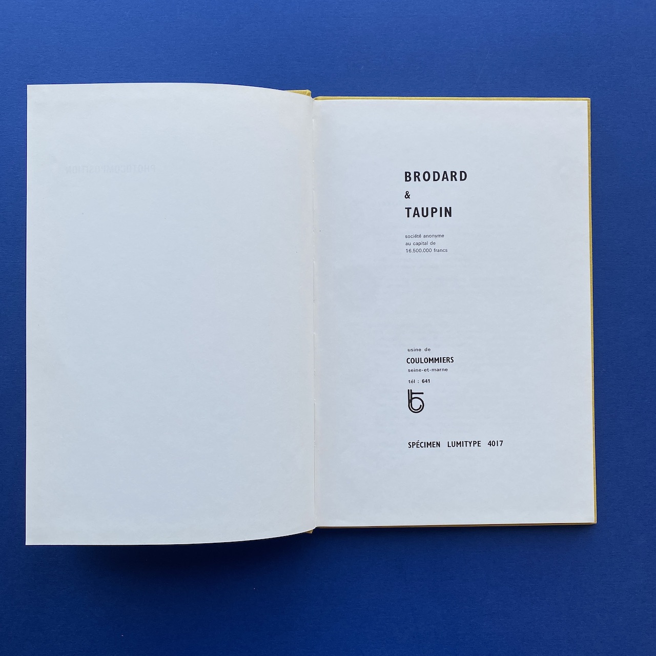 Specimen Lumitype, Photocomposition, Brodard & Taupin, Paris, 16,5 x 24,5 cm, 67 pp. Rigid covers in yellow fabric.
