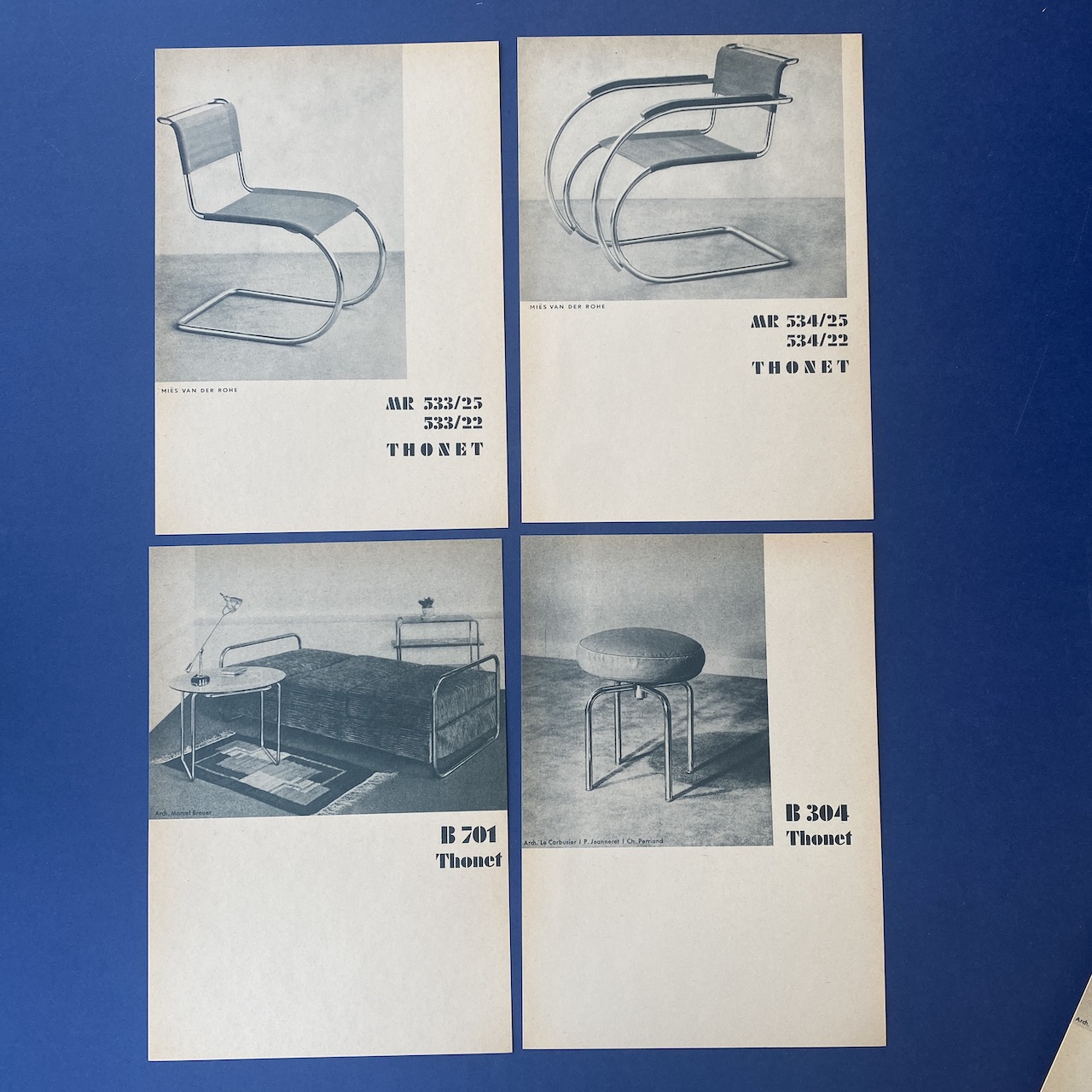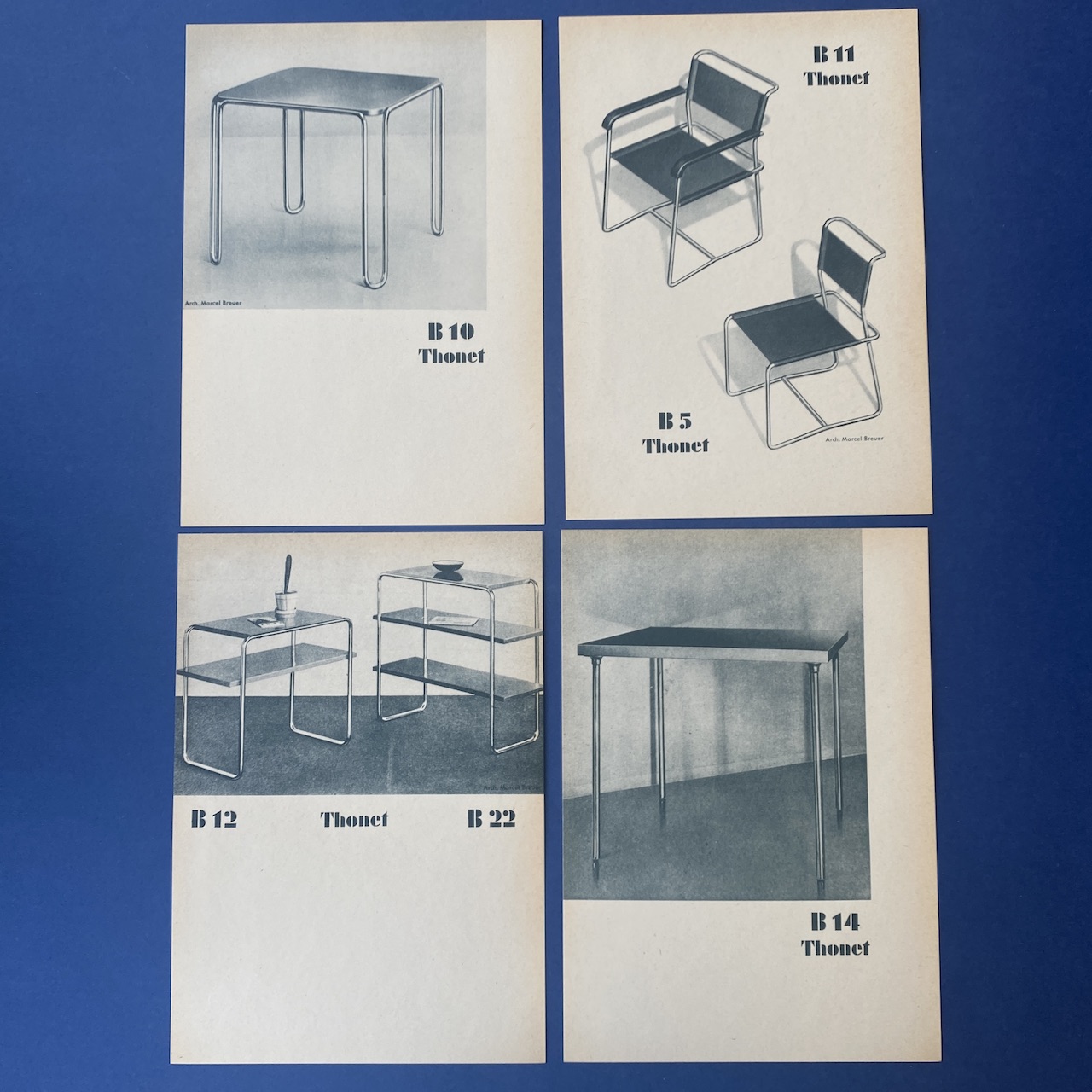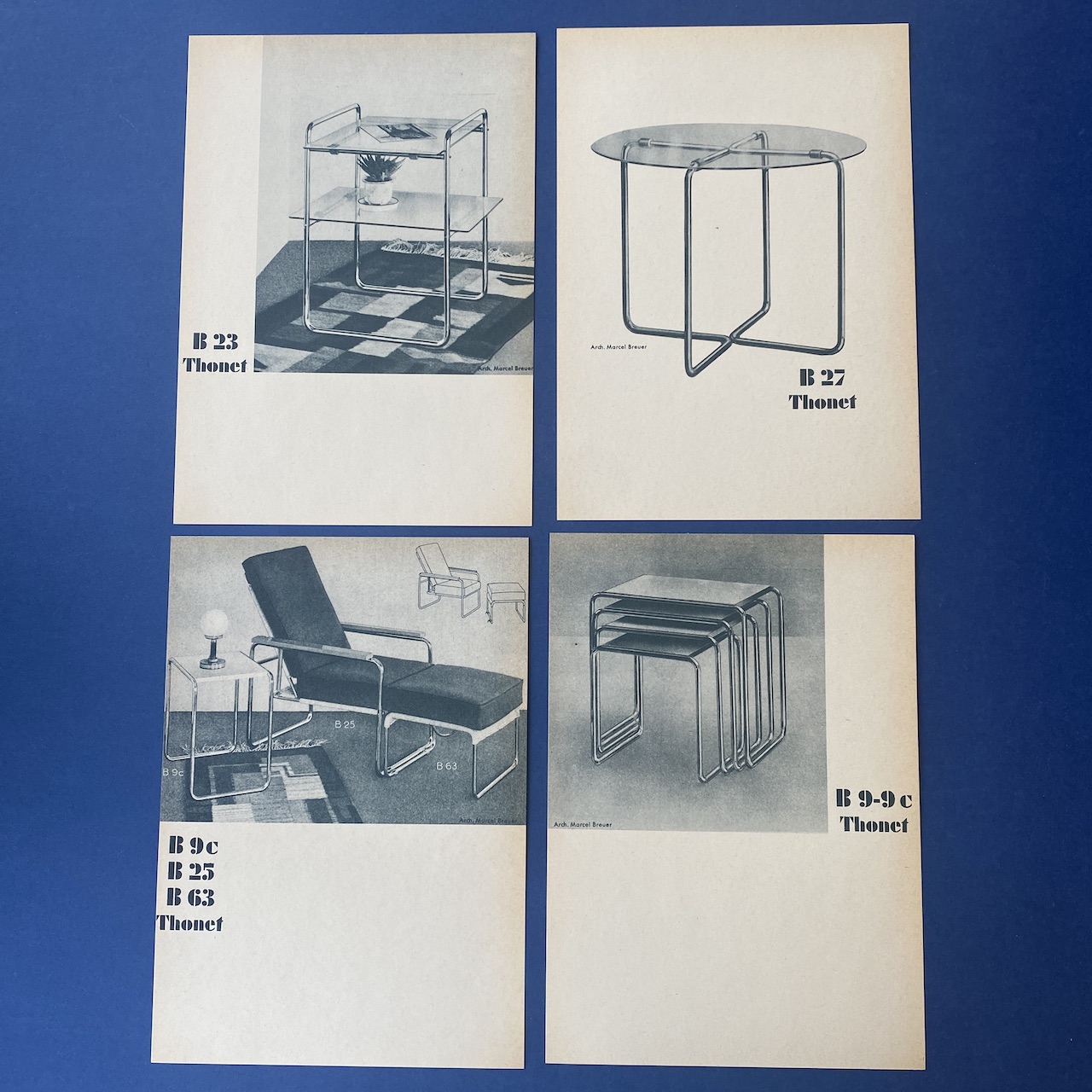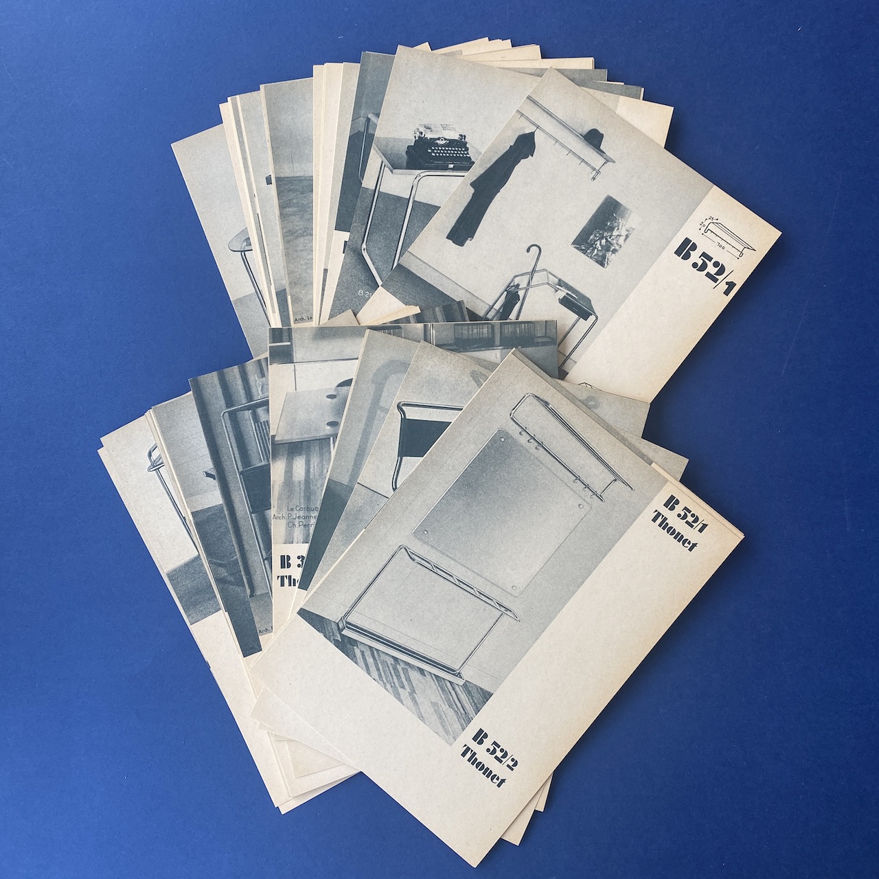 First complete collection of German and French models between 1930 and 1931 with an introduction of Dr. Ing. Habil. Sonja Günther. This catalogue contains 12 cards introduction by Dr. Sonja Günther, 62 illustrated cards showing the German and French production line of tubular steel furniture between 1930 and 1931, 1 card “Versions of Thonet Tubular Steel Furniture , Vienna”, 1 card ” instructions for the applications of Assembly and repair tools” and 8 illustrated cards demonstrating the application of assembly and repair tools.