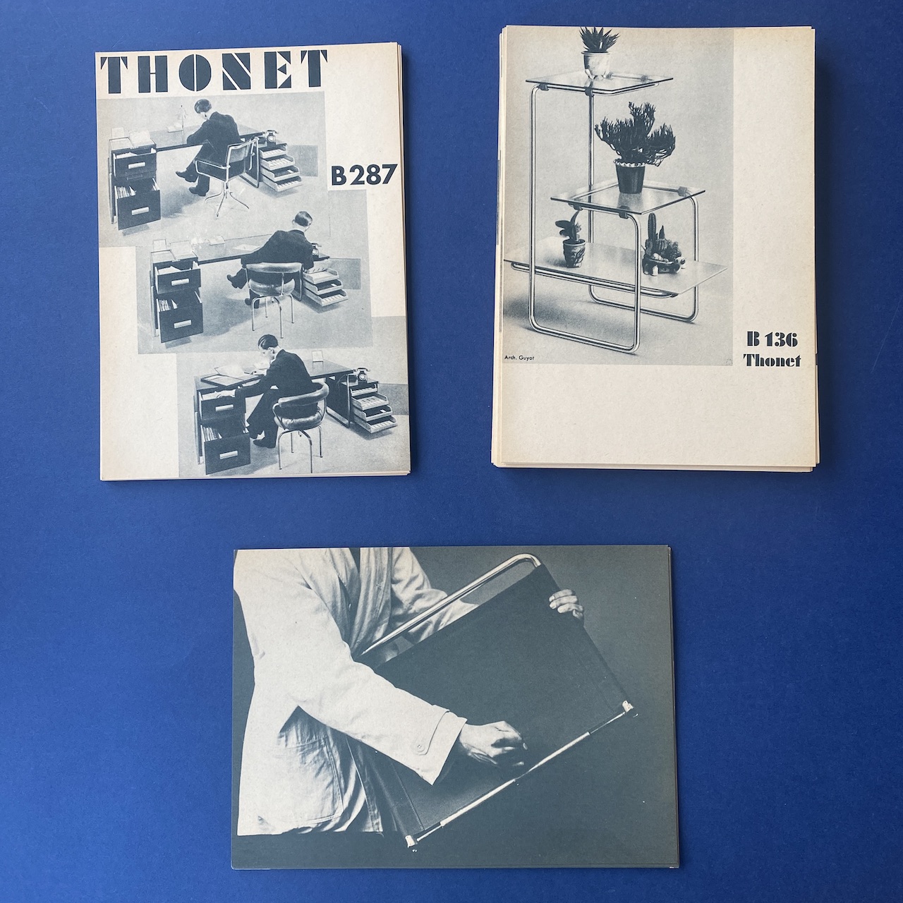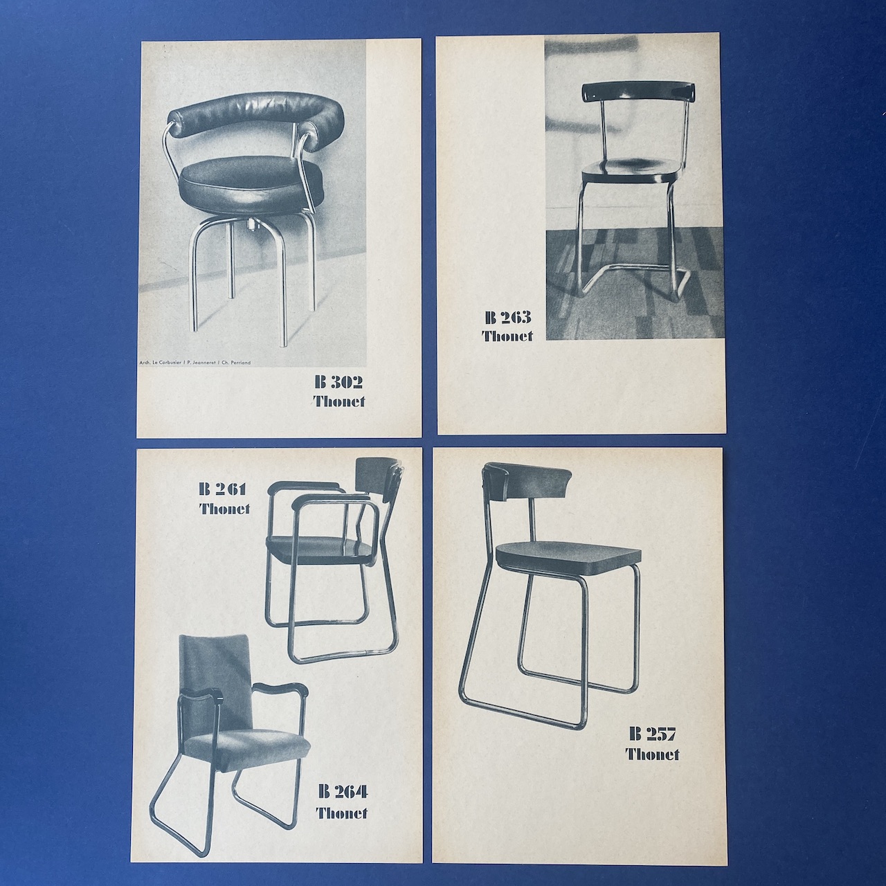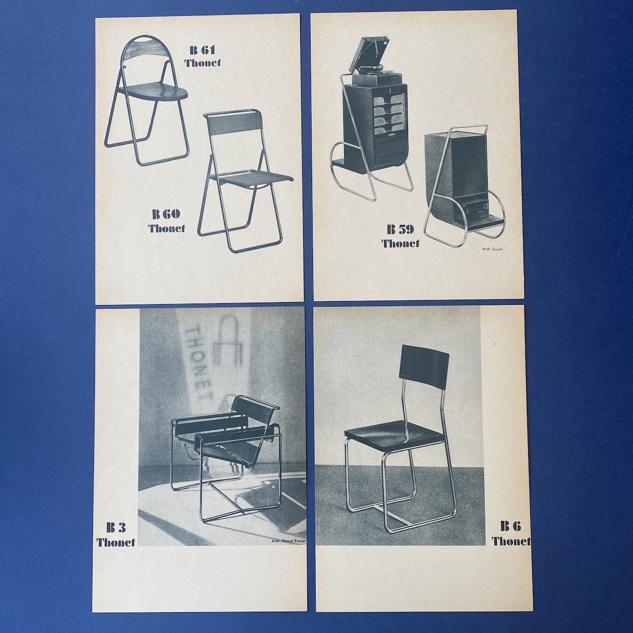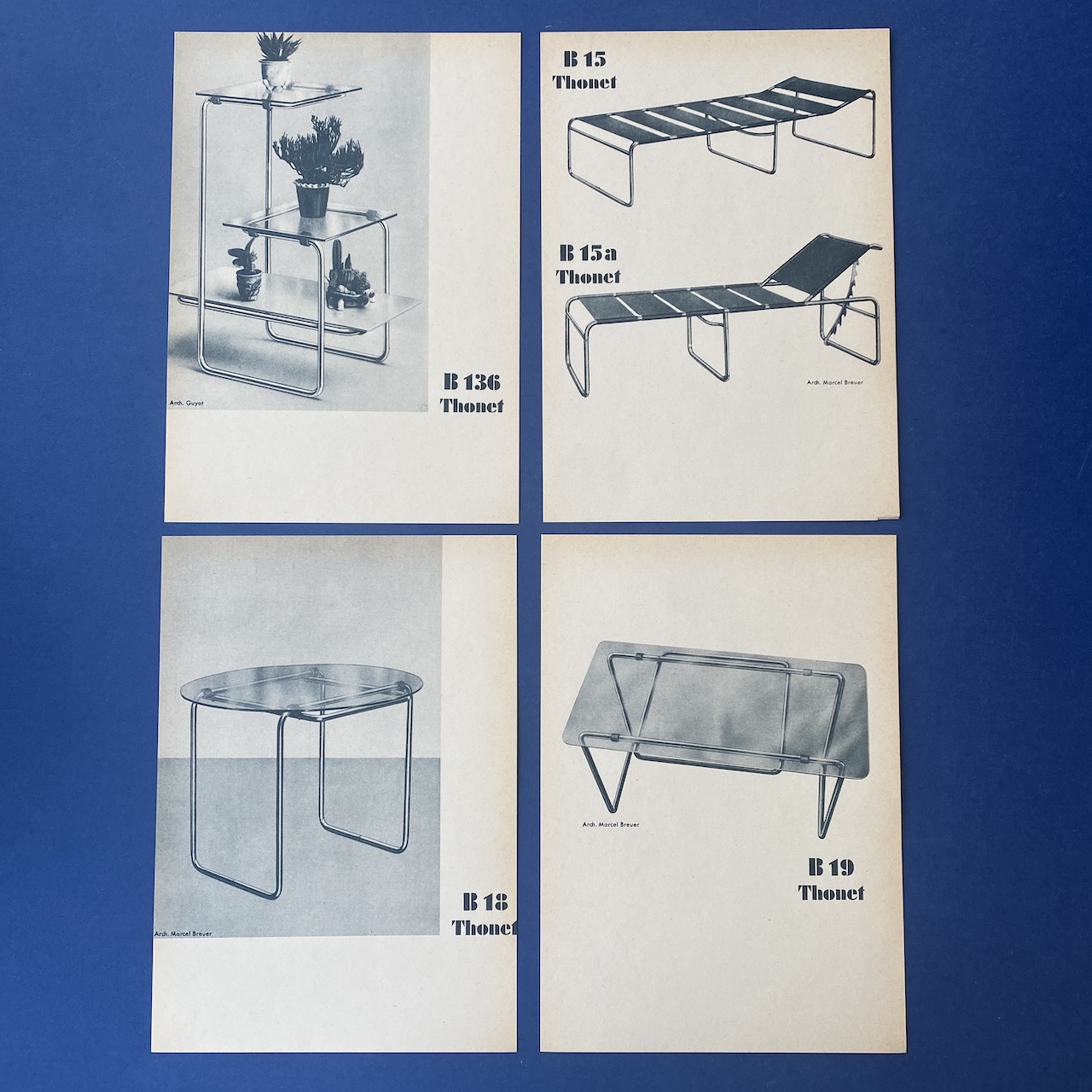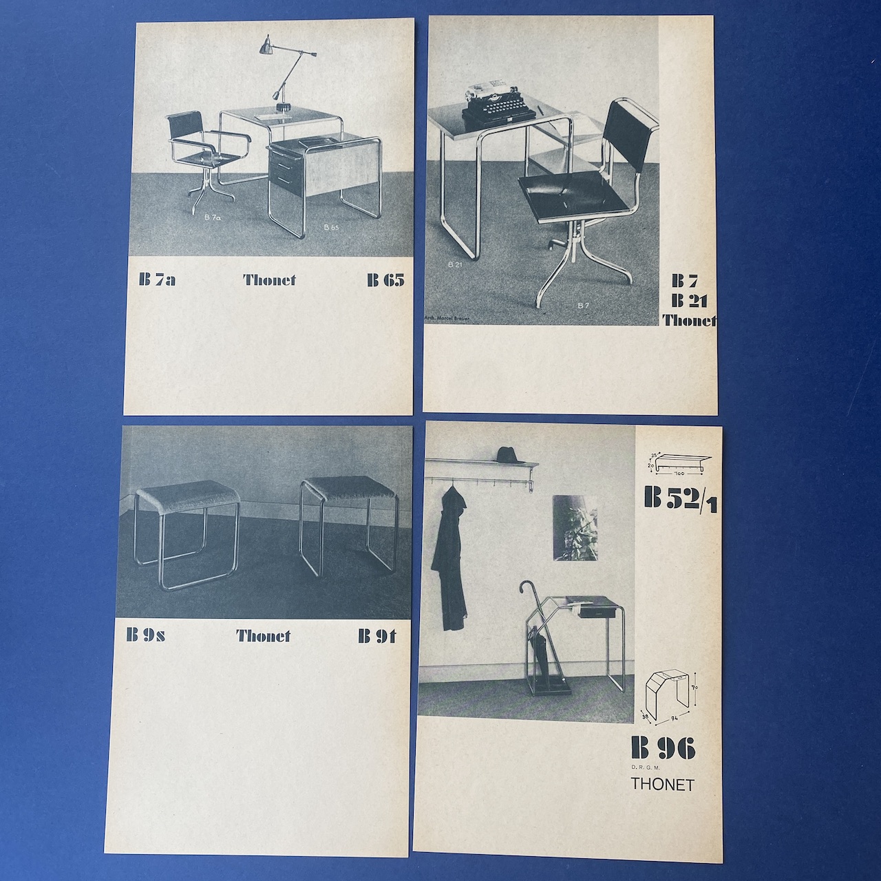 First complete collection of German and French models between 1930 and 1931 with an introduction of Dr. Ing. Habil. Sonja Günther. This catalogue contains 12 cards introduction by Dr. Sonja Günther, 62 illustrated cards showing the German and French production line of tubular steel furniture between 1930 and 1931, 1 card “Versions of Thonet Tubular Steel Furniture , Vienna”, 1 card ” instructions for the applications of Assembly and repair tools” and 8 illustrated cards demonstrating the application of assembly and repair tools.