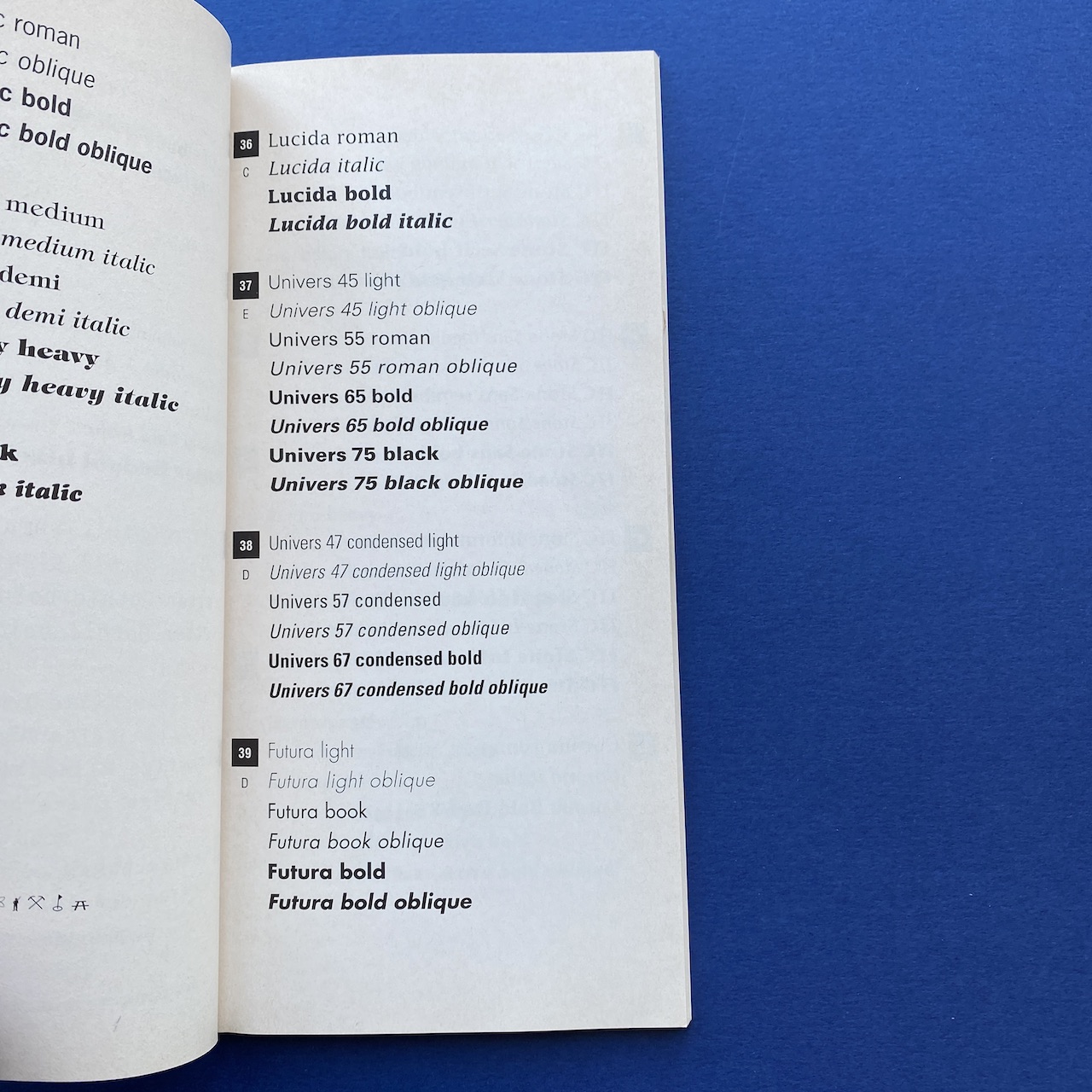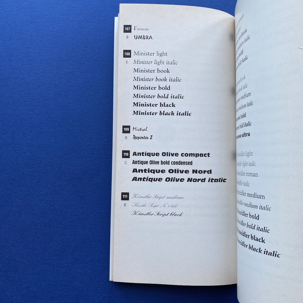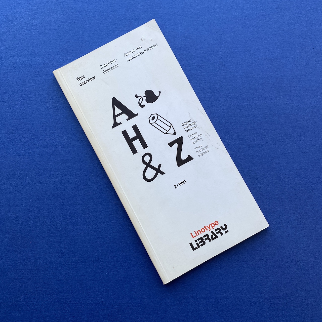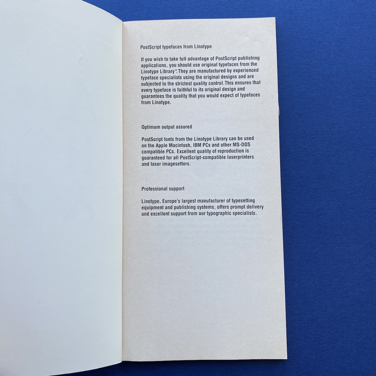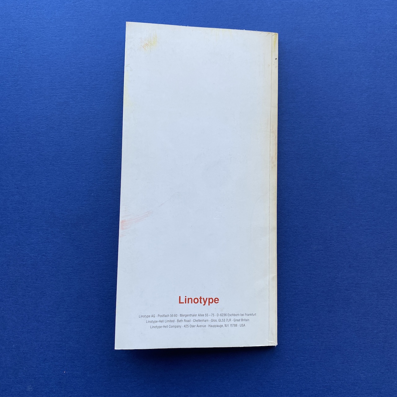Type overview, schriften-übersicht, Aperçu des caractères livrables, Linotype Library, Feb. 1991, Paris, 10,4 x 21 cm. Good condition, spine a bit yellowed.