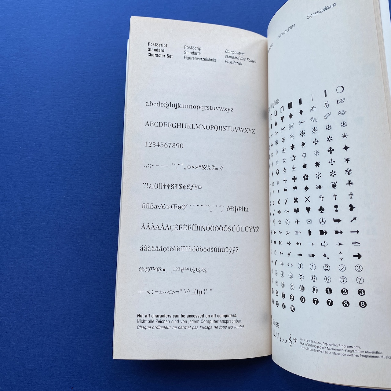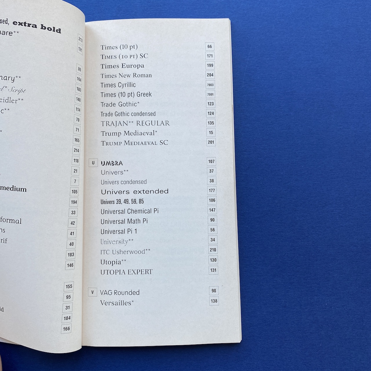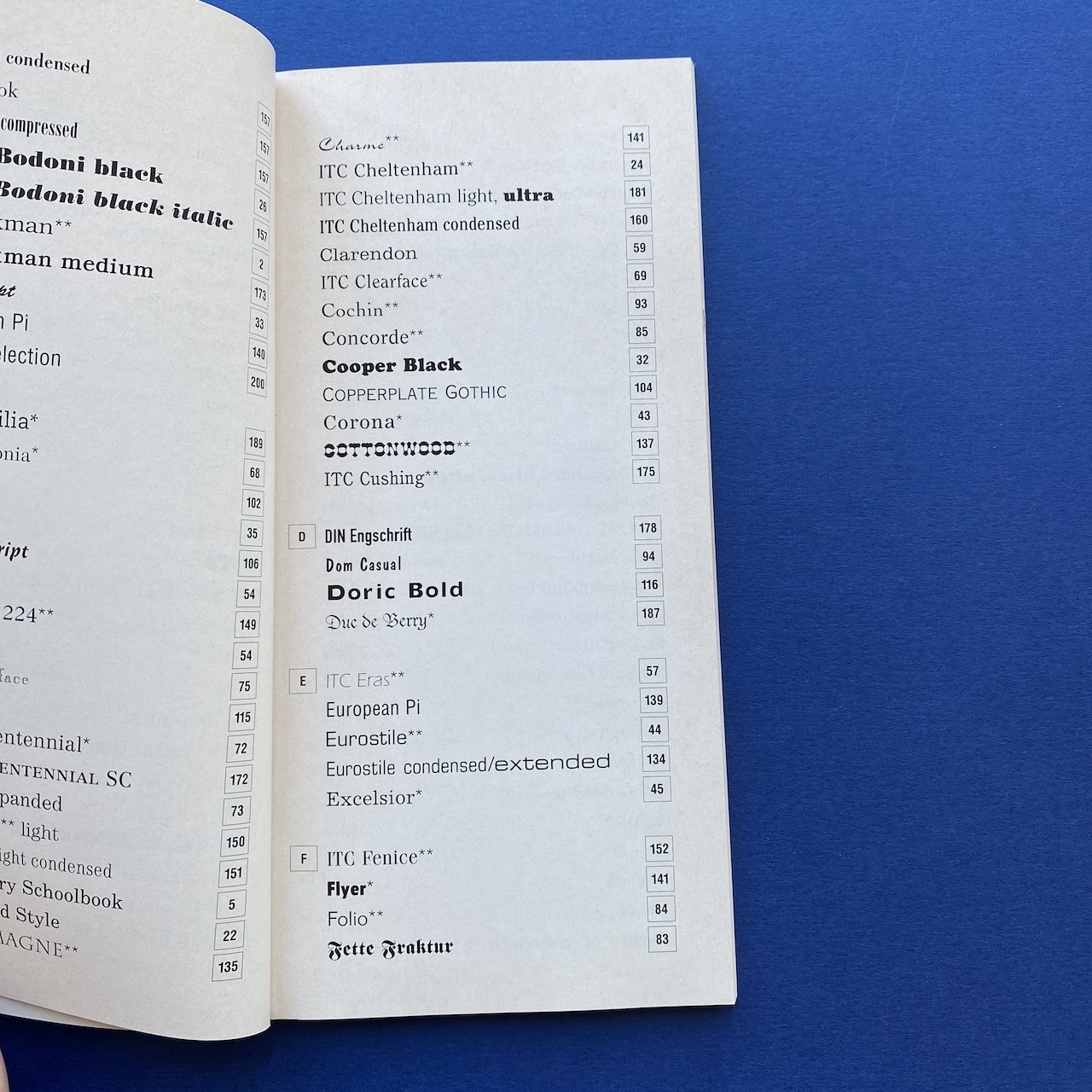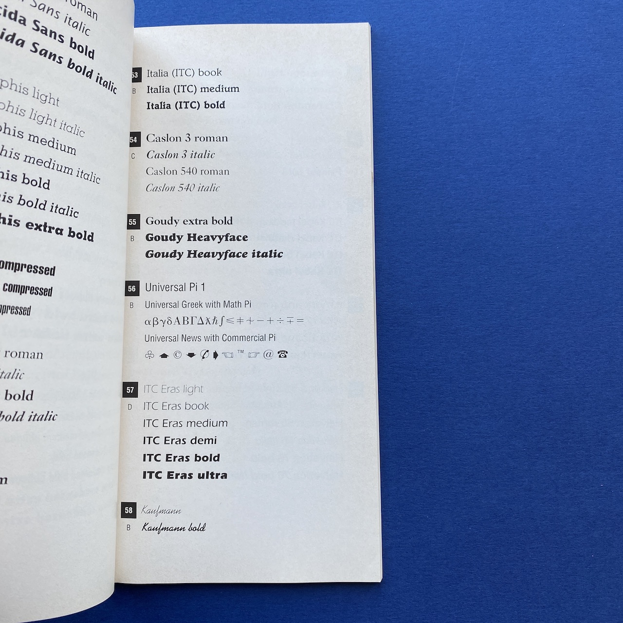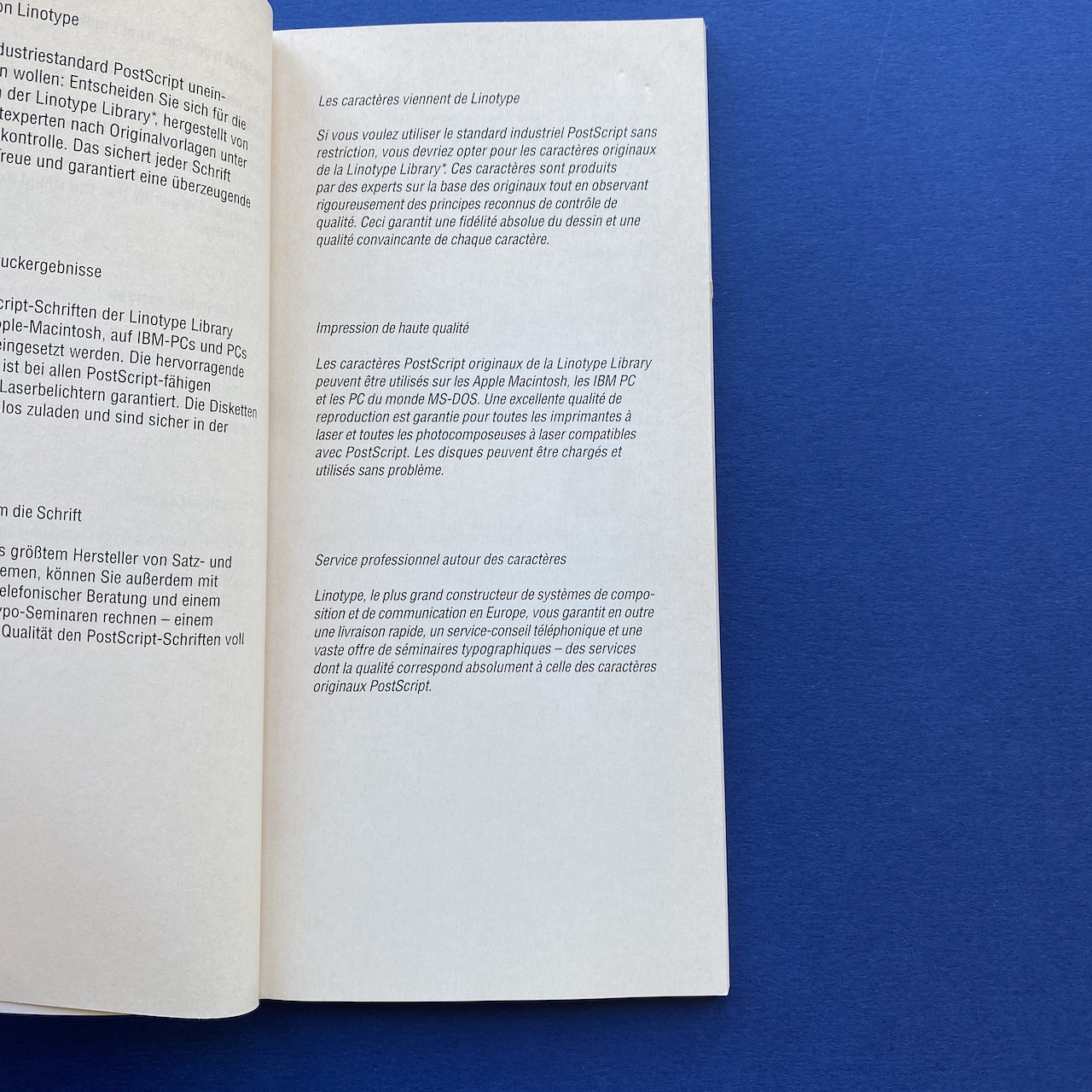 Type overview, schriften-übersicht, Aperçu des caractères livrables, Linotype Library, Feb. 1991, Paris, 10,4 x 21 cm. Good condition, spine a bit yellowed.