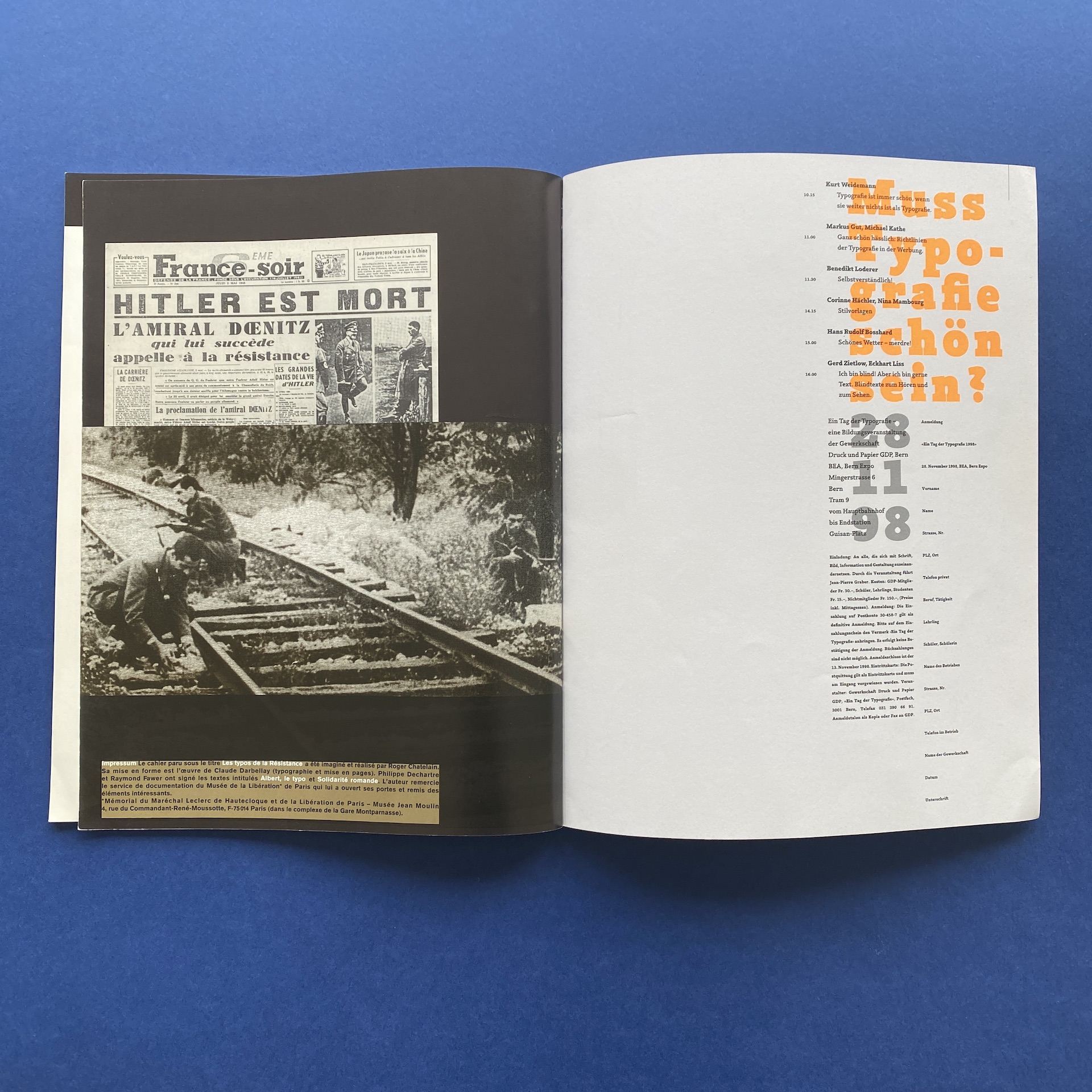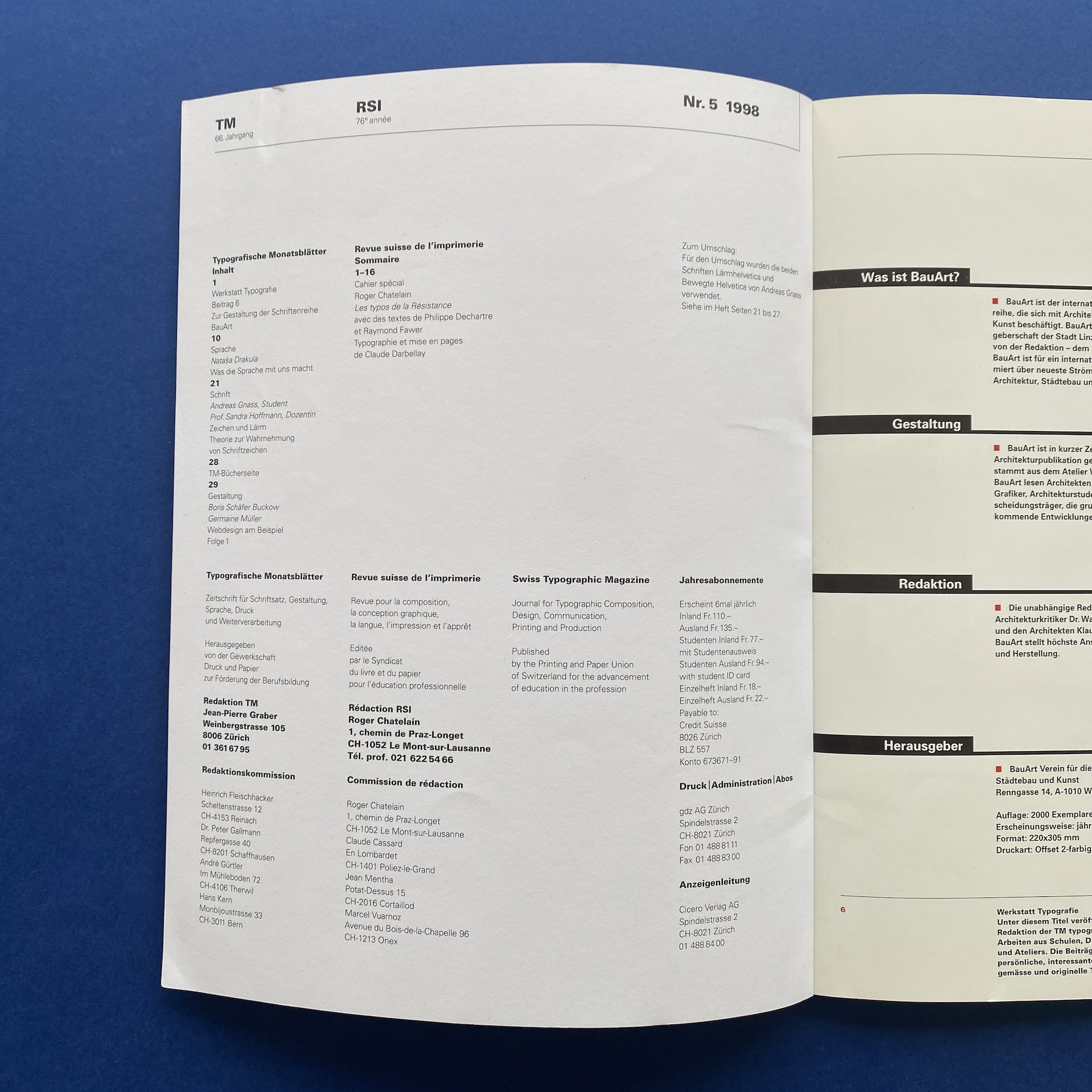 Typografische Monatsblätter n°5, Zürich, Printing and paper union of Switzerland for the advancement of education in the profession, 1998, 23 x 30 cm. Lang: Eng., Fre., & Ger. Copy in very good condition.