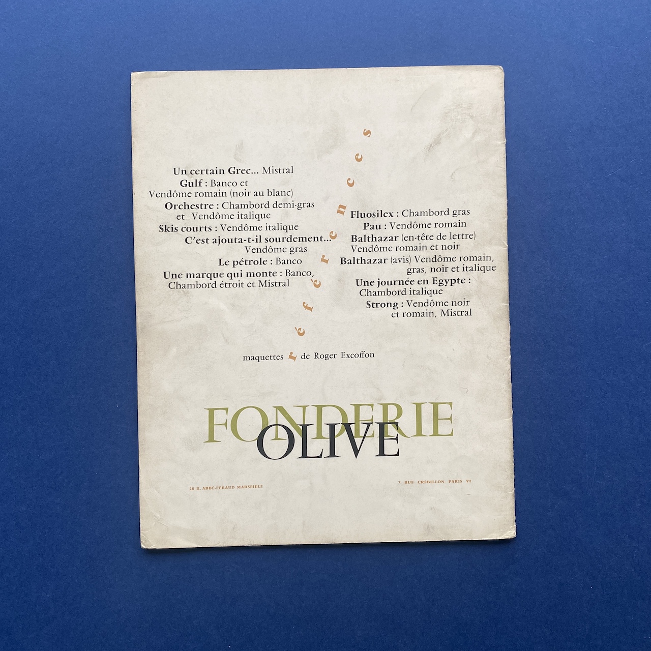 Vendôme, Chambord, Banco, Mistral, Paris-Marseille, Fonderie Olive, 1950s, 22 x 28 cm, 20 pp.