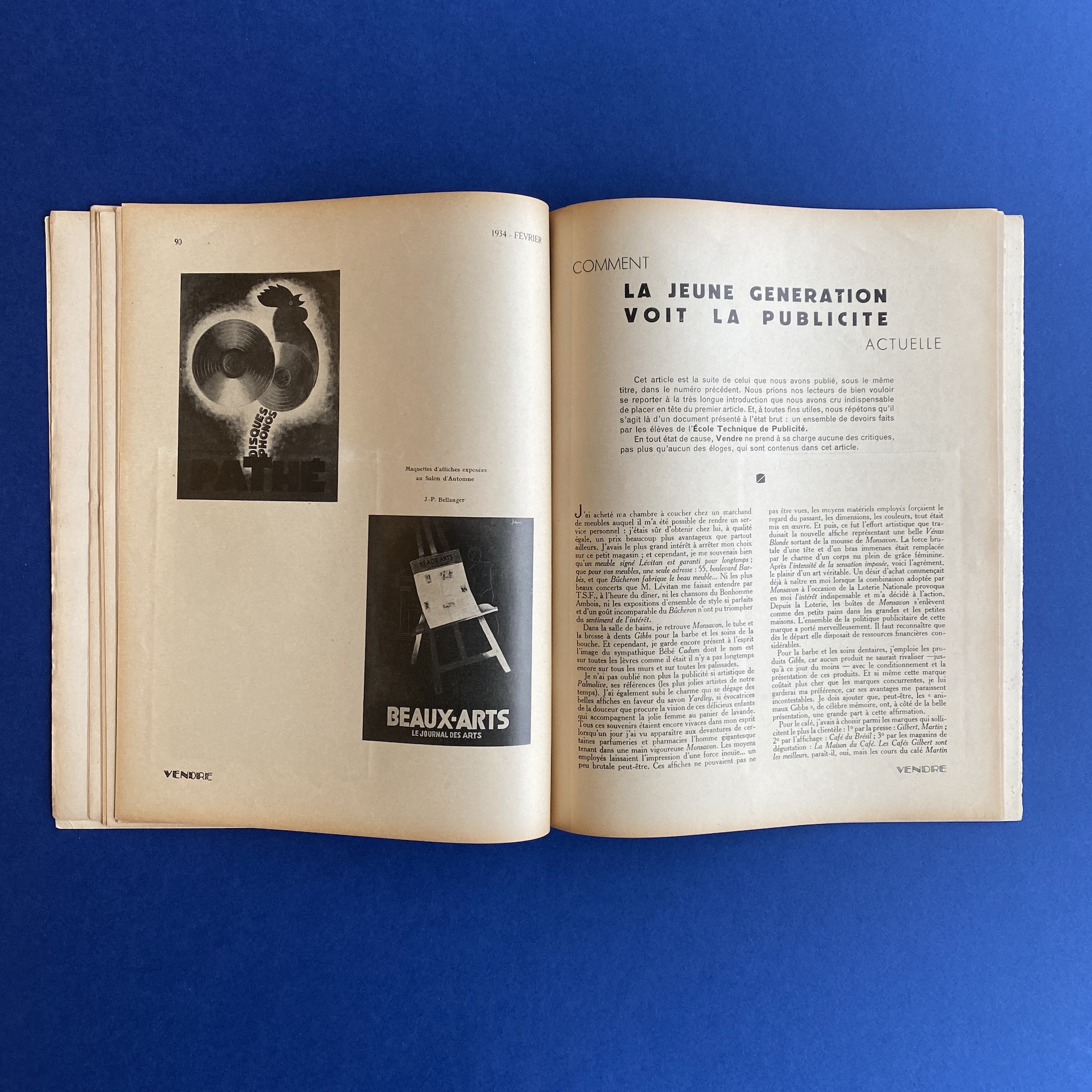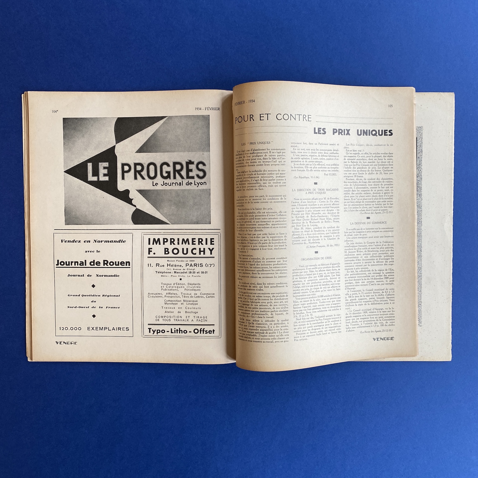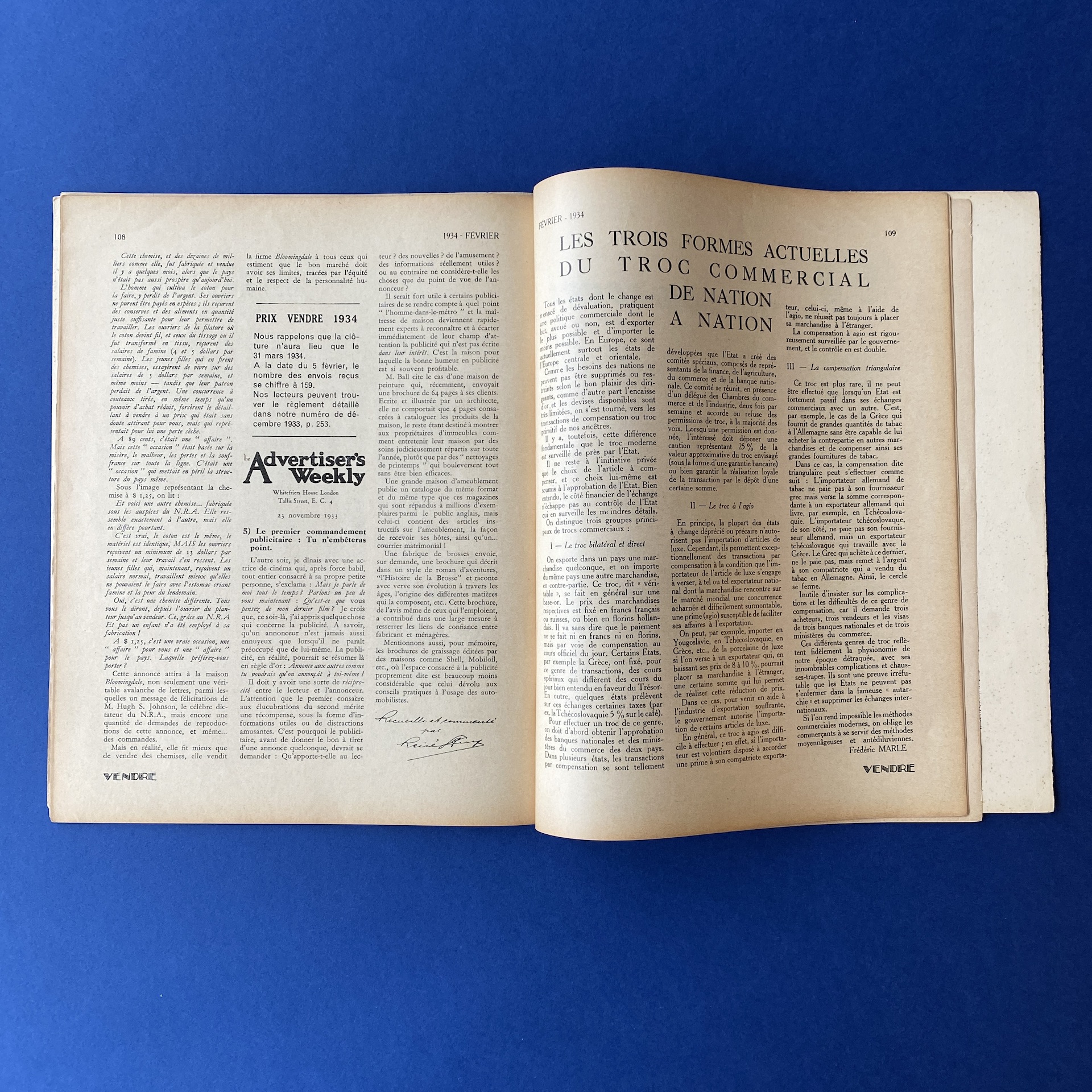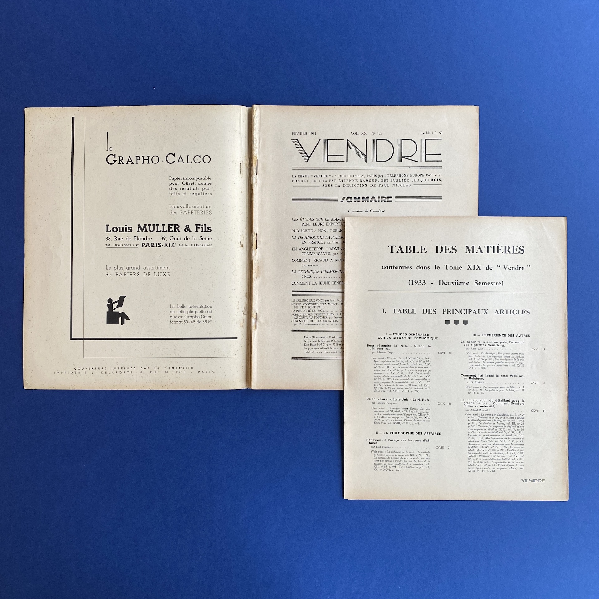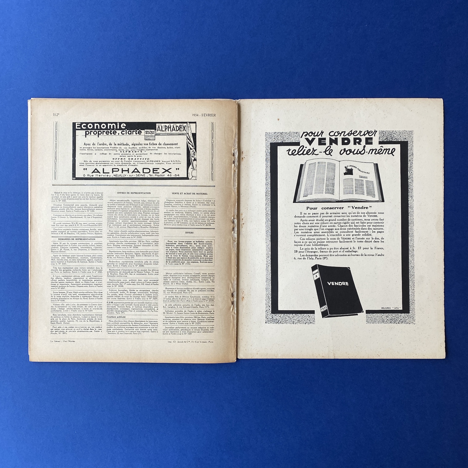 Vendre n°123, Saint-Ouen, Buttner-Thierry Imprimerie, Feb 1934, 23 x 29 cm. In French. Cover designed by Chas Boré. Copy and insert in good condition, binding is detached from the covers.